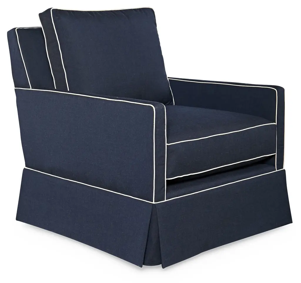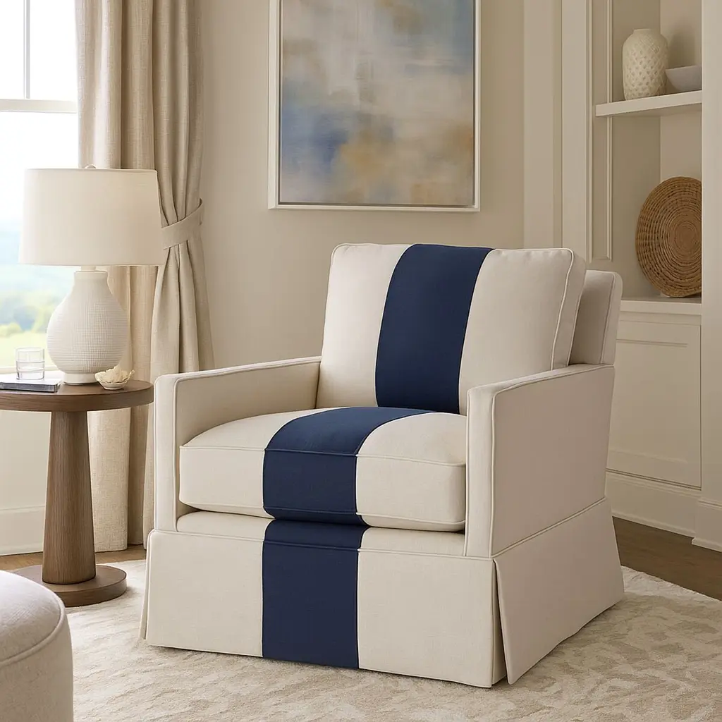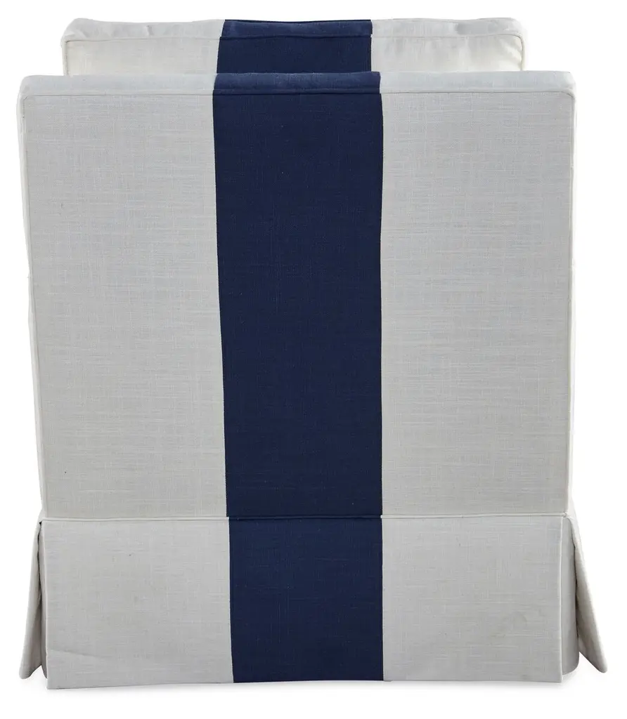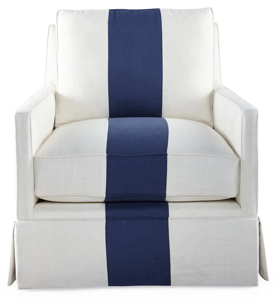 Elegant with a bold stripe and a pleated wrap-around skirt, this linen-blend club chair brings a clean, tailored feel to the room. A kiln-dried hardwood frame, eight-way hand-tied suspension system and foam enveloped in feather and down-proof ticking outfit the piece with lasting comfort and support. Handmade in the USA.