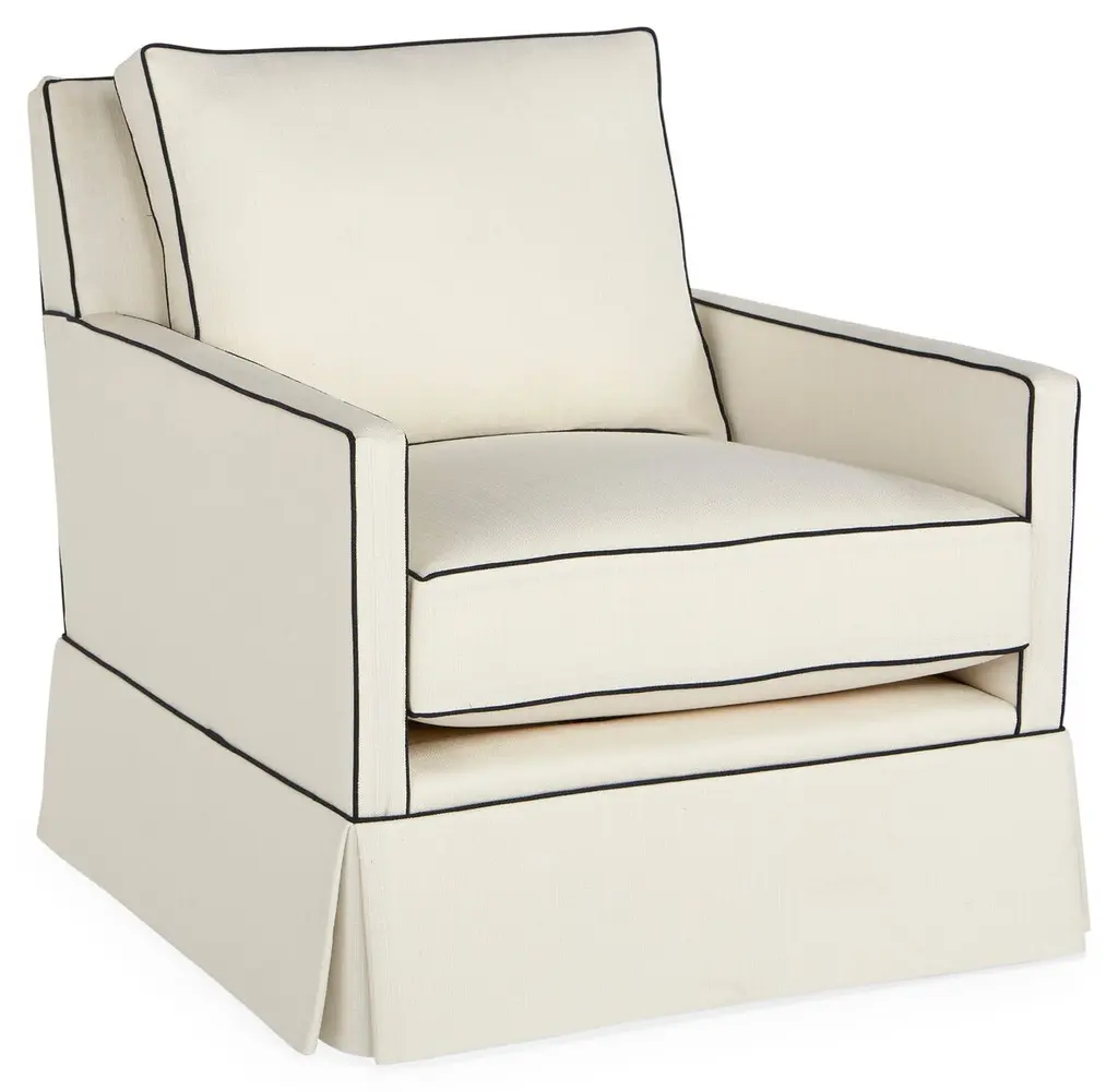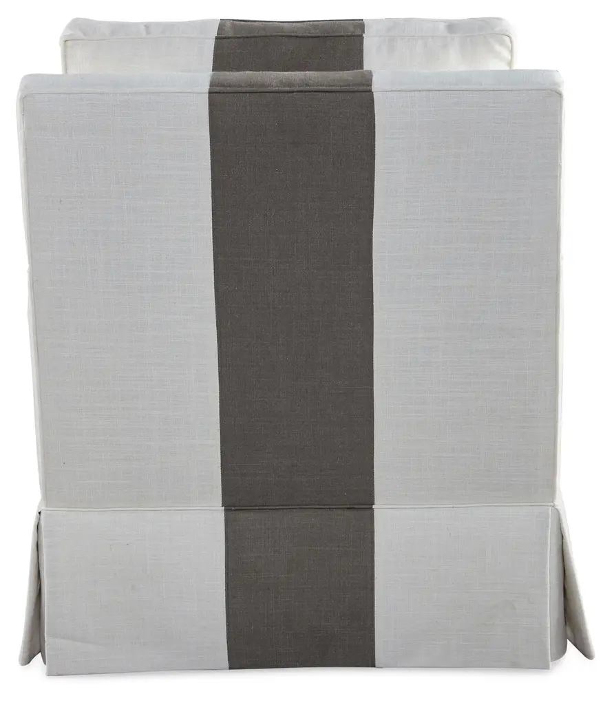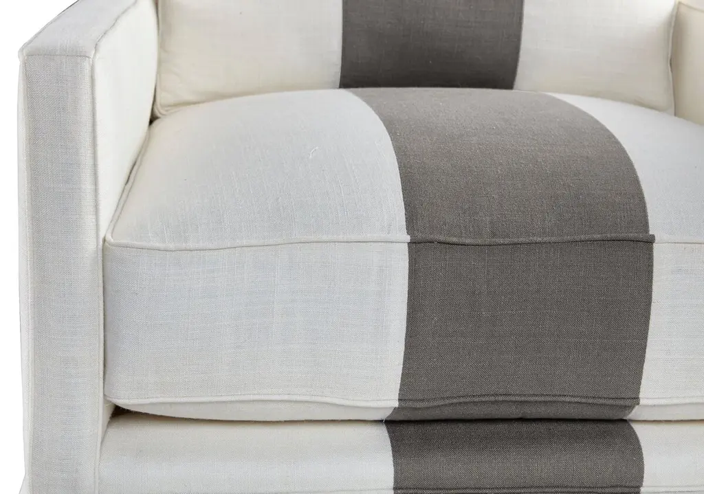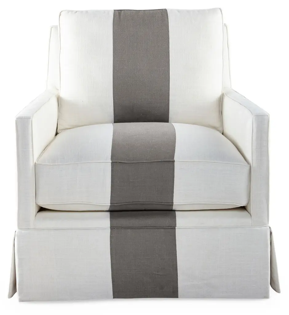Elegant with a bold stripe and a pleated wrap-around skirt, this linen-blend club chair brings a clean, tailored feel to the room. A kiln-dried hardwood frame, eight-way hand-tied suspension system and foam enveloped in feather and down-proof ticking outfit the piece with lasting comfort and support. Handmade in the USA.