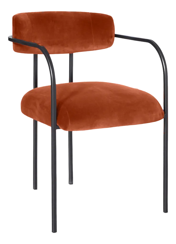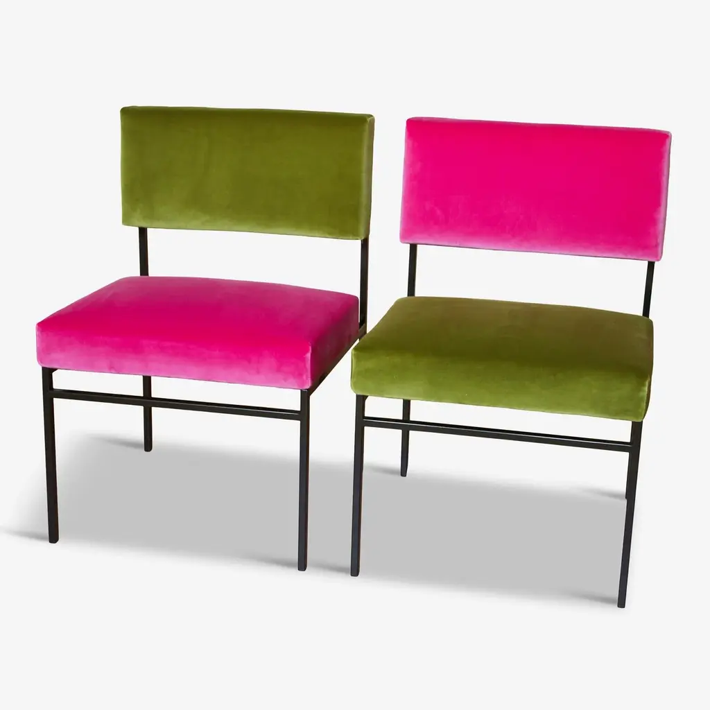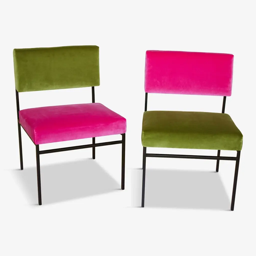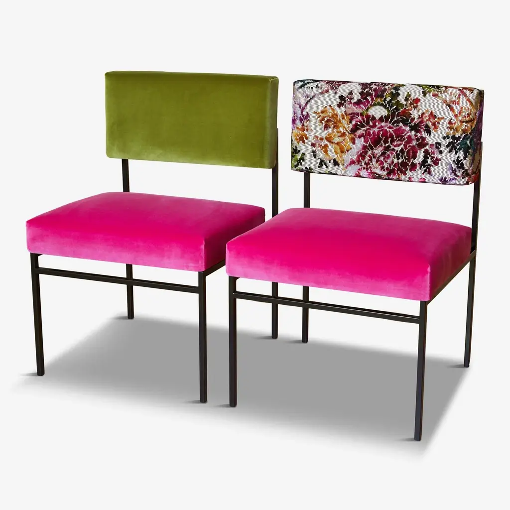 Utmost comfort for stylish dining. flaunting a streamlined and unadorned silhouette, this exclusive chair exemplifies utmost comfort in its 50s-inspired aesthetic. Both the seat and the open backrest are padded with natural latex, goose down, and fresh cotton, wholly covered in a selection of exceptional upholsteries featuring glamorous patterns. This version boasts a jacquard silk backrest with a 100% cotton velvet in pine green colour. A bestseller chair among restaurant owners, this piece is 100% natural and plastic-free. materials all materials used for the construction are 100% natural and biodegradable. internal frame: solid dried beech wood, jute belts with steel springs. padding: 100% natural latex, pressed cotton. finishing: choice of 100% natural fabrics, removable covers with zipper or button systems, steel and cotton zippers, brushed iron frame. production entirely handmade in our workshops in northern italy. Labeled by maker