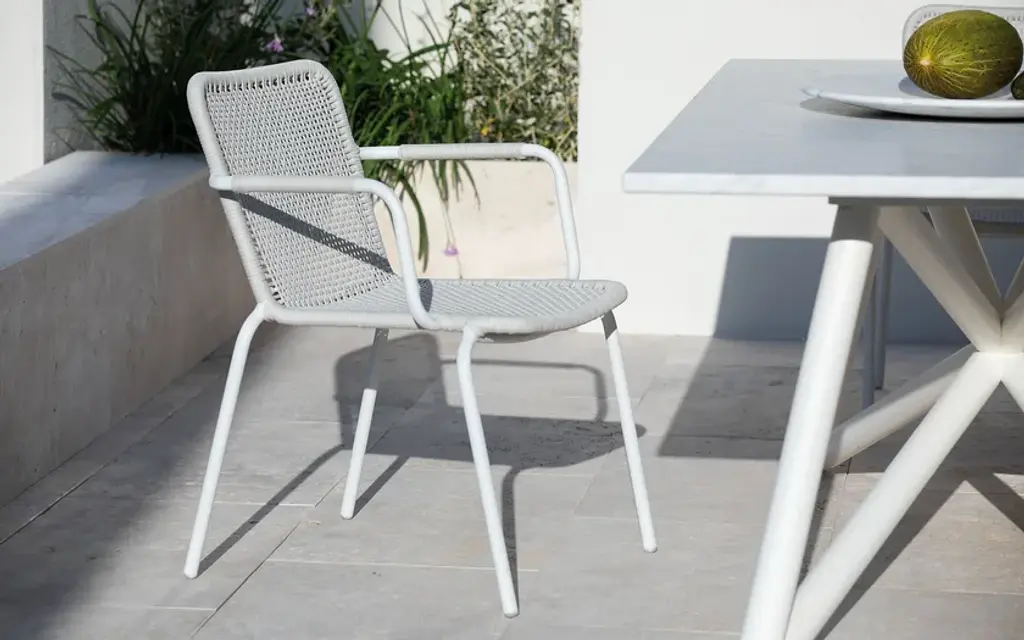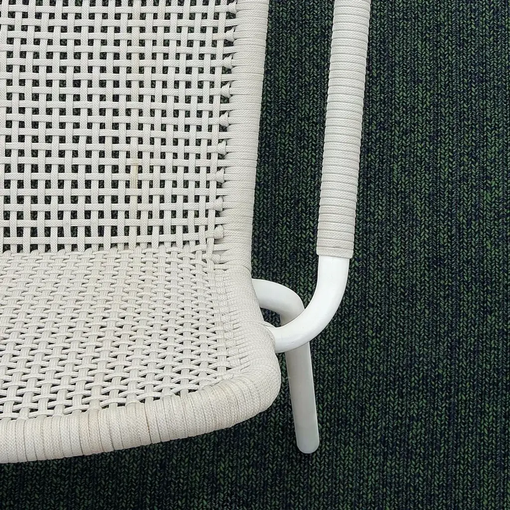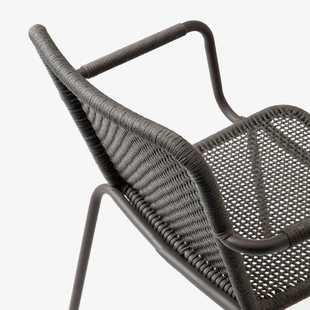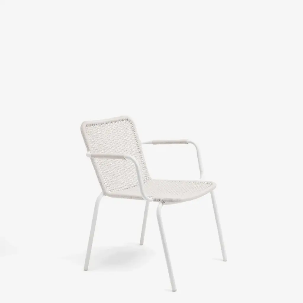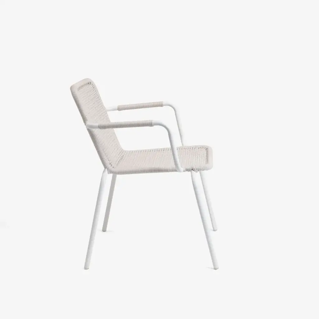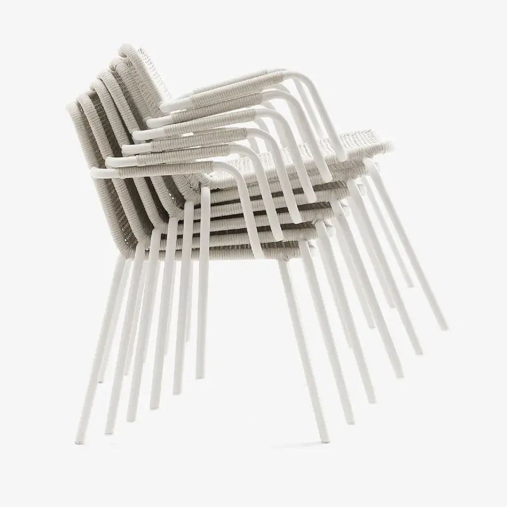 Aurora features a basic and contemporary design with a subtle touch of vintage, making it a perfect match for tables with natural stone tops. Crafted from outdoor-grade aluminum with thermosetting powder coating, it is available in two colors, white and brown, coordinated with Veltha table bases. It is stackable and features interwoven backrest and seat made of high-tenacity synthetic polypropylene filling, ensuring maximum comfort and durability.Stackable aluminum chair with armrests, covered in special polypropylene ropes designed for outdoor spaces, handwoven.