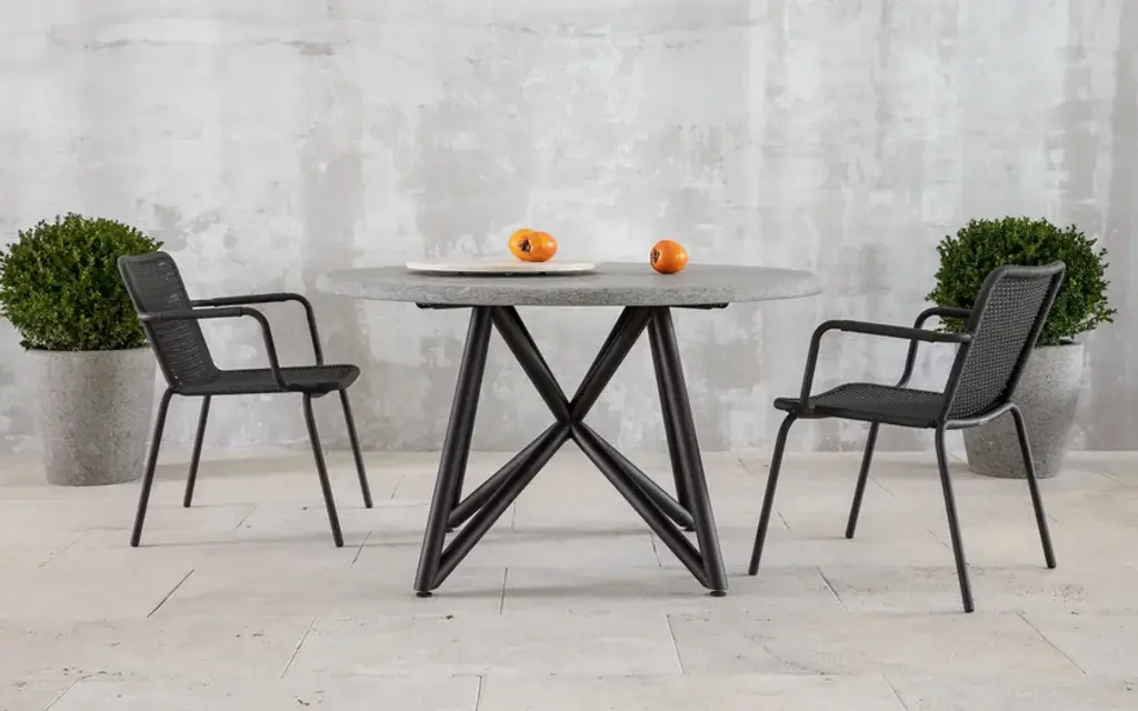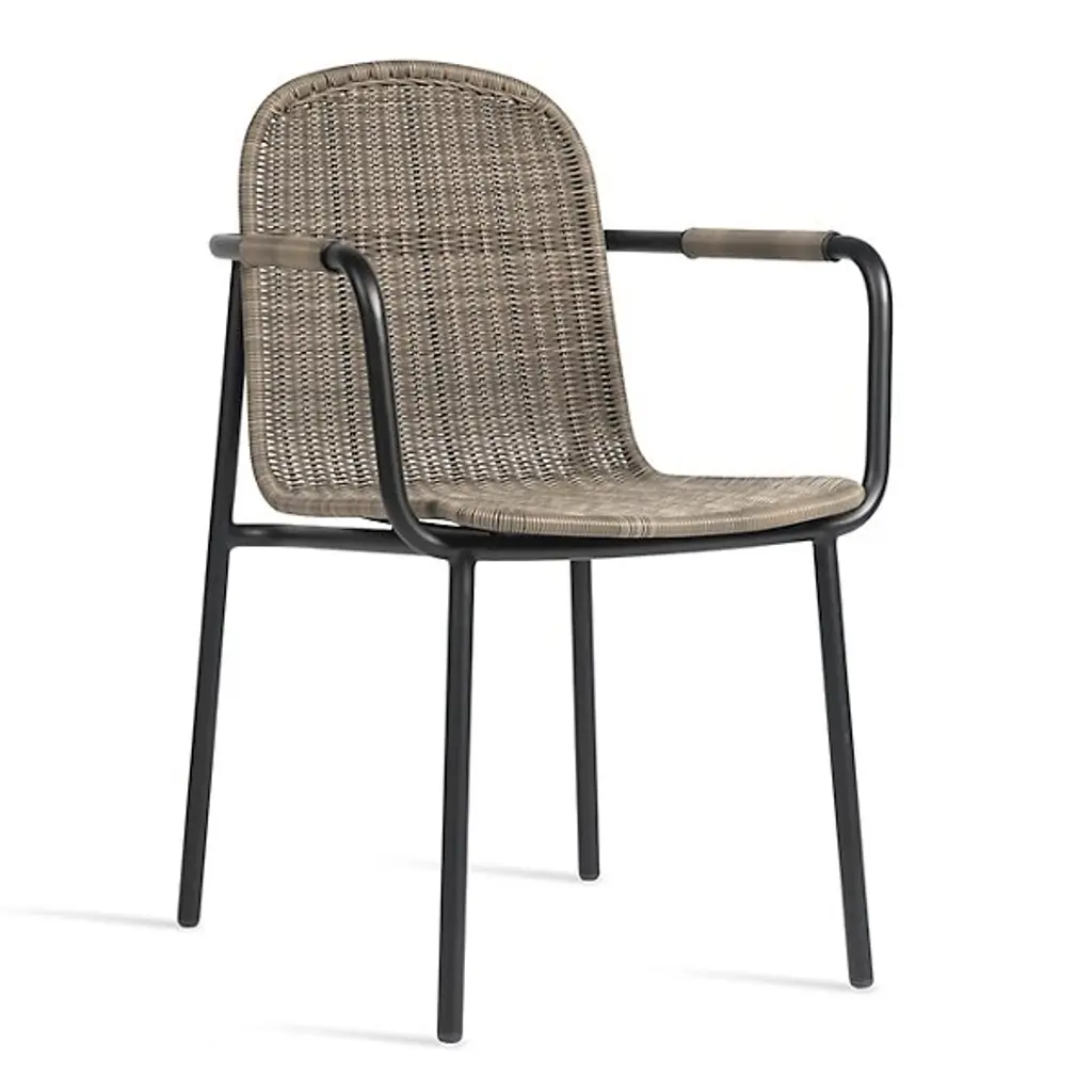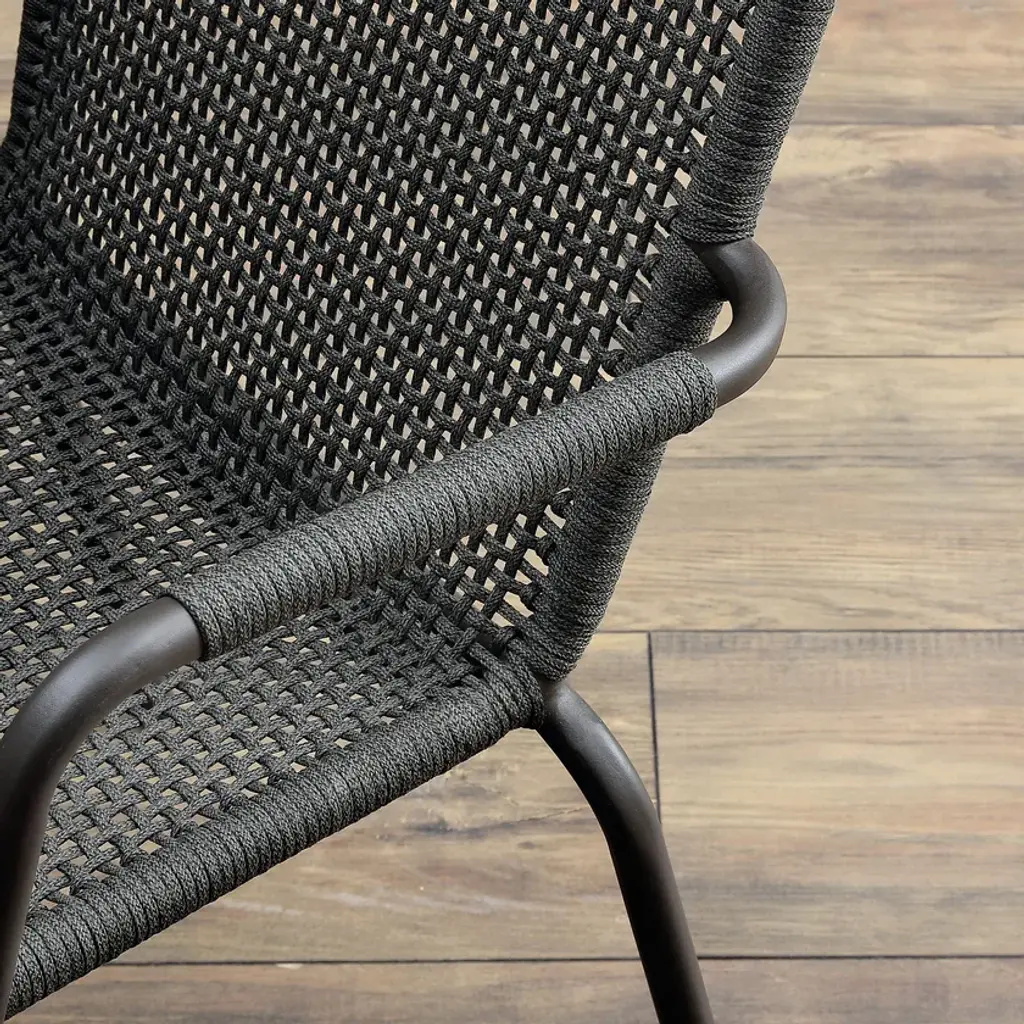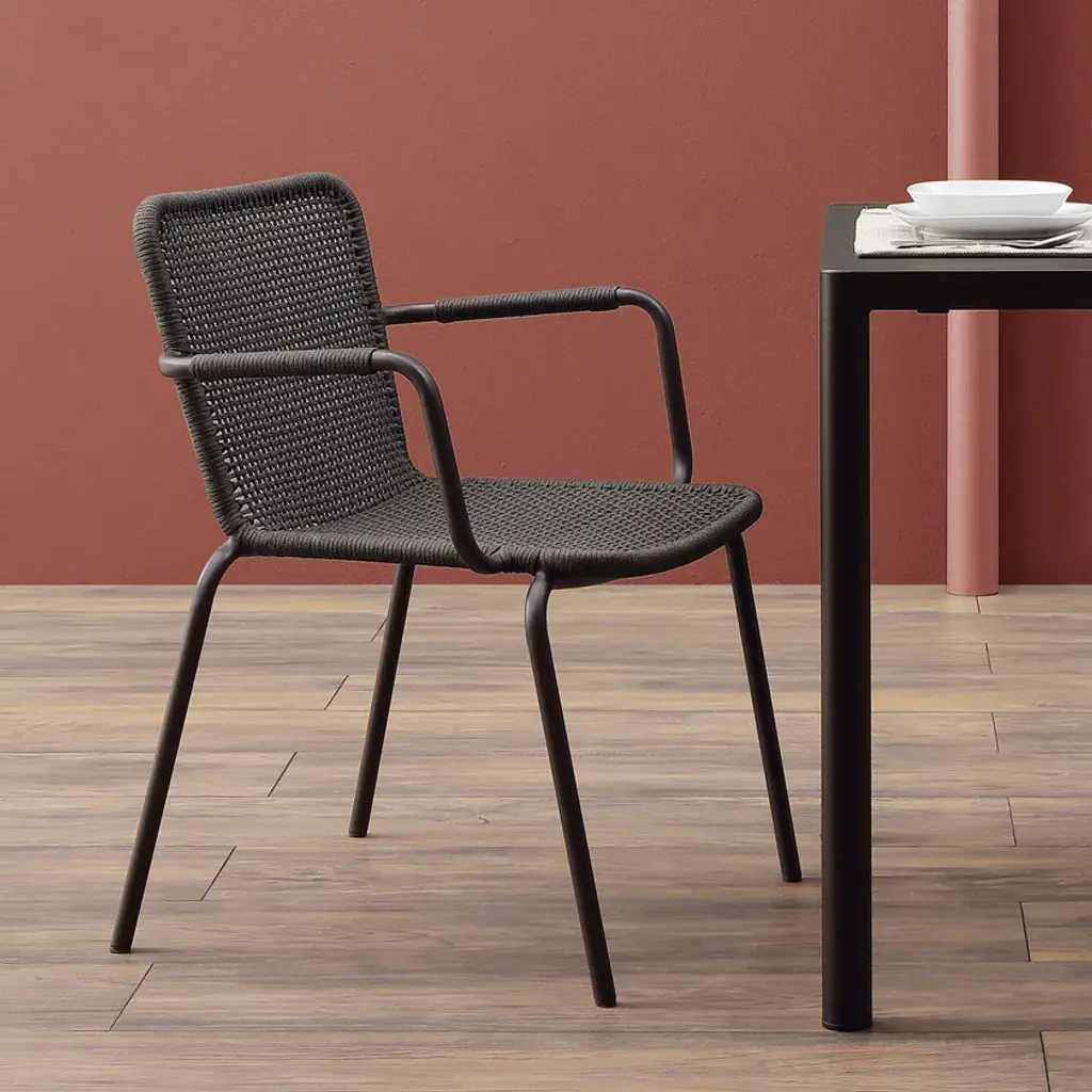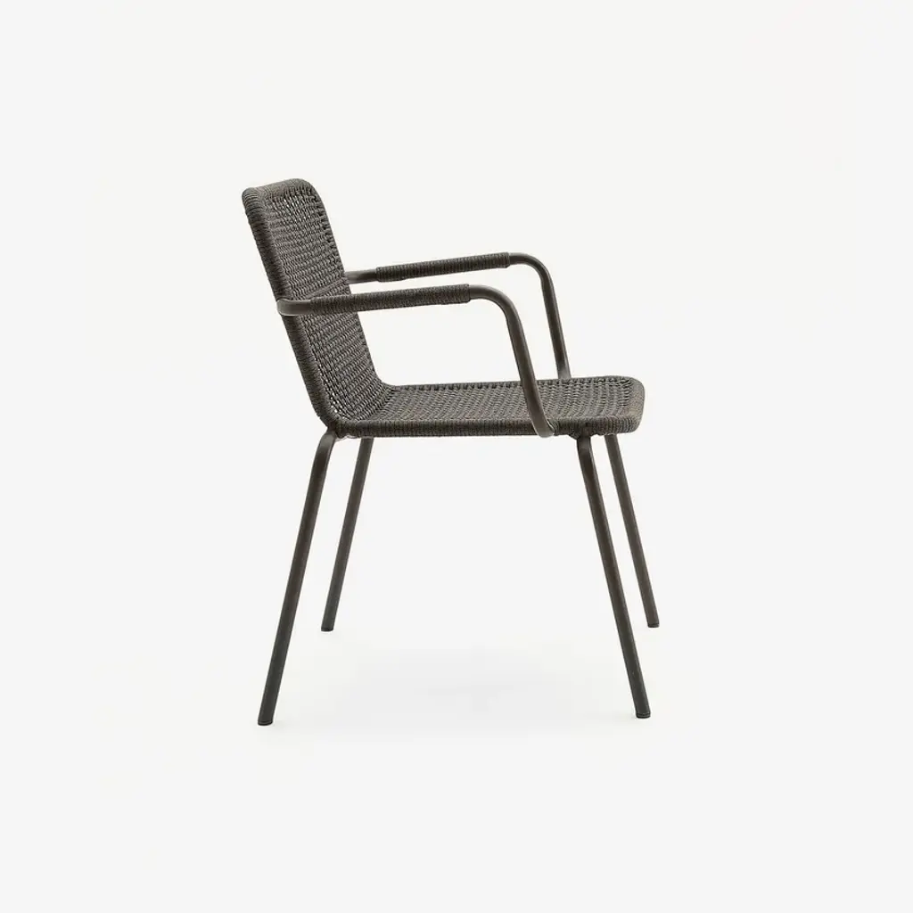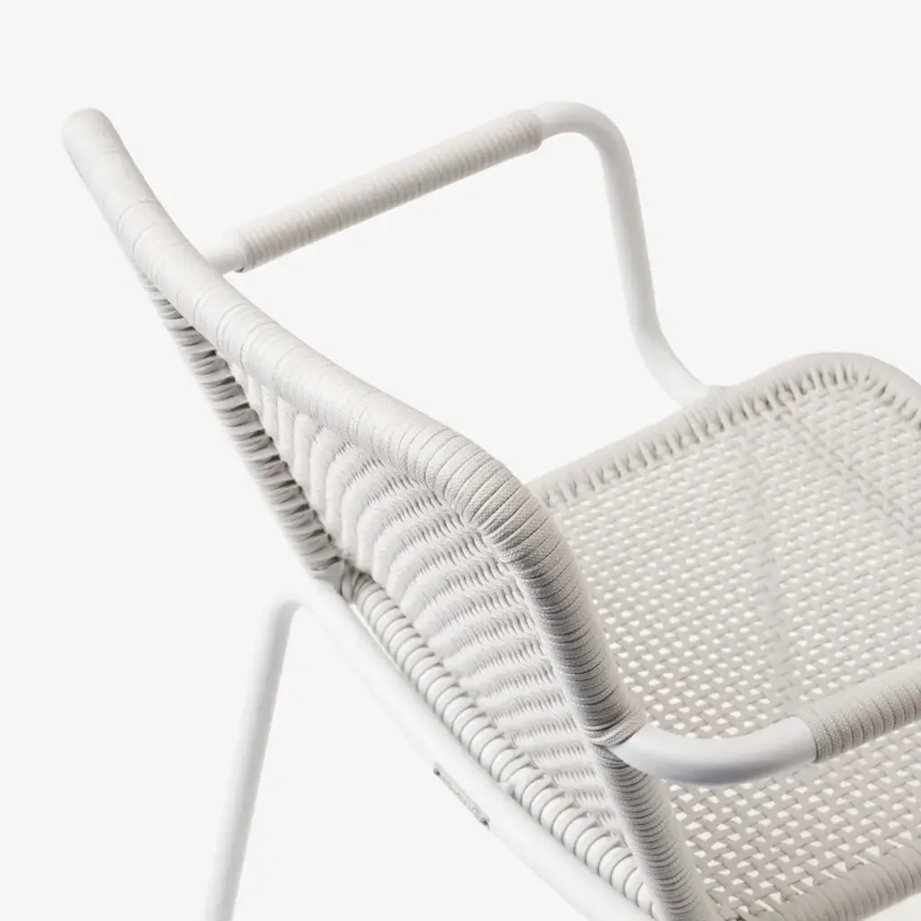 Aurora features a basic and contemporary design with a subtle touch of vintage, making it a perfect match for tables with natural stone tops. Crafted from outdoor-grade aluminum with thermosetting powder coating, it is available in two colors, white and brown, coordinated with Veltha table bases. It is stackable and features interwoven backrest and seat made of high-tenacity synthetic polypropylene filling, ensuring maximum comfort and durability.Stackable aluminum chair with armrests, covered in special polypropylene ropes designed for outdoor spaces, handwoven.