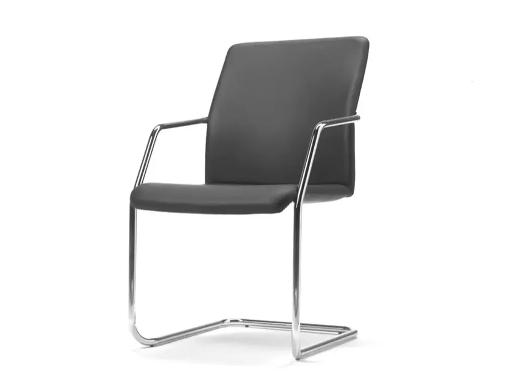 Avia 4050 - Cantilever upholstered leather reception chair.Avia - Armchairs with upholstered seat, back in metal with integrated elastic lumbar support fully upholstered.Back available in 2 heights.Structure fitting seat/back/arms in cast aluminum.Sled of 4 legs metal base with or without arms.Ideal for: conference rooms, meeting tables, guest office front desk.Optional: polished stainless steel armrests, polished back support, chrome base. Avia is studied for longtime seating giving a constant circulation of the bloodstream during use.