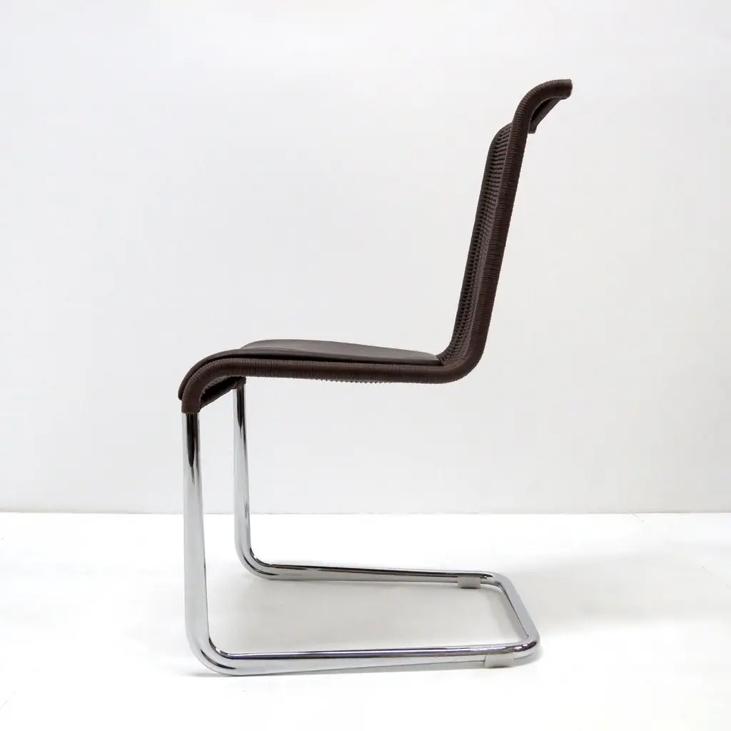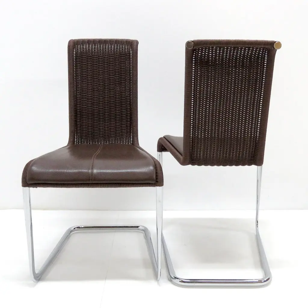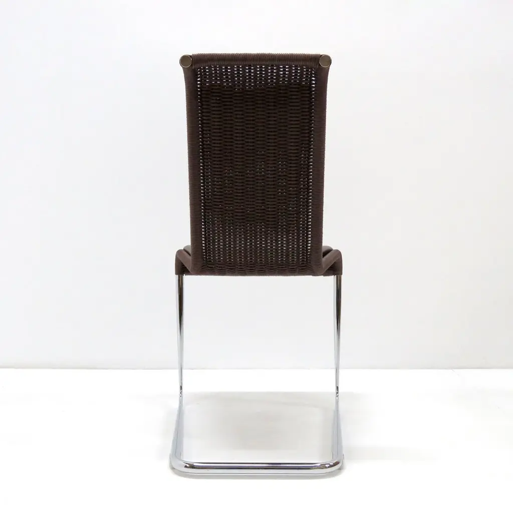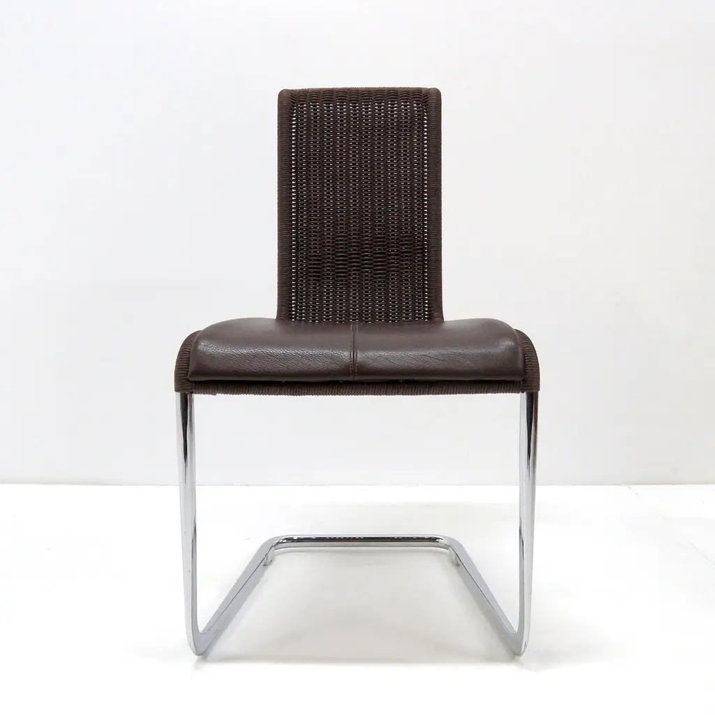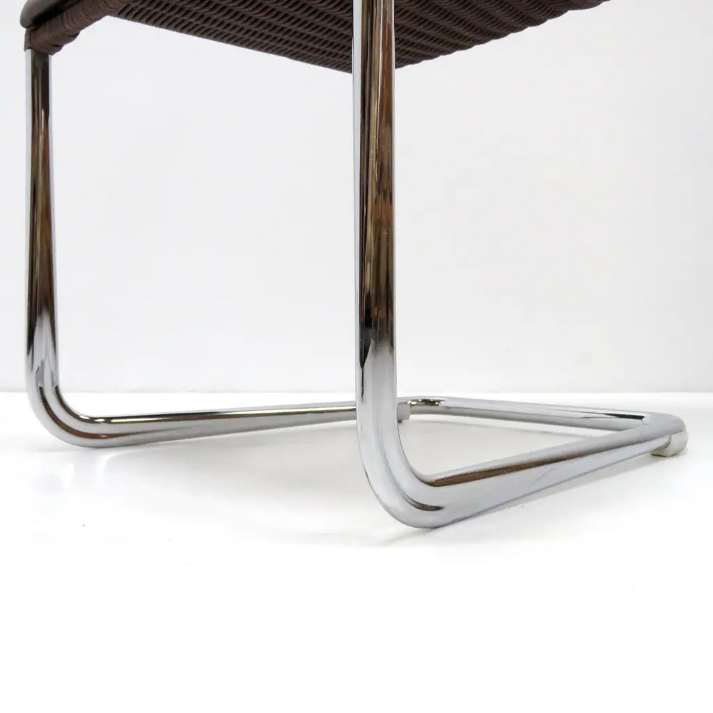 Wonderful high back cantilever chairs B45 by Axel Brüchhauser for Tecta, 1981 in dark brown wickerwork and detachable brown leather seating pads on a 'tube aplati' chrome plated steel frame. 'Tube aplati' is a steel tube flattening technique that was first used by Jean Prouve, marked. Priced individually.