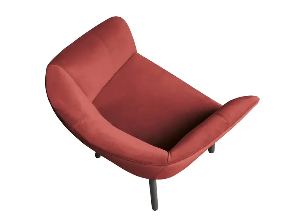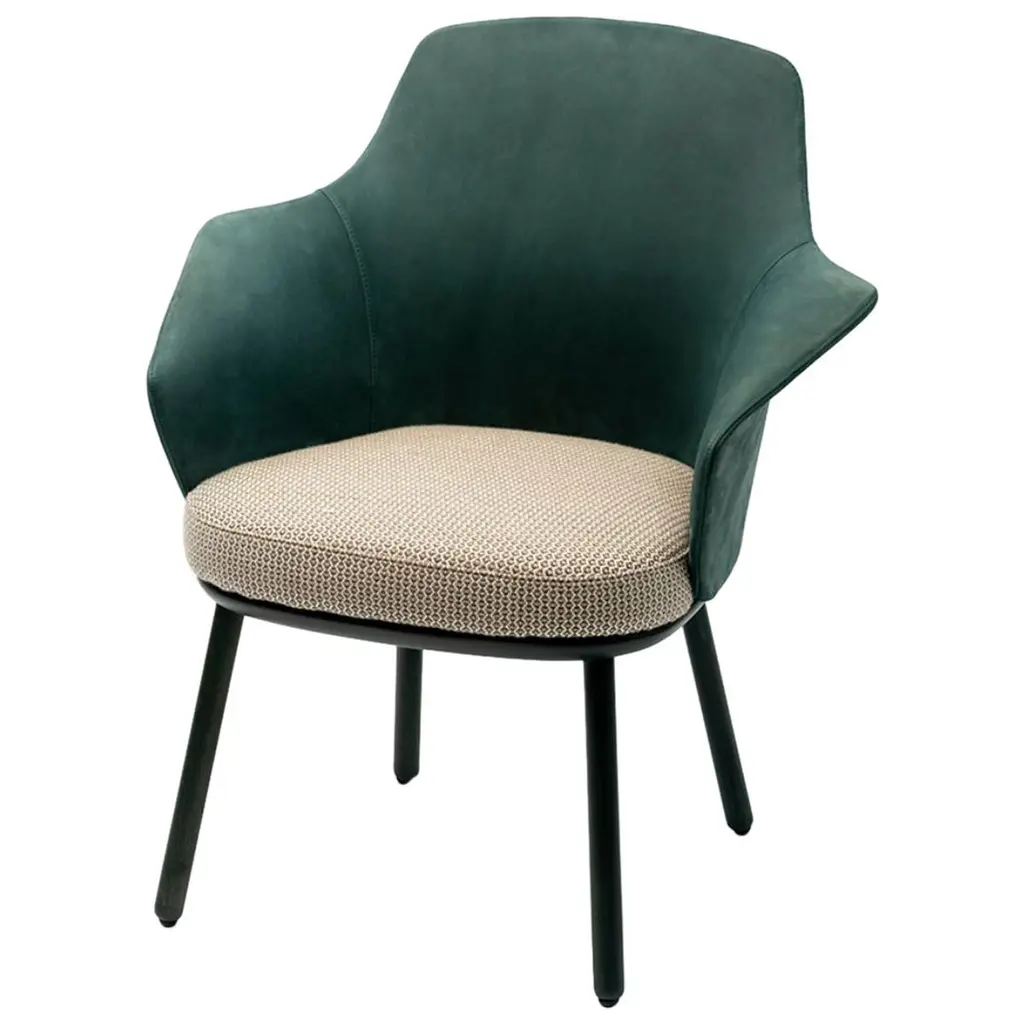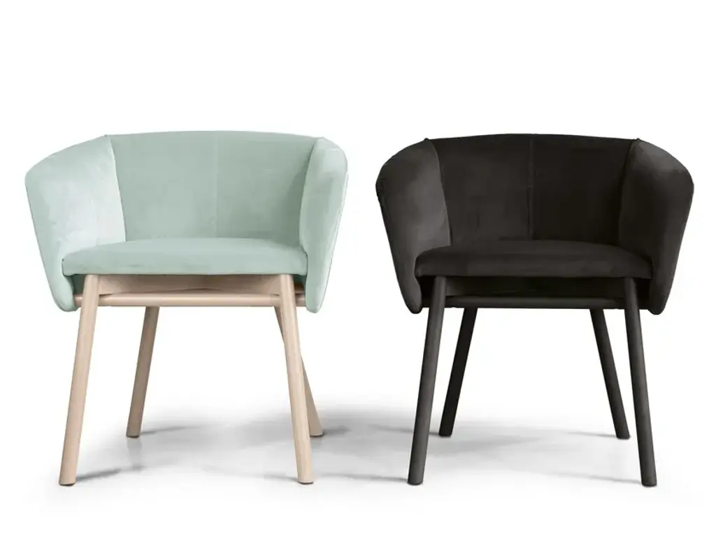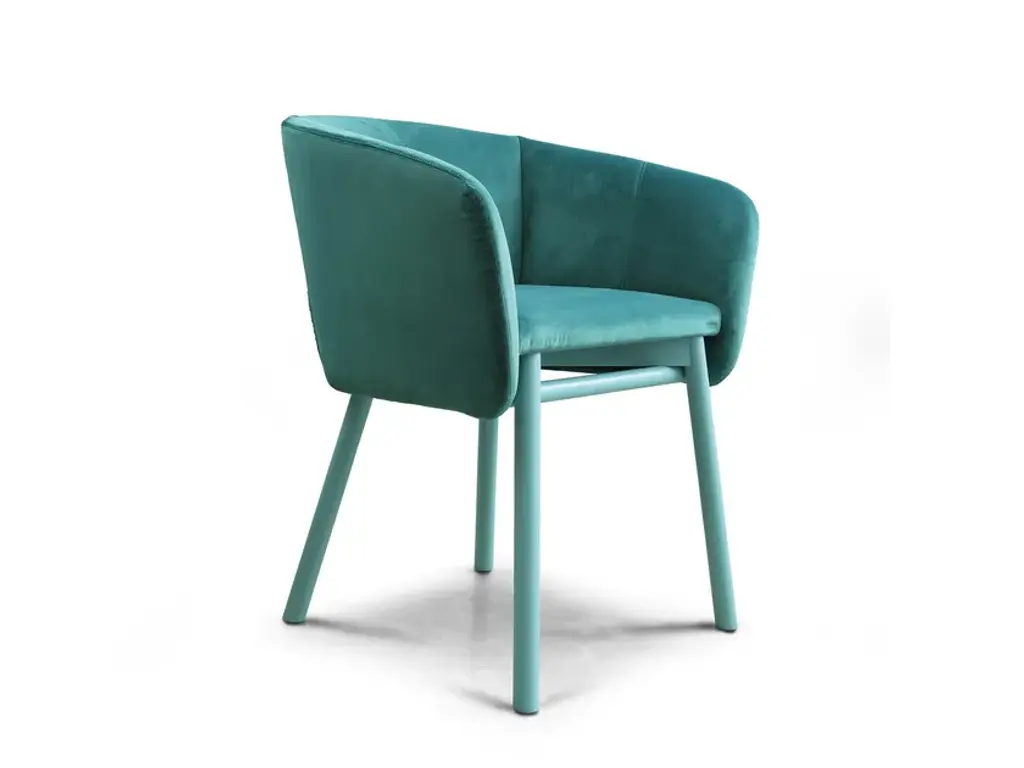 Upholstered fabric or leather chair with armrests and wooden (beech) or painted metal base from the BALÙ collection, designed by Emilio Nanni.