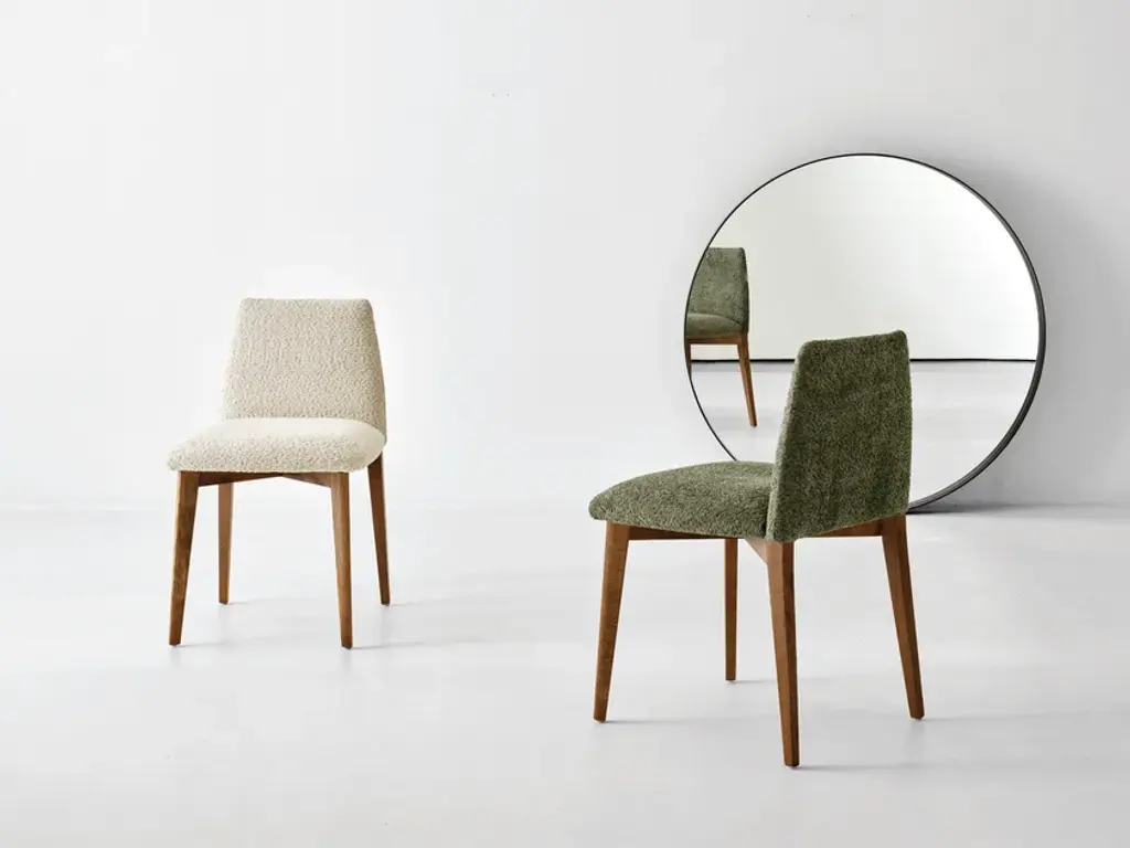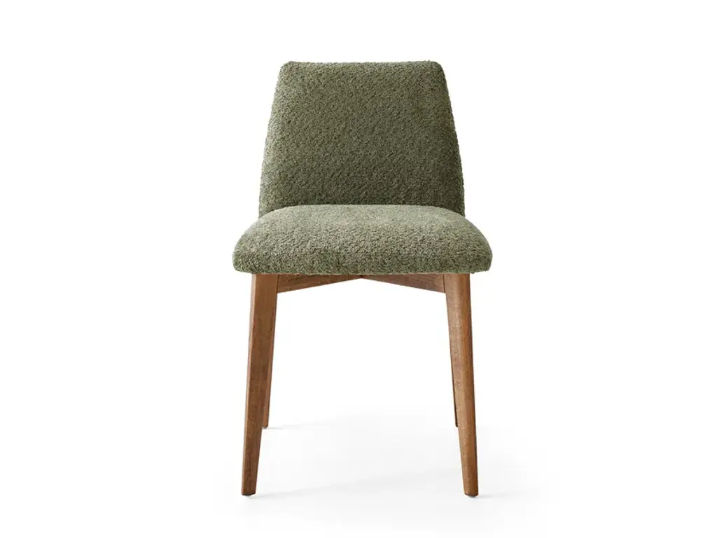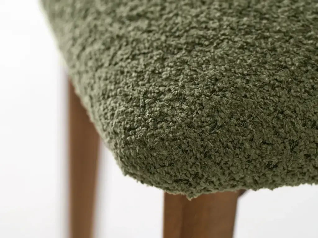 Barcelona is a chair with a beech frame, padded seat and backrest. Canaletto Havana finish, Bouclè Olive fabric upholstery.Available upholstery finishes - CAT. B (linen, velvet, bouclè)