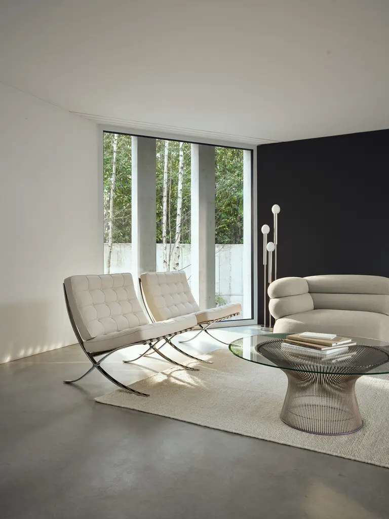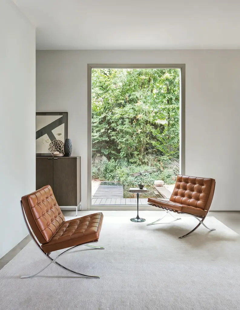 One of the most recognized objects of the last century, and an icon of the modern movement, the Barcelona Chair exudes a simple elegance that epitomizes Ludwig Mies van der Rohe's most famous maxim, “less is more.”Created by Ludwig Mies van der Rohe for his 1929 German Pavilion at the International Exhibition in Barcelona, the Barcelona Collection’s pure composition came to epitomize modern architecture. From the elegant crisscross frame to the individual upholstery squares expertly welted together by hand, each Barcelona Chair is a tribute to the marriage of modern design, exceptional craftsmanship, and meticulous attention to detail.