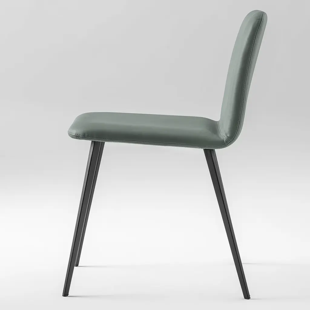 Elegant and sophisticated, this chair is marked by clean and essential lines of '50s inspiration. A modern evolution of the Bardot chair, this piece boasts slender metal legs, slightly slanted for a more stable balance. The multilayer seat and backrest, marked by soft and smooth lines, are welcoming and comfortable, padded and upholstered in green fabric. Please ask the Concierge for available fabric options. Contract and commercial certifications available upon request.