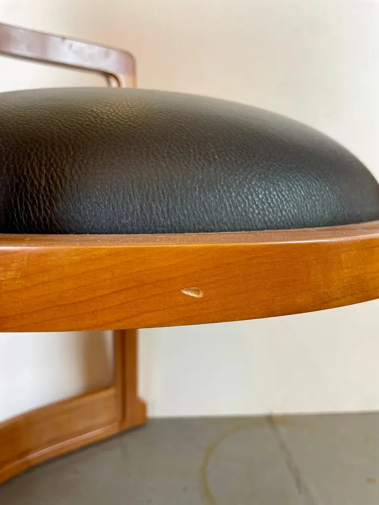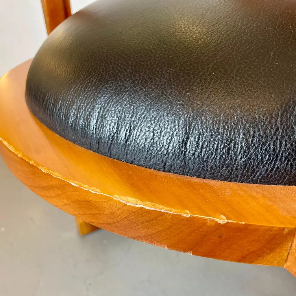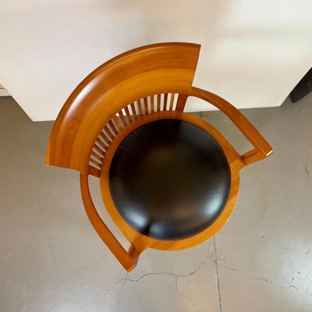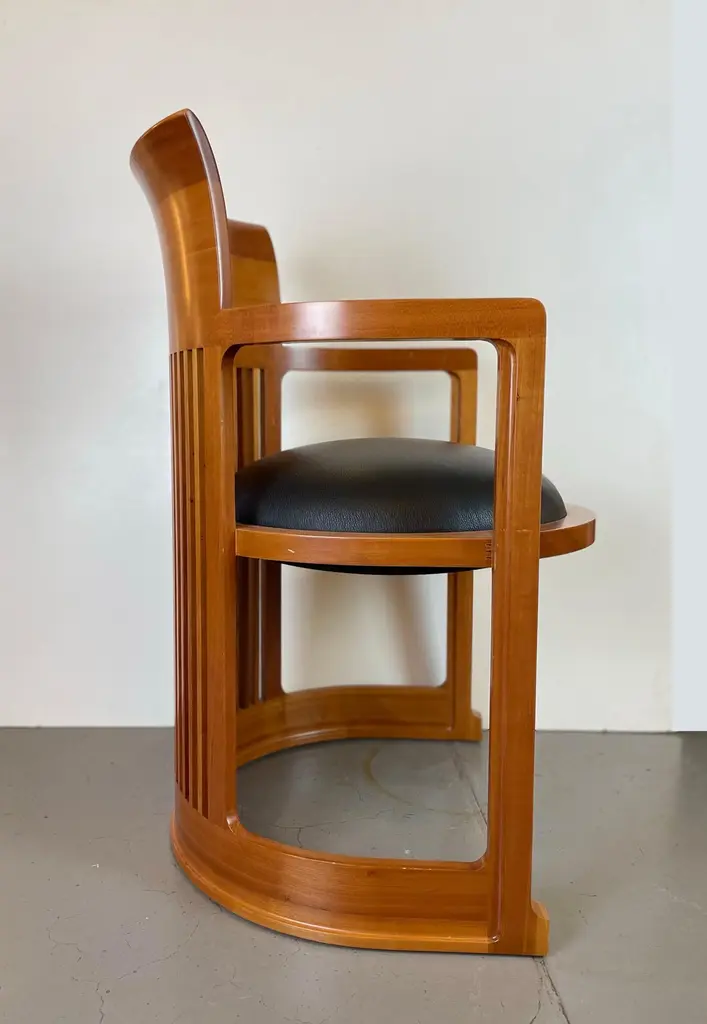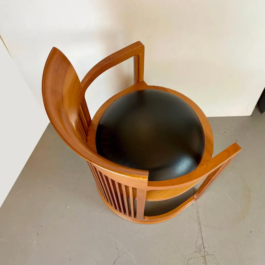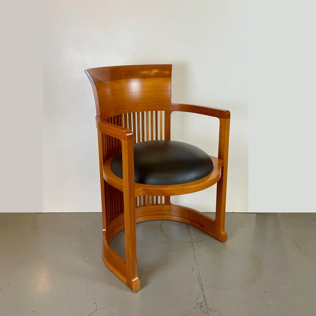 The Barrel chair form the Taliesin Group, emblematic design by Frank Lloyd Wright, drawed in 1904 for the Martin House is influenced by the Arts & Crafts movement. This model edited by Cassina in 1986 is made in cherry wood and black leather. Signed under the seat.-La chaise Barrel du groupe Taliesin, création emblématique de Frank Lloyd Wright, dessinée en 1904 pour la maison Martin, est influencée par le mouvement Art & Craft. Ce modèle, édité par Cassina en 1986, est réalisé en cerisier et cuir noir. Signature sous l'assise.Designed by: Frank Lloyd WrightProduced by: CassinaOrigin: ItalyDesign period: 1900’sEdition period: 1980’sMaterials: wood, leatherColor: brown, blackDimensions: H 84 x W 58 x D 55 cm