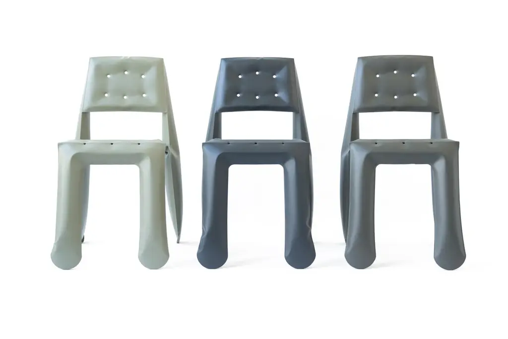 Beige Aluminum Chippensteel 0.5 Sculptural Chair by ZietaDimensions: D 58 x W 46 x H 80 cm Material: Aluminum. Finish: Powder-coated. Matt finish. Available in colors: white matt, beige, black, blue-gray, graphite, moss-gray, and, umbra-grey. Also available in stainless steel and carbon steel.Chippensteel 0.5 is a chair that delights the eye, mixes the senses, and plays with perception. Made of steel, aluminum or copper, its form refers to upholstered armchairs designed two centuries ago in England – it is a piece of furniture that combines ultra-modern technology with a nod to the rich history of design.Chippensteel 0.5 is a perfect example of combining craftsmanship with the original method of shaping steel called FiDU, developed and perfected by Oskar Zieta. The two-dimensional form is cut from metal sheets and welded in this process, finally getting transformed into a functional chair using compressed air. In the final stage, it goes through a finishing process performed by a designer and craftsman.The form of the chair was inspired by a classic model fashionable in the third quarter of the 18th century, named after the English carpenter Thomas Chippendale. The Chippensteel form deceives the eye with its inflated steel form, suggesting softness. Thanks to the use of evenly spaced holes, the artistically inflated steel imitates the irregularly arranged upholstery fabric on the armchairs. The combination of cold metal with an upholstery-like finish makes the Zieta Studio chair a unique work of art.Like other objects from the Zieta Studio offer, Chippensteel 0.5 is a mixture of craftsmanship with knowledge of the values ??of the material. The chair, made of polished steel and copper, thanks to its mirror surface, reflects light and the surroundings, focusing attention on itself and blending into space like a chameleon. On the other hand, the powder-coated finish emphasizes the chair’s irregular structure and gives it a more modern, industrial character.Chippensteel 0.5 is one of many objects designed by Oskar Zieta in the process of controlled deformation leading to the formation of unpredictable forms. As a result, the cool metal gains a “soft” appearance and becomes tame as a full-fledged interior material. Each Chippensteel chair contains the uniqueness of the material used: steel, copper, or aluminium.About Zieta: Zietas main goal is to deliver uniqueness and customization in design and construction while keeping the production, transport, and warehousing innovatively efficient.This is how they imagine the future world: Light, durable structures of customized applications produced on demand out of one-of-a-kind parts, yet efficiently.They use a computer-controlled production process. Customized pattern, customized form, customized function, one-of-a-kind product, and outstanding precision are what they deliver.You will find all of this philosophy reflected in the products. They research, they discover new possibilities, they play with forms and they deliver a beautiful, innovative, surprising outcome to people who love the design and who care about design development.They believe their work is a valuable contribution to the world of design not only by the unique beauty of the forms but most of all by opening ultra-innovative opportunities of forming and new paths for the world of the future.
