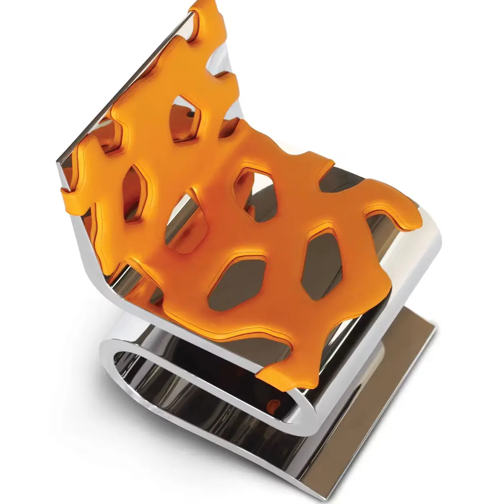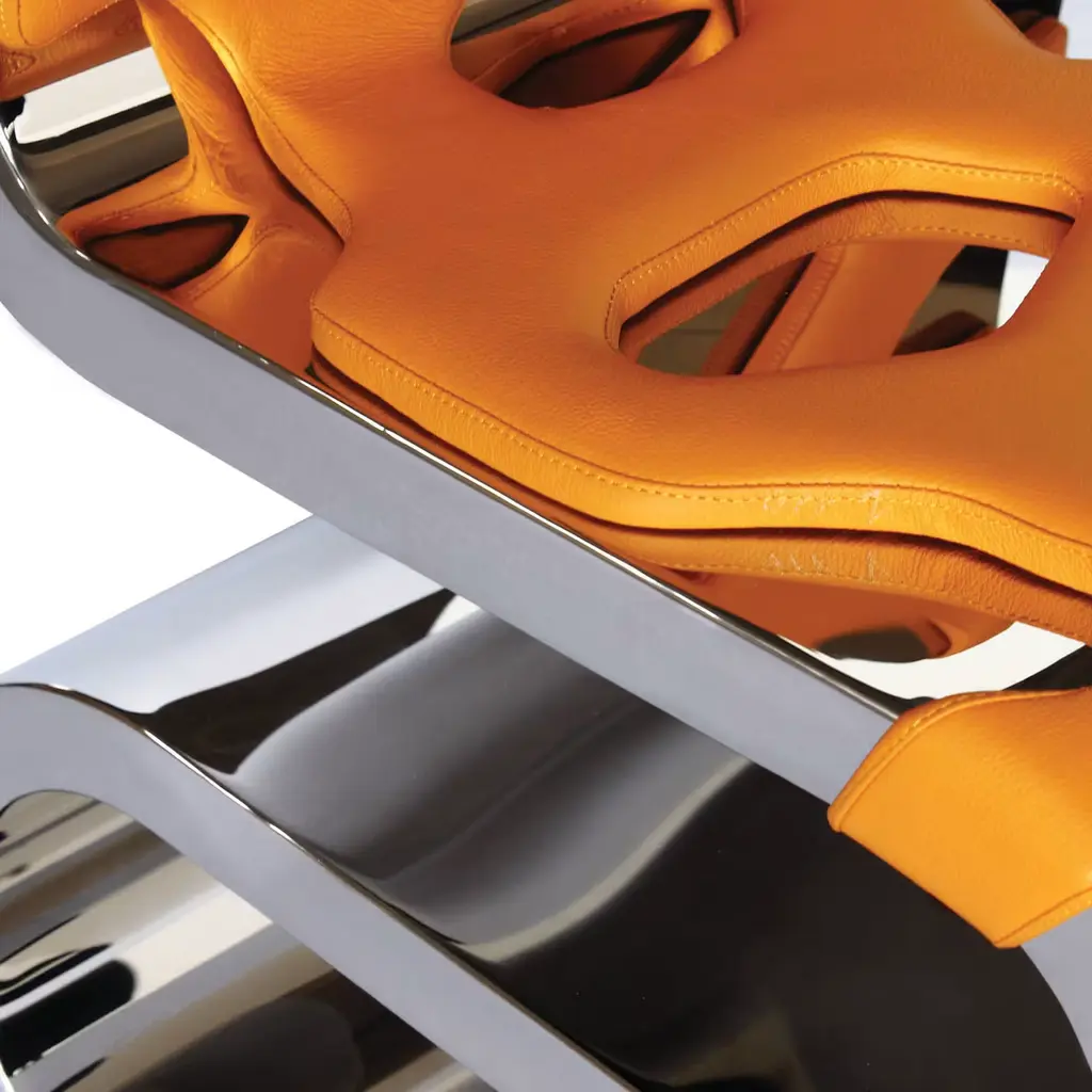 The chair Berserker is made of mirror-polished stainless steel with upholstering in genuine orange leather. Tipping over the chair turns into a side table which also contains a magazine rack. The inspiration came from folding a simple piece of paper; the aim of the project was to reproduce this shape giving it body and resistance without losing the windiness of its curves. Each chair is hand signed and numbered by the artists. 100% handmade in Italy.