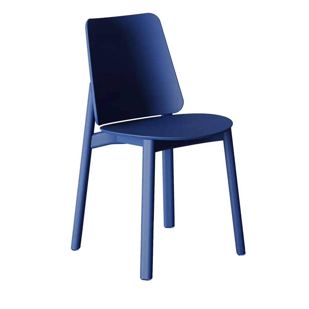 Archetypal lines reinterpreted in a fresh contemporary key lend this chair its distinctive familiarity. Here in a vivid blue stain (RAL 5002), the clean beech structure provides exceptional comfort with its ergonomic-cut seat and enveloping backrest. Simplicity and style seamlessly converge in this design, which makes for a spot-on addition to contract or domestic spaces, alike.