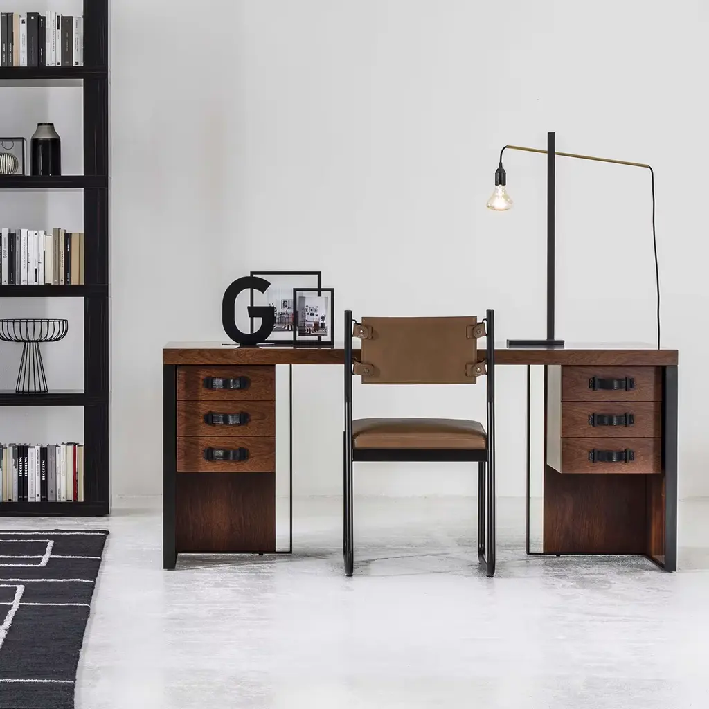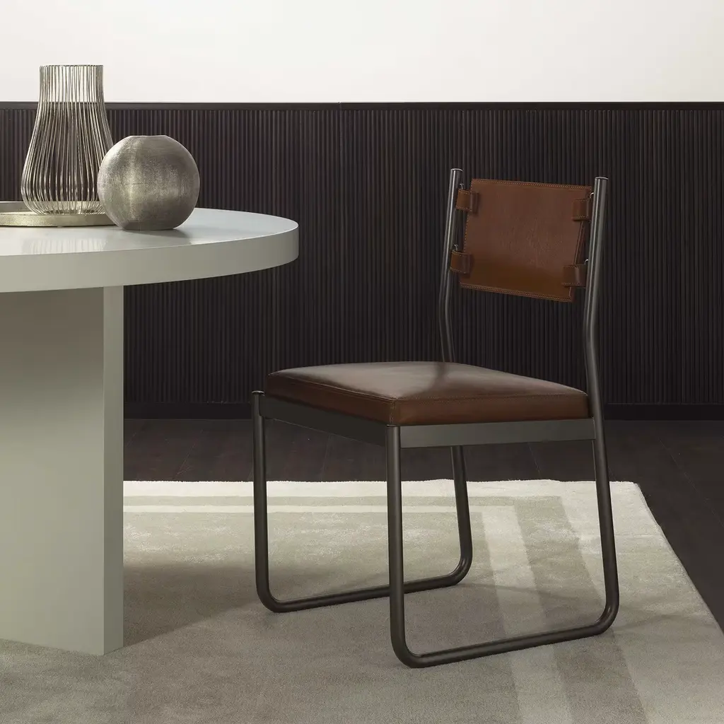 This chair features a black painted metal frame and leather upholstery. The seat and the backrest are made of plywood panels with high resistance padding covered in leather with visible stitching. This item can be personlized to give you a product that truly fits your living space.