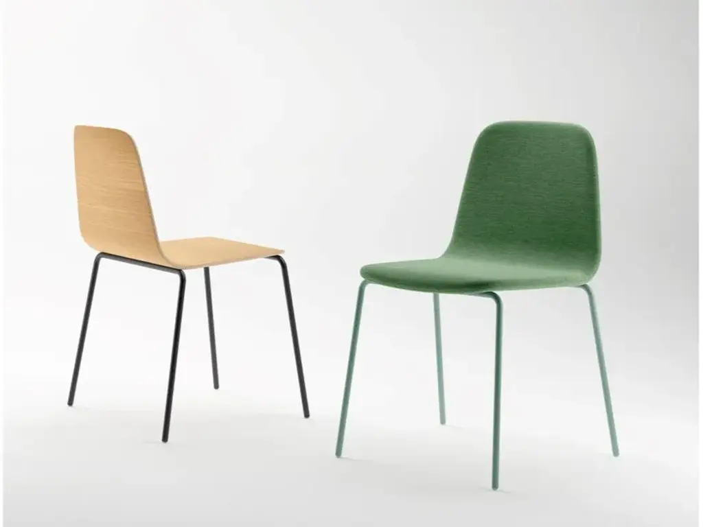 Wooden chair with tubular metal legs (1.6 cm).Traditional and modern styles are perfectly balanced in the serene and discreet design of this chair which blends Treku features into warm and intimate settings. Its simple design combines a wooden top, solid wood and upholstery to obtain distinct finishings which, together with different wooden and metal bases, make it suitable for a variety of settings and uses, whether in the home or office.