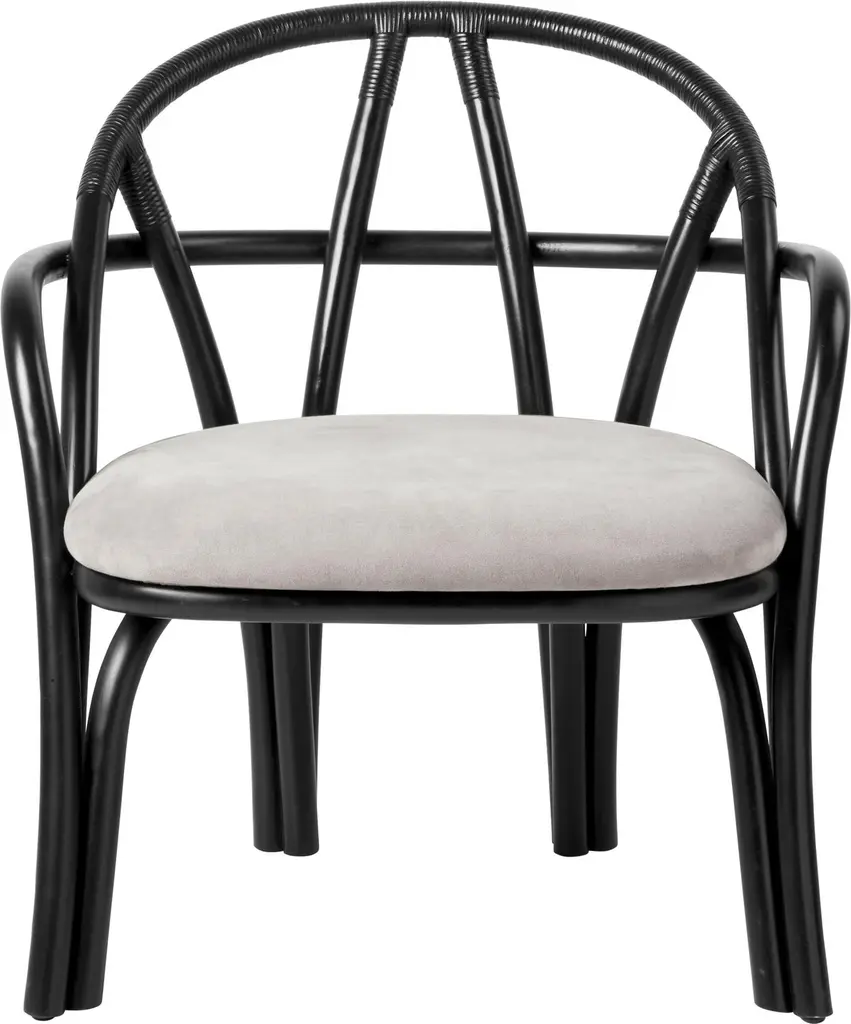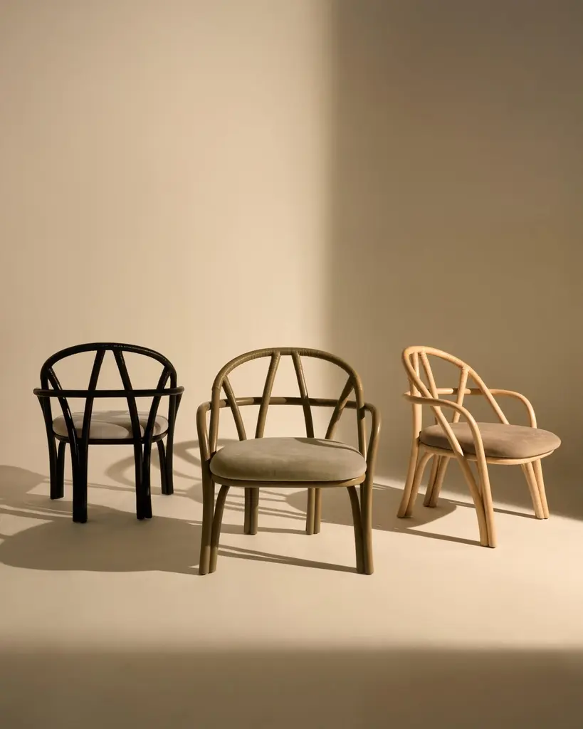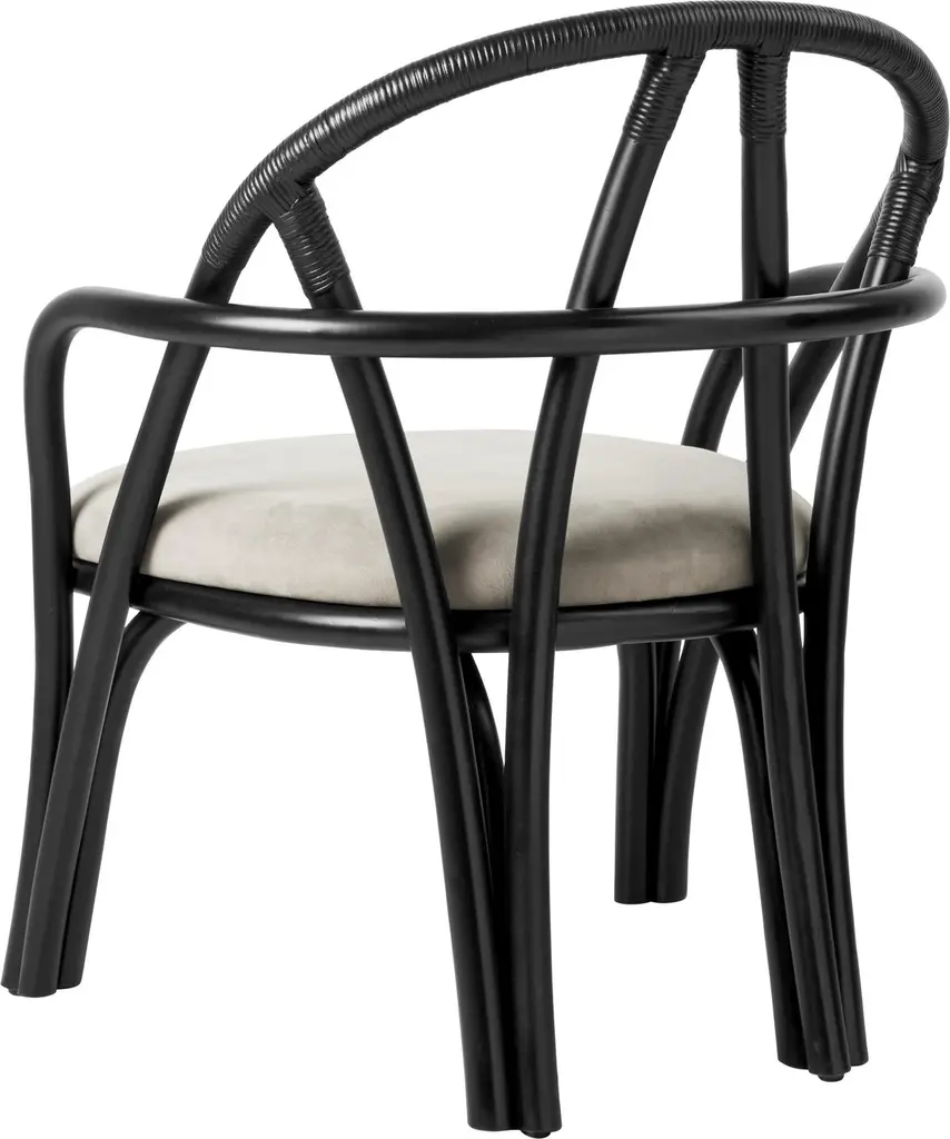 'Bistra' Lounge Chair in Ebony Painted Rattan by AMDL Circle for GUBIExecuted in steam-bent rattan the 'Bistra' lounge chair is part of a versatile seating collection that blends artisanal furniture-making traditions with exquisite contemporary craftsmanship.Designed for GUBI by Michele De Lucchi’s architecture practice, AMDL CIRCLE, 'Bistra' is a sculptural furniture collection that distills the classic bistro chair to its essential form, finding elegance and timelessness in its core structural elements. Comprising a dining armchair, a lounge chair, and a three-legged stool, the collection is rooted in its principal material: steam-bent rattan. Its visual language draws from the idea of organic growth, expressed in the tree-like contours of the legs, arms, and backrest, and echoed in the custom-designed upholstery, which features a botanical motif inspired by a Leonardo da Vinci fresco. Price is per item. Available in unlimited quantities in choice of three frame colors and multiple upholstery fabrics. This listing is for the 'Bistra' lounge chair in ebony painted rattan and fabric group B. Please inquire for a full catalogue of upholstery options in the following price groups:Price Group A: $1299.00Price Group B: $1399.00Price Group C: $1599.00Price Group D: $1899.00Price Group E: $2099.00Price Group F: $2399.00Lead time is 1-2 weeks. Please note that lead times, cost and inventory availability are subject to change without notice. Please inquire for current lead times prior to placing time-sensitive orders.Made to order. All sales are final.