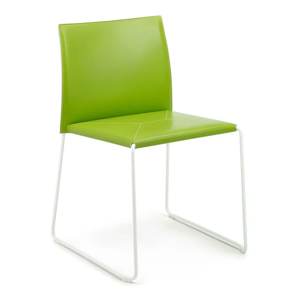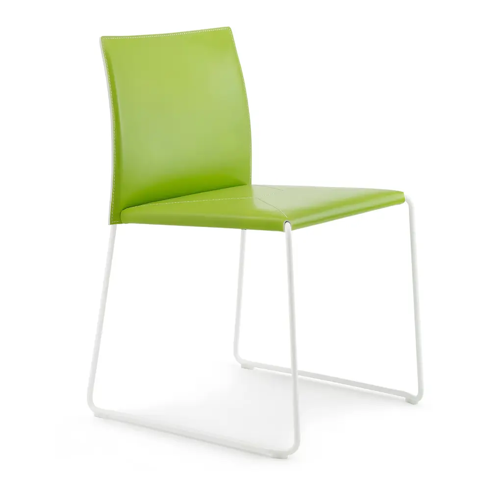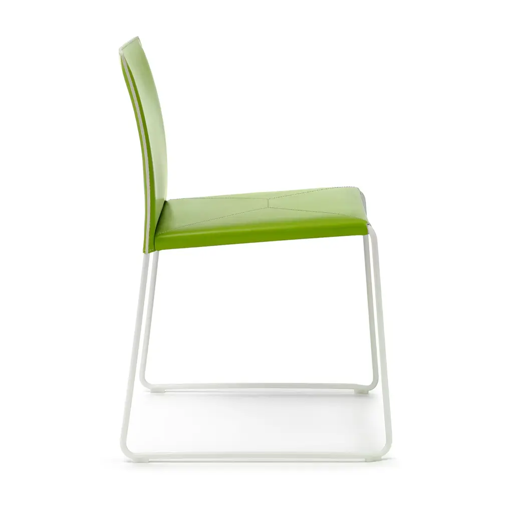 Chair with frame in chromed or painted steel rod(ø 12 mm); seat and backrest upholstered and covered in different materials; non-slip nylon feet, Metal seat pan covered with black technical fabric. All the components are available in other colors. Please contact the concierge for more information.