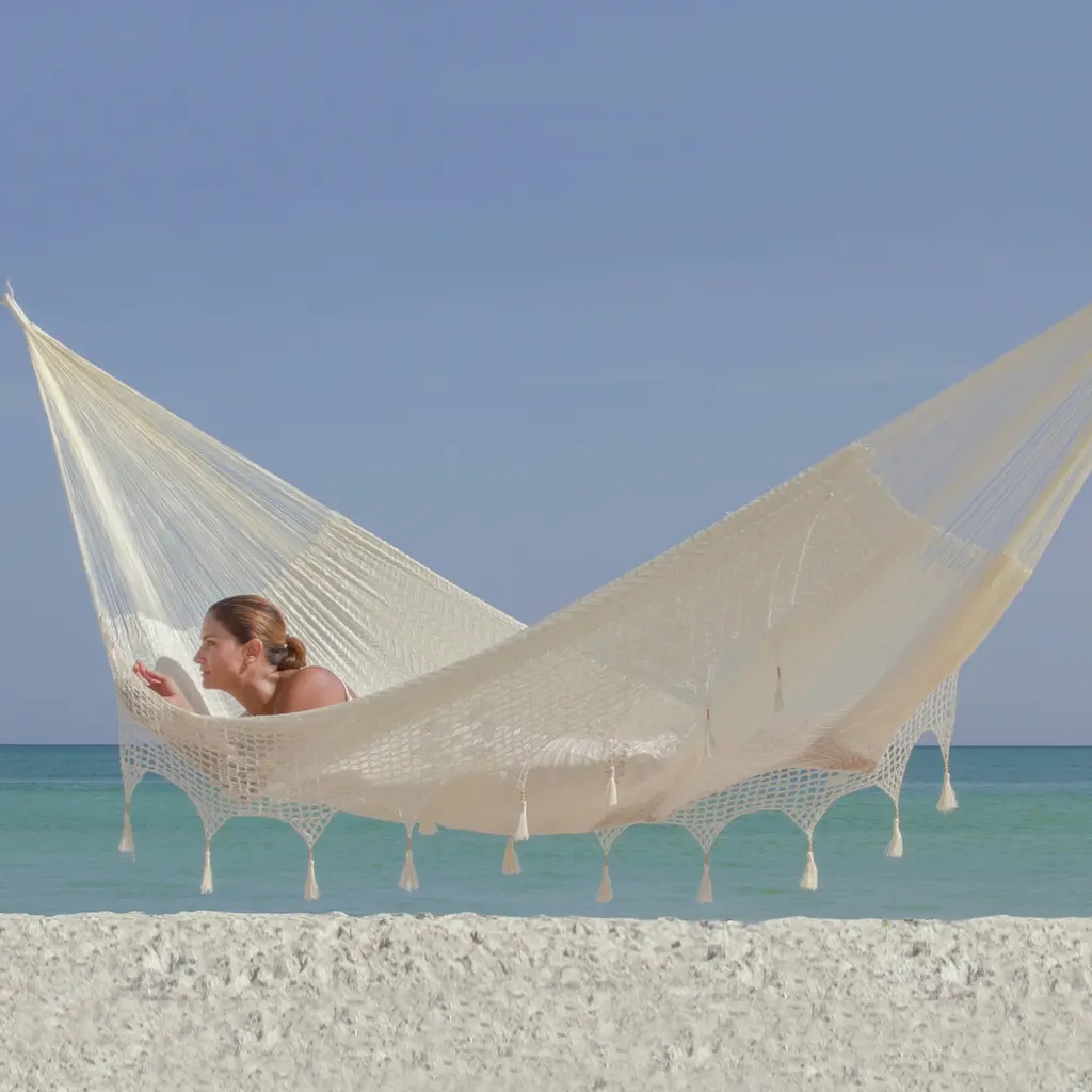 The warm nights in Mexico's Caribbean coast inspire the design of this alluring hammock swing. Woven by hand in traditional looms, this hammock swing evidences the care of the Maya Artists of the Yucatan. The hammock swing includes a pinewood rod and cotton strings for hanging.Ropes and hammock hooks are provided for easy installation. NOTE: Because each hammock is woven individually by hand, measurements may vary by as much as ten centimeters.