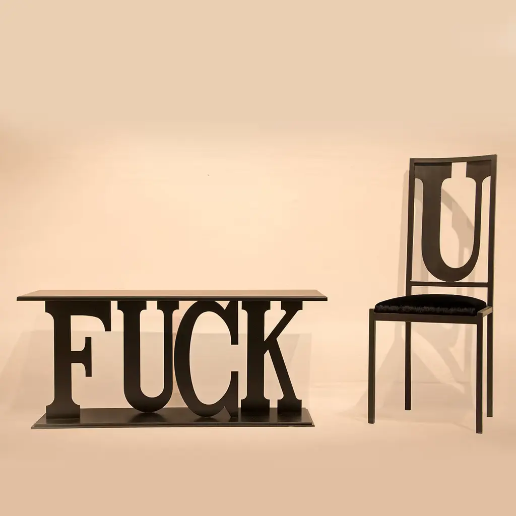 Part of the Imperfect Love Collection, the design idea behind this handcrafted chair is to create an out-of-the-ordinary piece that can be combined with others to spell the word "F**K" or "LOVE". A unique piece of highly original decor, this iron chair features the U letter framed in the open backrest and a velvet-upholstered seat. Sporting a total black look, this is the absolutely perfect backdrop-piece for an eclectic and contemporary décor style. Available also in gold finish and gold, blue, bronze, or gray velvet. Each piece is unique, due to handcrafting, slight changes may occur.