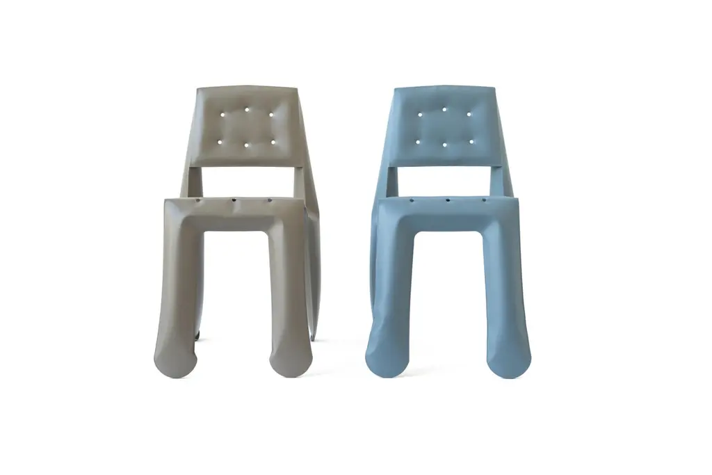 Blue Grey Carbon Steel Chippensteel 0.5 Sculptural Chair by ZietaDimensions: D 58 x W 46 x H 80 cm Material: Carbon Steel. Finish: Powder-coated. Matt finish. Also available in colors: white matt, beige, black, blue-gray, graphite, moss-gray, and, umbra-grey. Chippensteel 0.5 is a chair that delights the eye, mixes the senses, and plays with perception. Made of steel, aluminum or copper, its form refers to upholstered armchairs designed two centuries ago in England – it is a piece of furniture that combines ultra-modern technology with a nod to the rich history of design.Chippensteel 0.5 is a perfect example of combining craftsmanship with the original method of shaping steel called FiDU, developed and perfected by Oskar Zieta. The two-dimensional form is cut from metal sheets and welded in this process, finally getting transformed into a functional chair using compressed air. In the final stage, it goes through a finishing process performed by a designer and craftsman.The form of the chair was inspired by a classic model fashionable in the third quarter of the 18th century, named after the English carpenter Thomas Chippendale. The Chippensteel form deceives the eye with its inflated steel form, suggesting softness. Thanks to the use of evenly spaced holes, the artistically inflated steel imitates the irregularly arranged upholstery fabric on the armchairs. The combination of cold metal with an upholstery-like finish makes the Zieta Studio chair a unique work of art.Like other objects from the Zieta Studio offer, Chippensteel 0.5 is a mixture of craftsmanship with knowledge of the values ??of the material. The chair, made of polished steel and copper, thanks to its mirror surface, reflects light and the surroundings, focusing attention on itself and blending into space like a chameleon. On the other hand, the powder-coated finish emphasizes the chair’s irregular structure and gives it a more modern, industrial character.Chippensteel 0.5 is one of many objects designed by Oskar Zieta in the process of controlled deformation leading to the formation of unpredictable forms. As a result, the cool metal gains a “soft” appearance and becomes tame as a full-fledged interior material. Each Chippensteel chair contains the uniqueness of the material used: steel, copper, or aluminium.About Zieta: Zietas main goal is to deliver uniqueness and customization in design and construction while keeping the production, transport, and warehousing innovatively efficient.This is how they imagine the future world: Light, durable structures of customized applications produced on demand out of one-of-a-kind parts, yet efficiently.They use a computer-controlled production process. Customized pattern, customized form, customized function, one-of-a-kind product, and outstanding precision are what they deliver.You will find all of this philosophy reflected in the products. They research, they discover new possibilities, they play with forms and they deliver a beautiful, innovative, surprising outcome to people who love the design and who care about design development.They believe their work is a valuable contribution to the world of design not only by the unique beauty of the forms but most of all by opening ultra-innovative opportunities of forming and new paths for the world of the future.