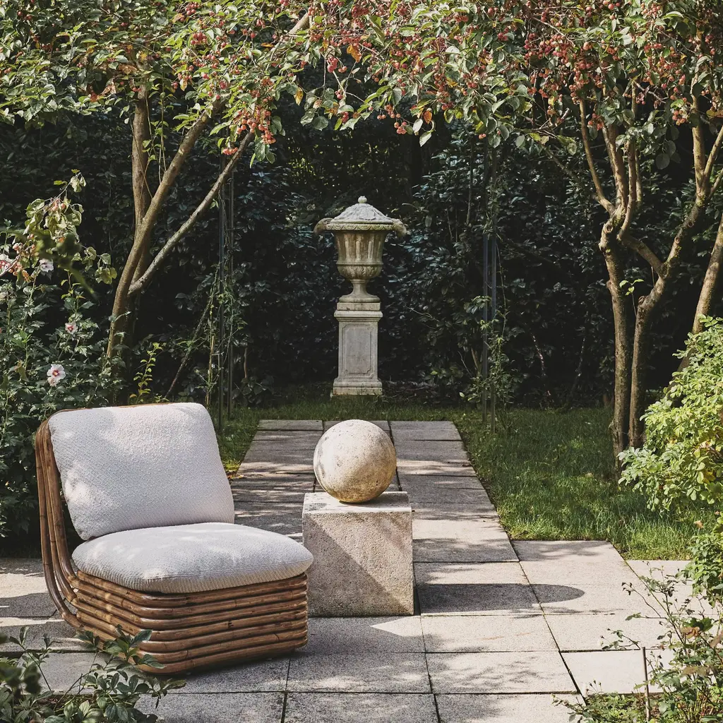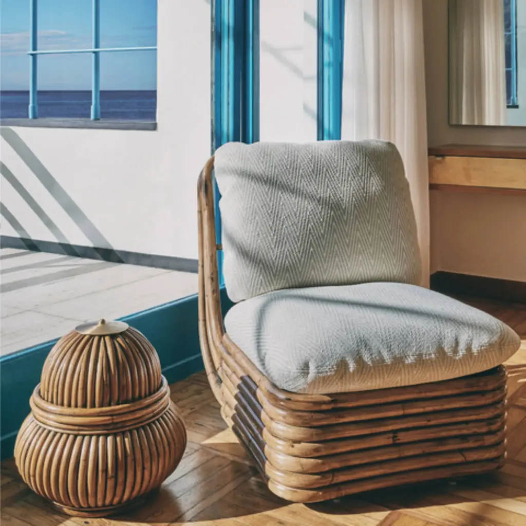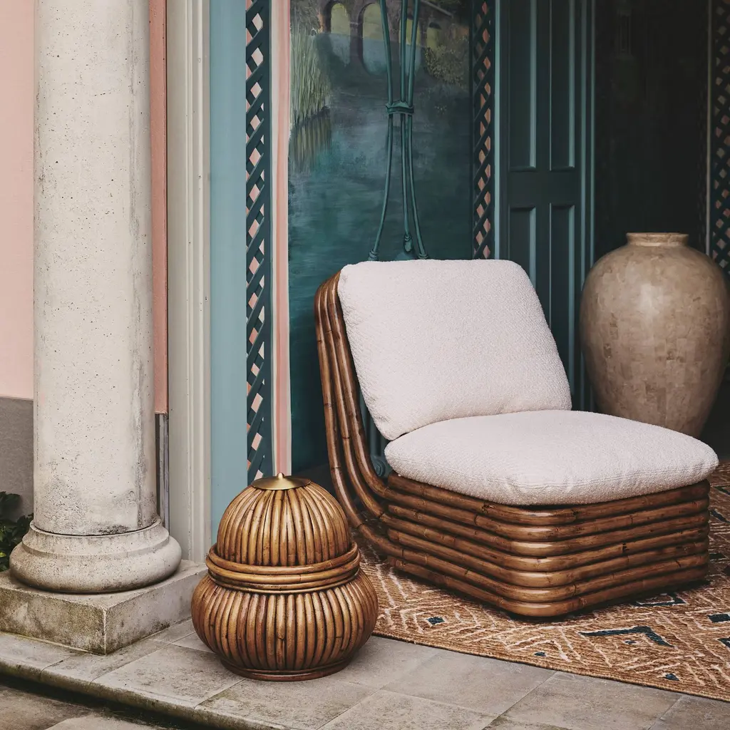 Topped with a lavishly plump cushioning, designer Gabriella Crespi's lounge chair has a generous 115 degree incline to encourage even deeper relaxation. From her jet-set Bohemian 72 collection, lengths of stacked cane are steamed and bent by hand to form the base of the seating in the naturalistic style she espoused, tinged with Eastern influences. Crespi's take on indoor-outdoor living — first conceived for her own Milan home — has been reproduced by Gubi from her original working drawings.