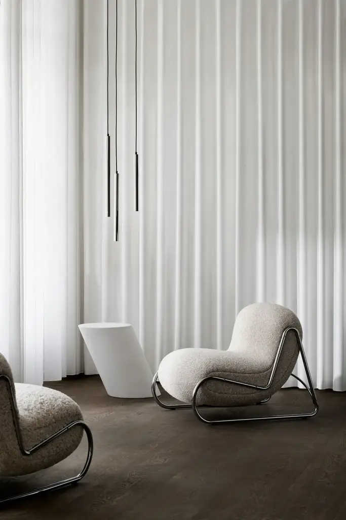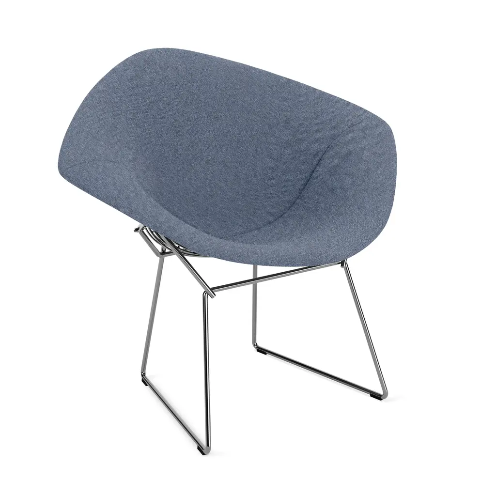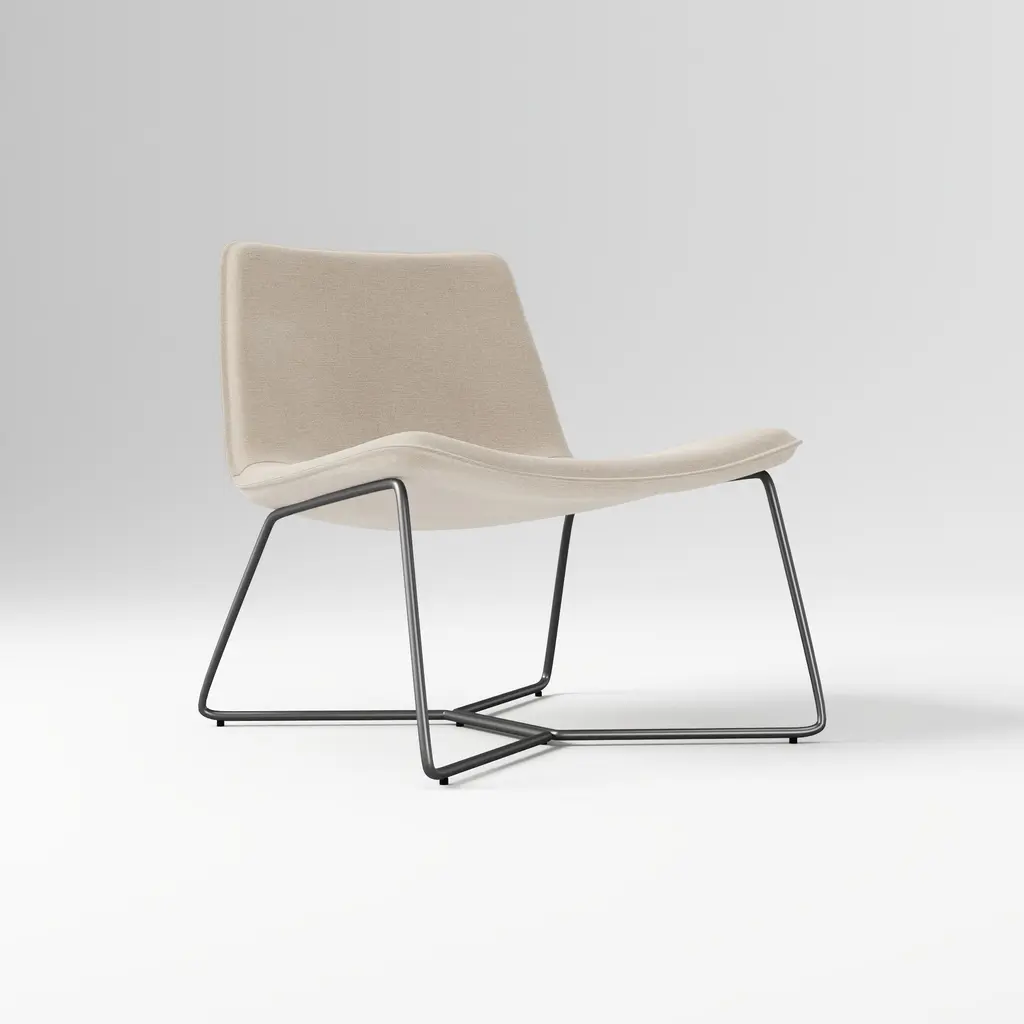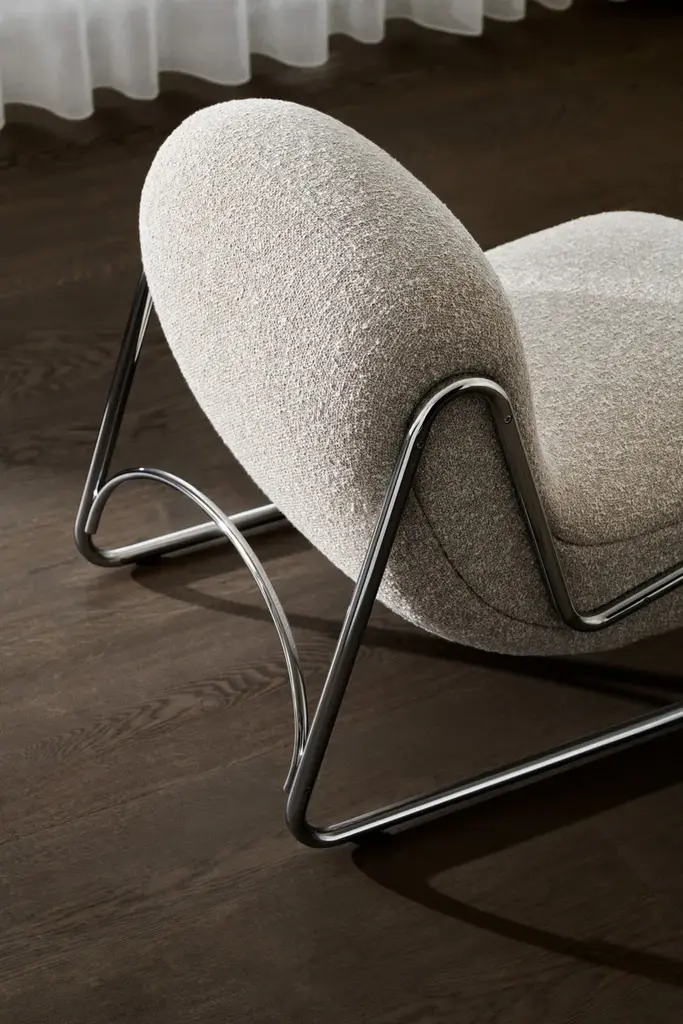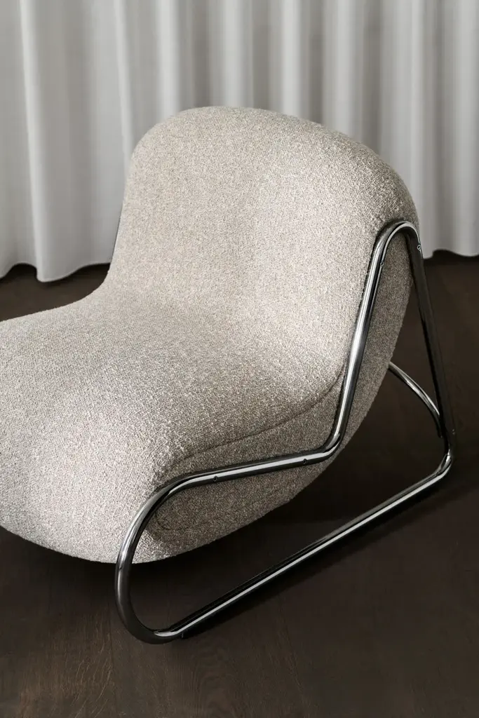 Boho is an lounge chair with a sled base in chromed stainless steel and a plywood structure with polyurethane foam padding (Combi PUR).The Boho Chair draws inspiration from the soft, flowing silhouettes of the 1970s, while its mirror chrome base reflects the crisp, geometric style of the 1980s. Boho features a soft, playful shape with a gently bulging backrest that provides the chair with form and a unique silhouette, while preventing it from looking like a pouf. The lower frame adds a genuine lounge feel and imparts a light, almost floating appearance to the chair. The frame is available in either a mirror chrome steel base (Cr. III).