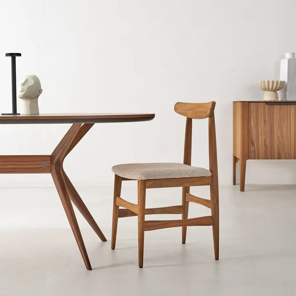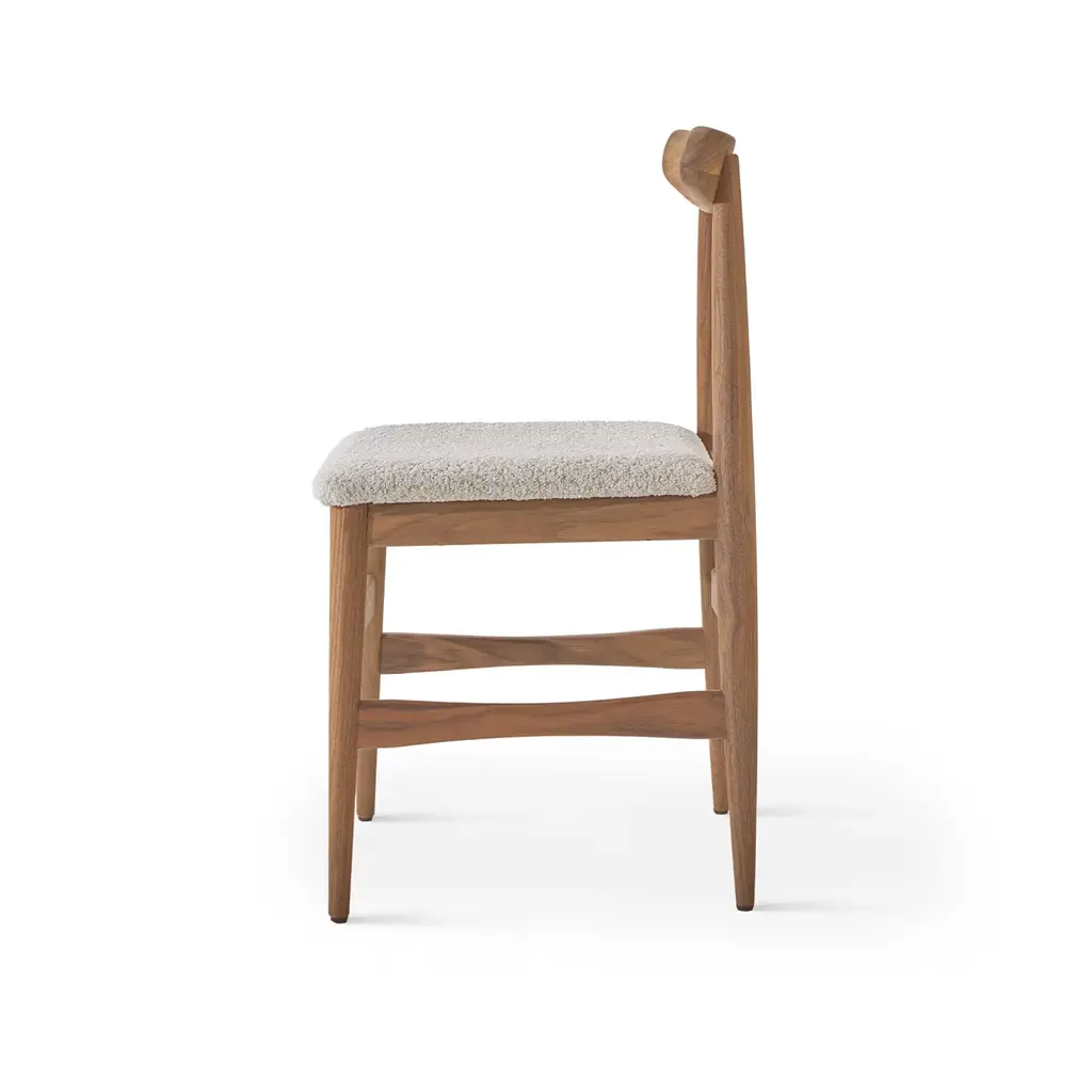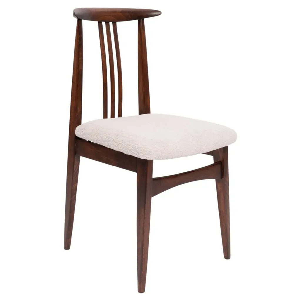 Quietly dynamic in its contours and colors, this chair brims with sophisticated modern charm. A special finish - named "Havana" - enriches the solid Canaletto walnut structure, which offers perfect comfort thanks to the combination of a subtly embracing curved backrest and wide seat covered in beige ("Oyster") boucle fabric for a pleasing textural touch.