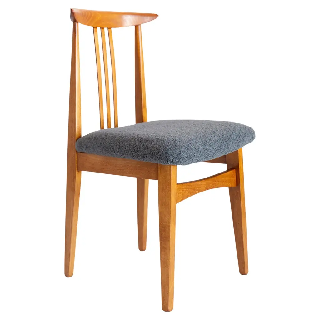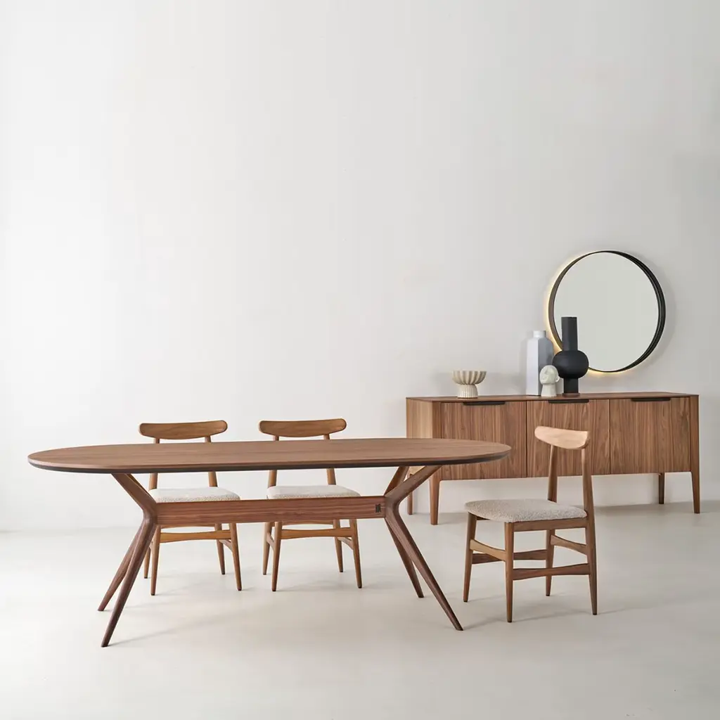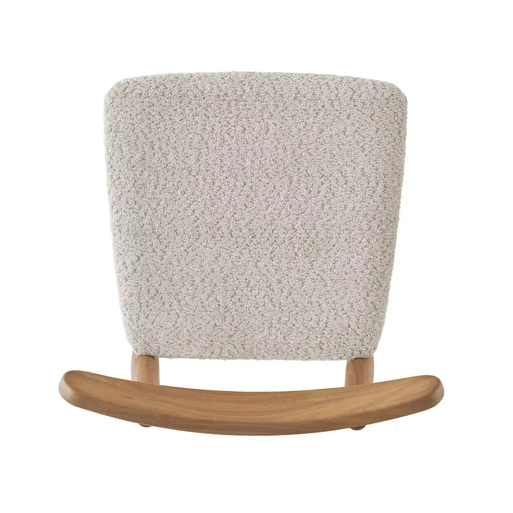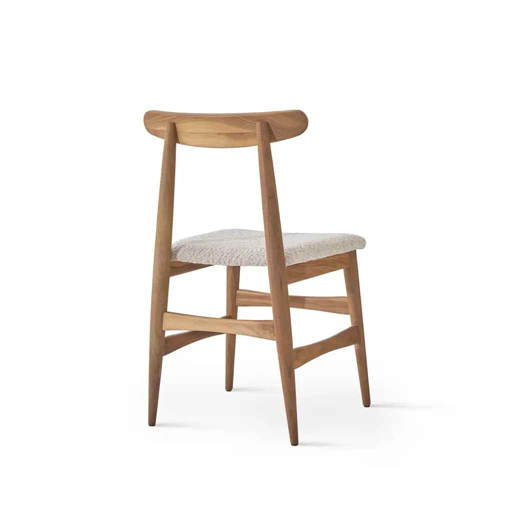 Quietly dynamic in its contours and colors, this chair brims with sophisticated modern charm. A special finish - named "Havana" - enriches the solid Canaletto walnut structure, which offers perfect comfort thanks to the combination of a subtly embracing curved backrest and wide seat covered in beige ("Oyster") boucle fabric for a pleasing textural touch.