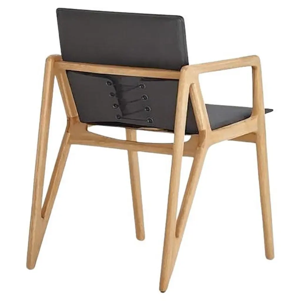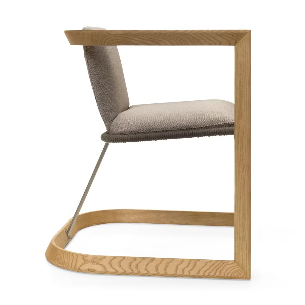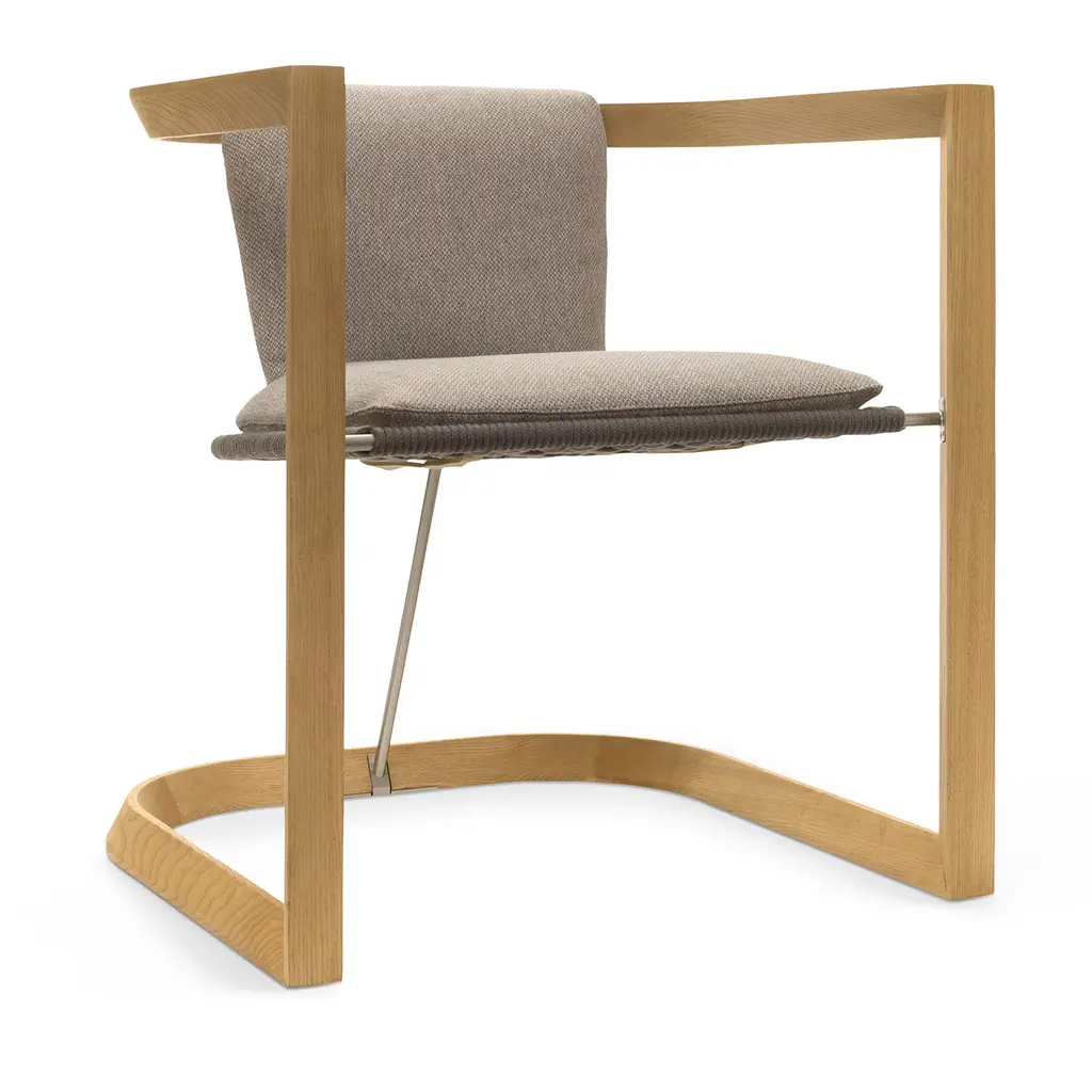 Airy and sculptural, this unmistakably contemporary armchair seduces with the fluidity of its essential natural-stained ash silhouette. Featuring a solid steel frame and a double-thread braided strong design, it is capable of offering long-lasting comfort thanks to its polyurethane-padded seat and backrest, completed by an elegant brown fabric cover. A wenge-stained variant is also available. Please contact the concierge service for further options.
