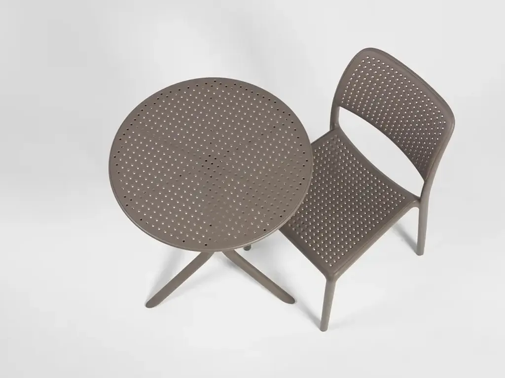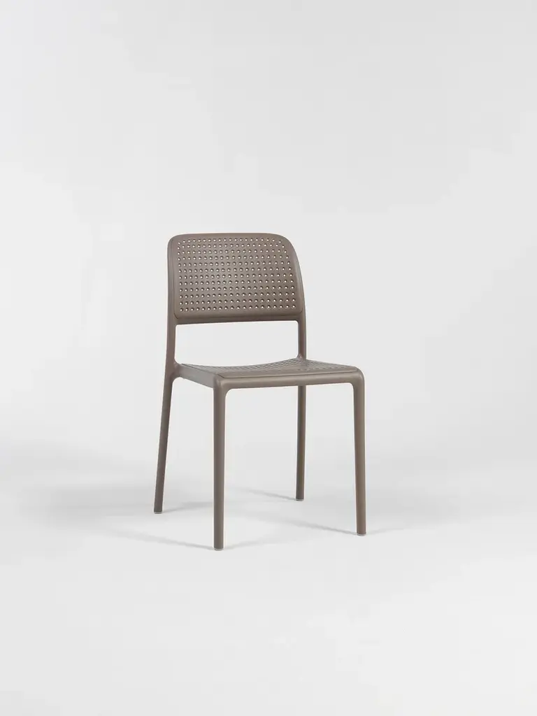 Lightweight and original, Bora Bistrot is a comfortable chair without armrests, with clear-cut dynamic lines that adapt to both outdoor and indoor use.Its seamless tubular frame, with rounded profiles, is made of recyclable UV-treated and mass-coloured fiberglass resin with a matt finish.The seat and back form a single shell, aesthetically highlighting shapes reminiscent of soft fabric padding.Easily stackable and handy to move, Bora Bistrot is available in various colours and is fitted with non-slip feet. Bora Bistrot is available in the following dimensions: W. 49 cm and D. 54 cm, with a backrest H. 83 cm and seat H. 46.5 cm.