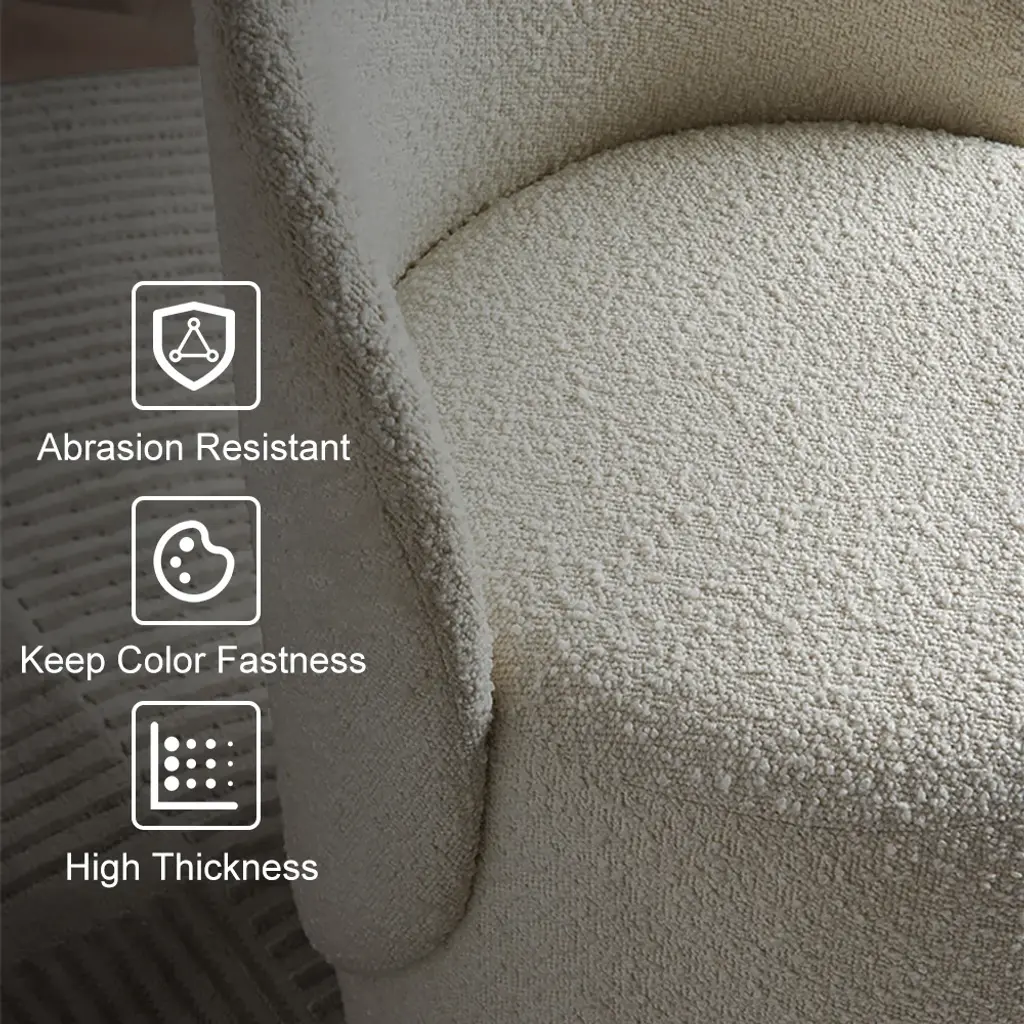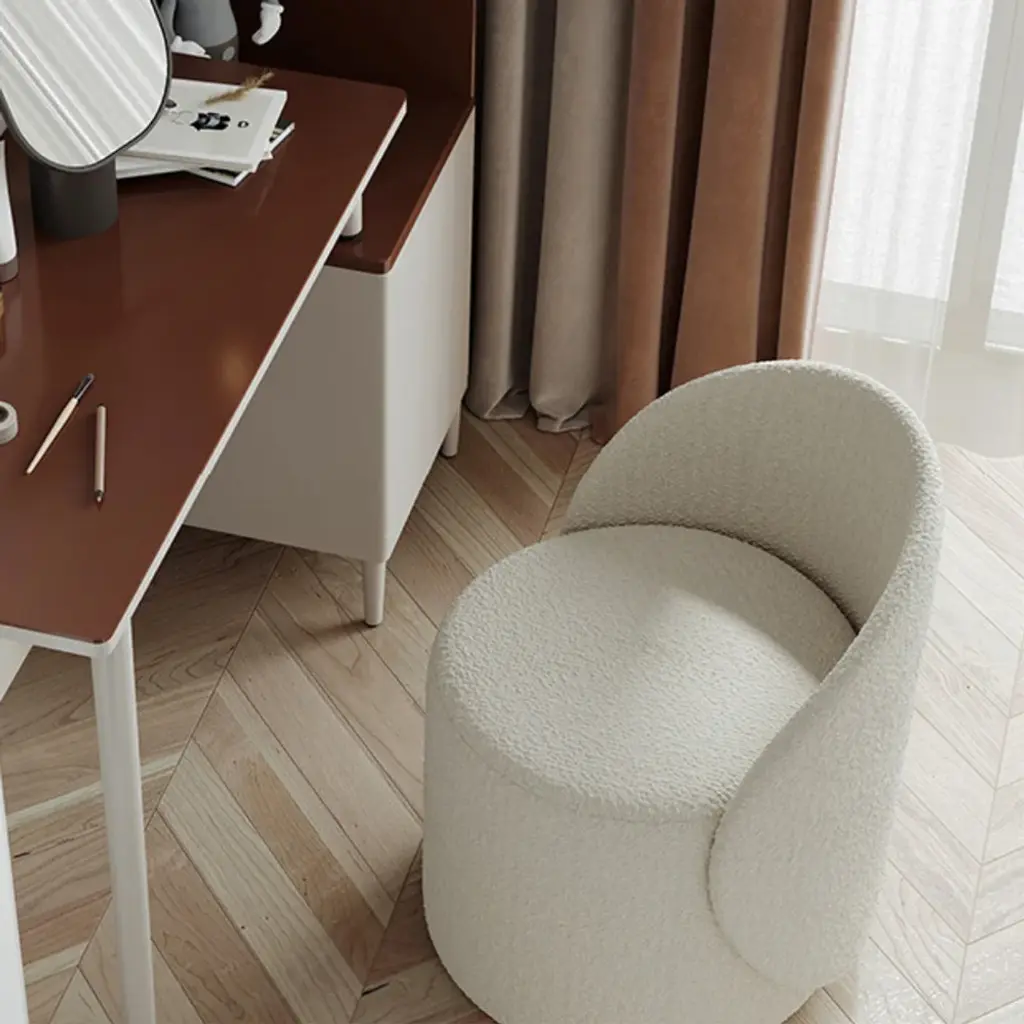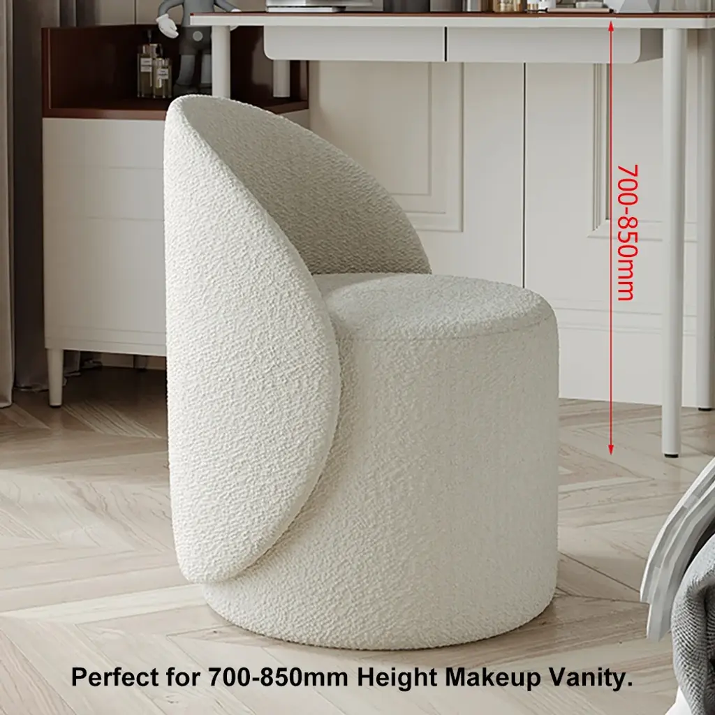 This swivel boucle vanity stool is crafted with soft and chic beige boucle fabric, offers comfort and modern design Perfect for any room, it features a comfortable upholstered seat and 360-degree rotation for versatile use Ideal for small spaces like dorms, bedrooms, or children's rooms