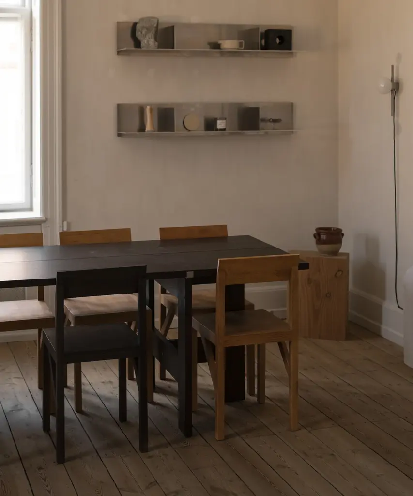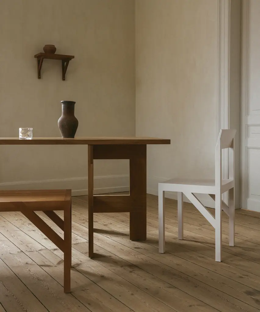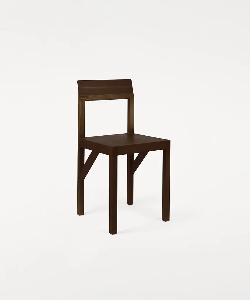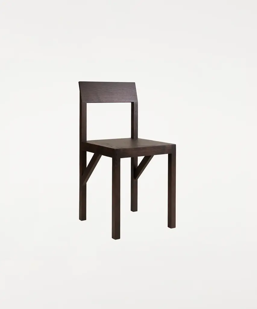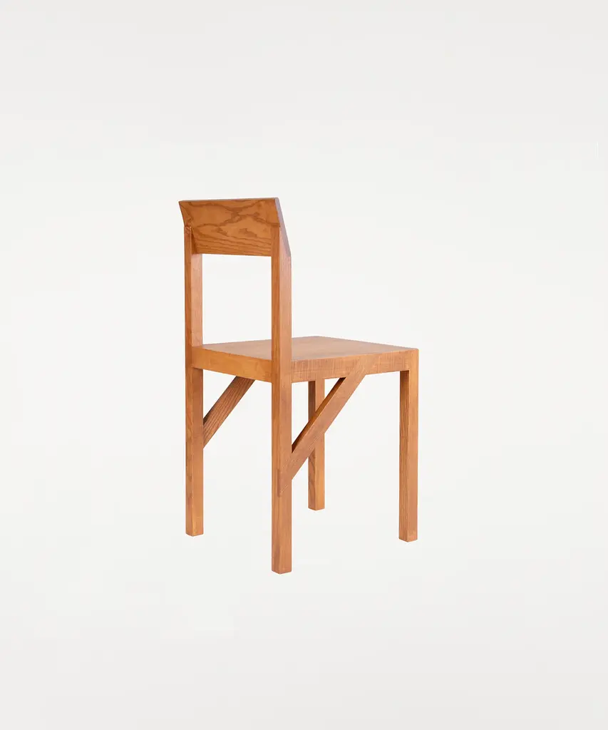 The Bracket Chair, designed in collaboration with Copenhagen-based design studio Frederik Gustav, is a four-legged piece fabricated in solid oiled pine with a flat seat and a slightly angled backrest highlighted by a structural component, the bracket. This purely functional element turned into an aesthetic feature ties the chair’s vertical elements to the horizontal ones providing stability—an architectural influence, a nod to timeless construction.Designed by Fredrik Gustav for Frama - an interior and product design studio based in Copenhagen. The studio is a dynamic testing ground for new designs and projects, embodying their classical, yet boundary-pushing approach. Produced by Frederik Gustav - an interior and product design studio based in Copenhagen. The studio is a dynamic testing ground for new designs and projects, embodying their classical, yet boundary-pushing approach.