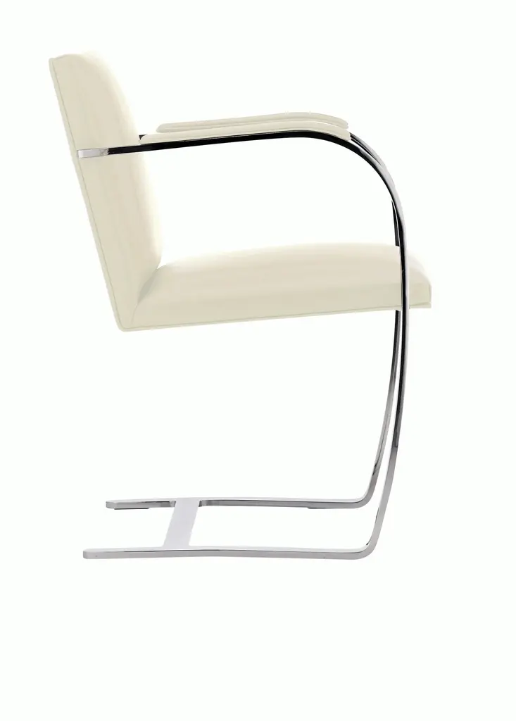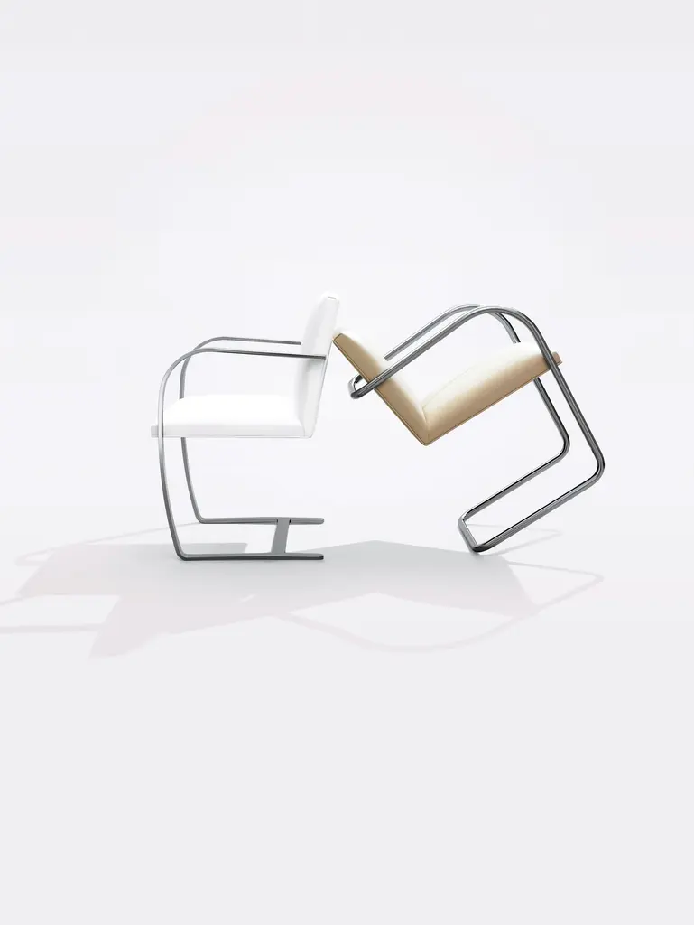 Designed by Ludwig Mies van der Rohe for his celebrated Villa Tugendhat in Brno, Czech Republic, the Brno Chair reflects the groundbreaking simplicity of its original environment. The cantilevered seat bounces slightly with the sitter, and its flat bar frame is offered in a choice of finishes.Celebrated for its lean profile, clean lines, and meticulous craftsmanship, the Brno Chair is an icon of 20th-century design. Ludwig Mies van der Rohe designed the chair in 1930 for Villa Tugendhat in Brno, CZ. Widely considered to be his defining residential work, the villa and its contents reflect the summation of his ideas incorporated at every level of the design.