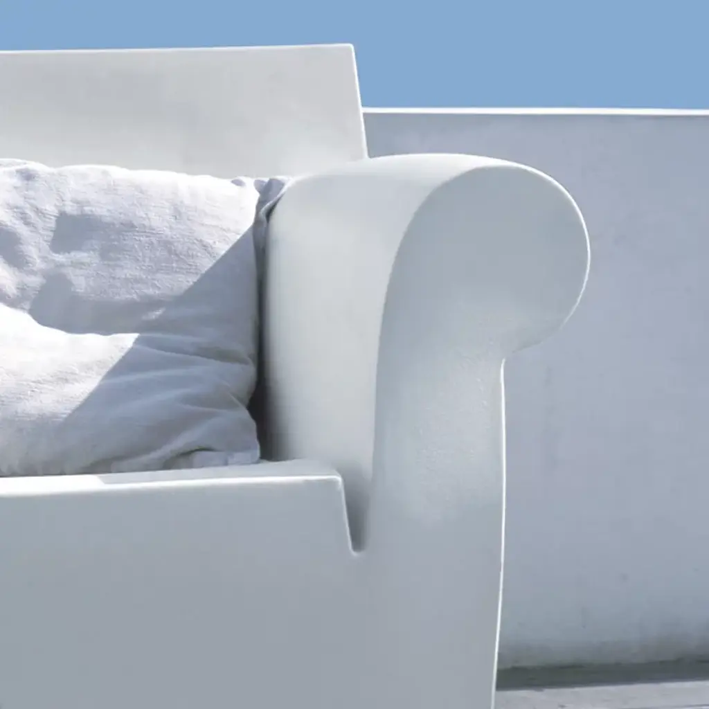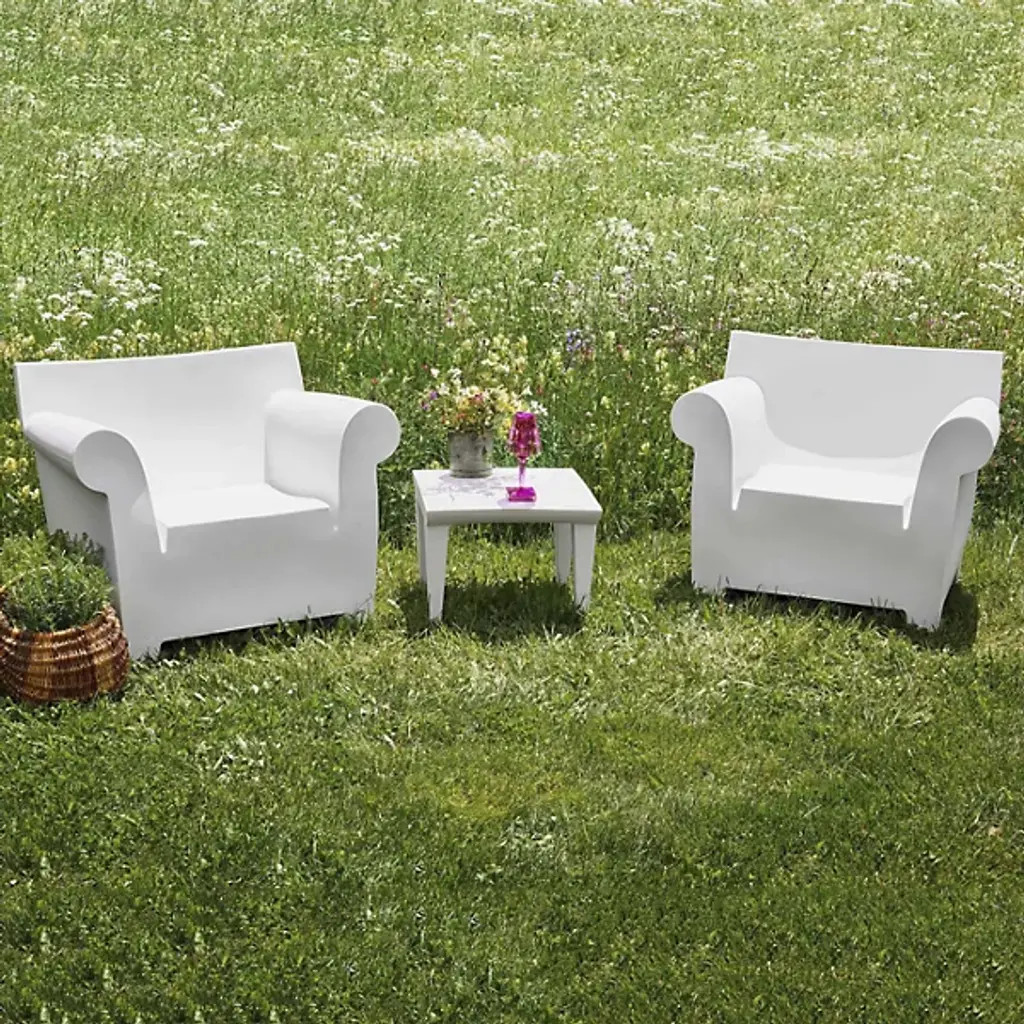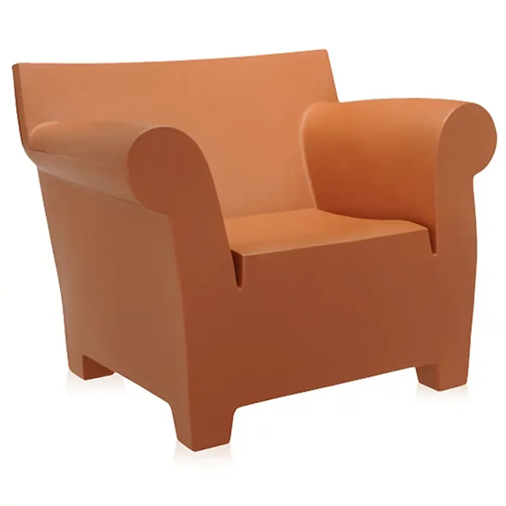The Kartell Bubble Club Chair, a Philippe Starck design, is made of smooth and durable batch-dyed polyethylene. The chair can live perfectly outside, but is also great for furnishing internal communal spaces, waiting rooms and public places. It is characterized by the soft lines of the arms in contrast with the more essential and rational line of the back. It is the ideal example of the Kartell design concept of pairing classic style with modern materials.