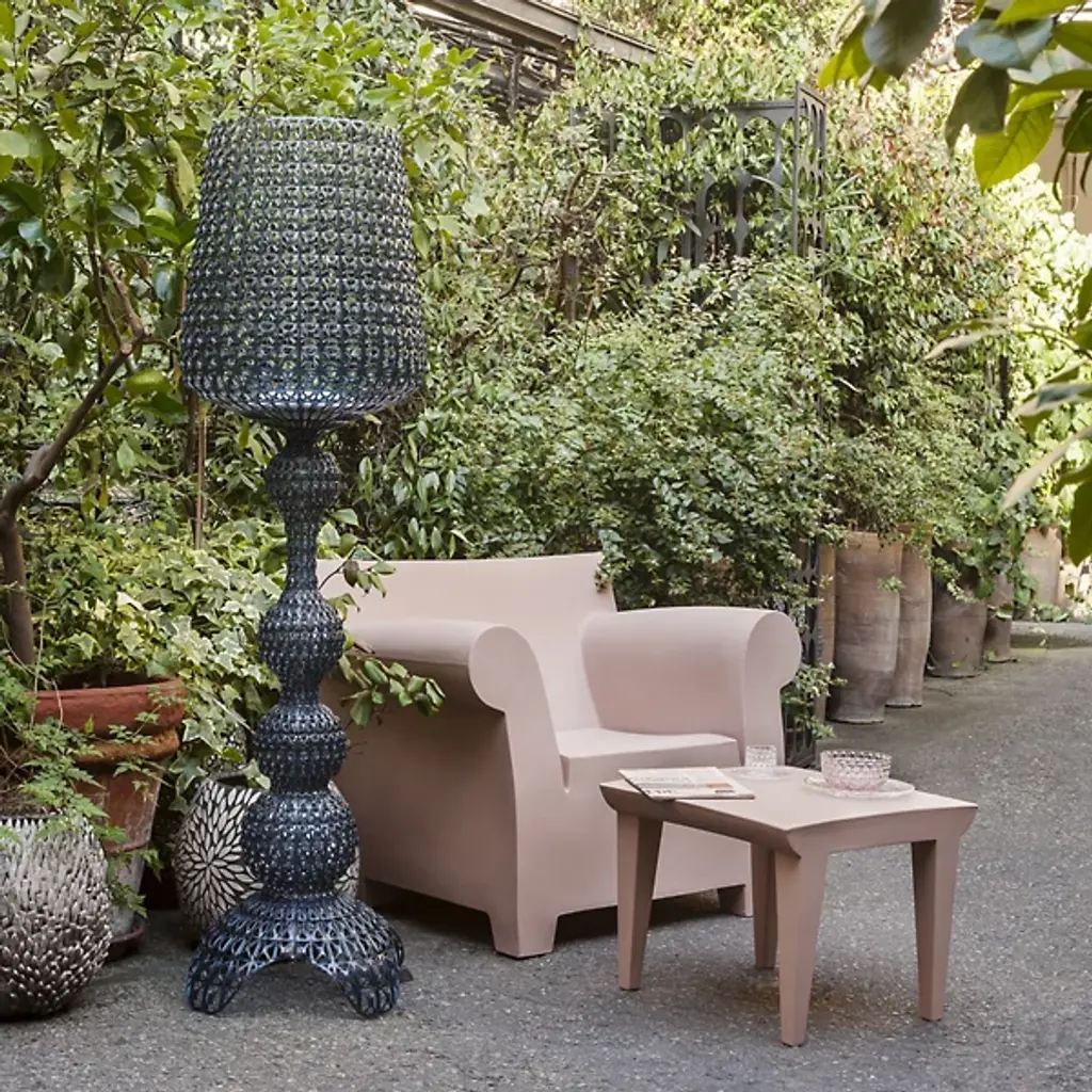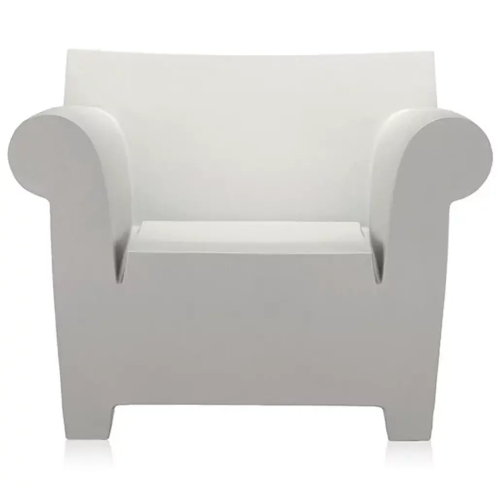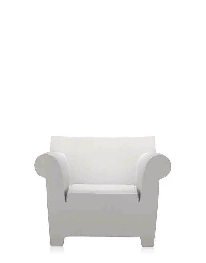 The Kartell Bubble Club Chair, a Philippe Starck design, is made of smooth and durable batch-dyed polyethylene. The chair can live perfectly outside, but is also great for furnishing internal communal spaces, waiting rooms and public places. It is characterized by the soft lines of the arms in contrast with the more essential and rational line of the back. It is the ideal example of the Kartell design concept of pairing classic style with modern materials.