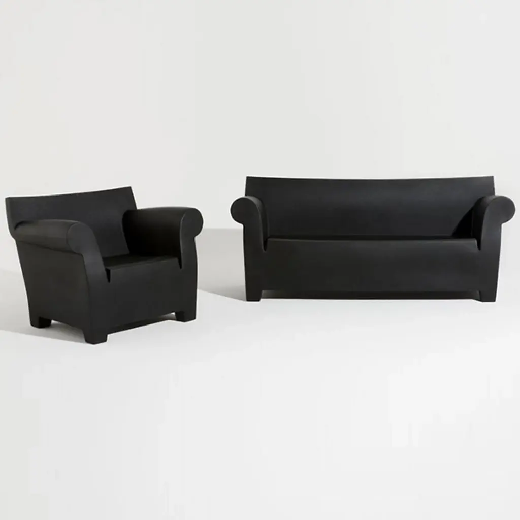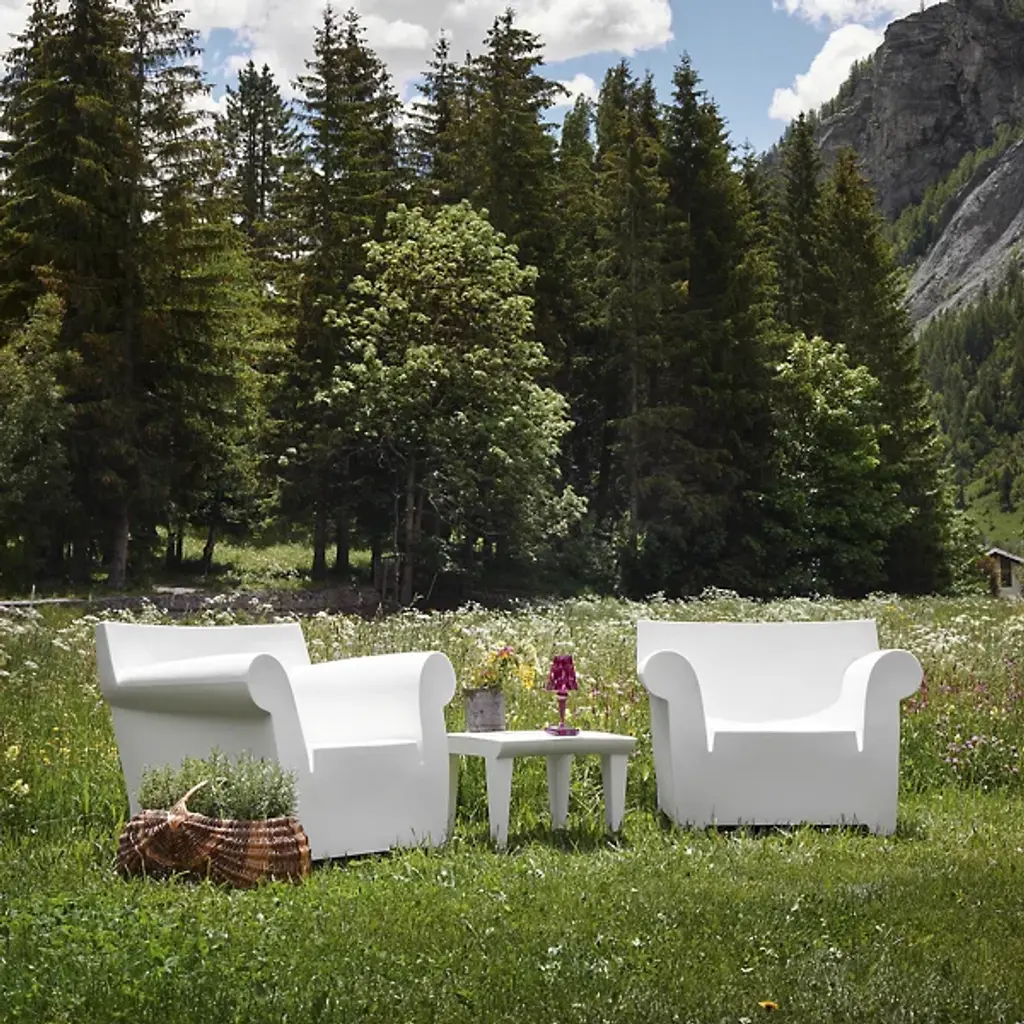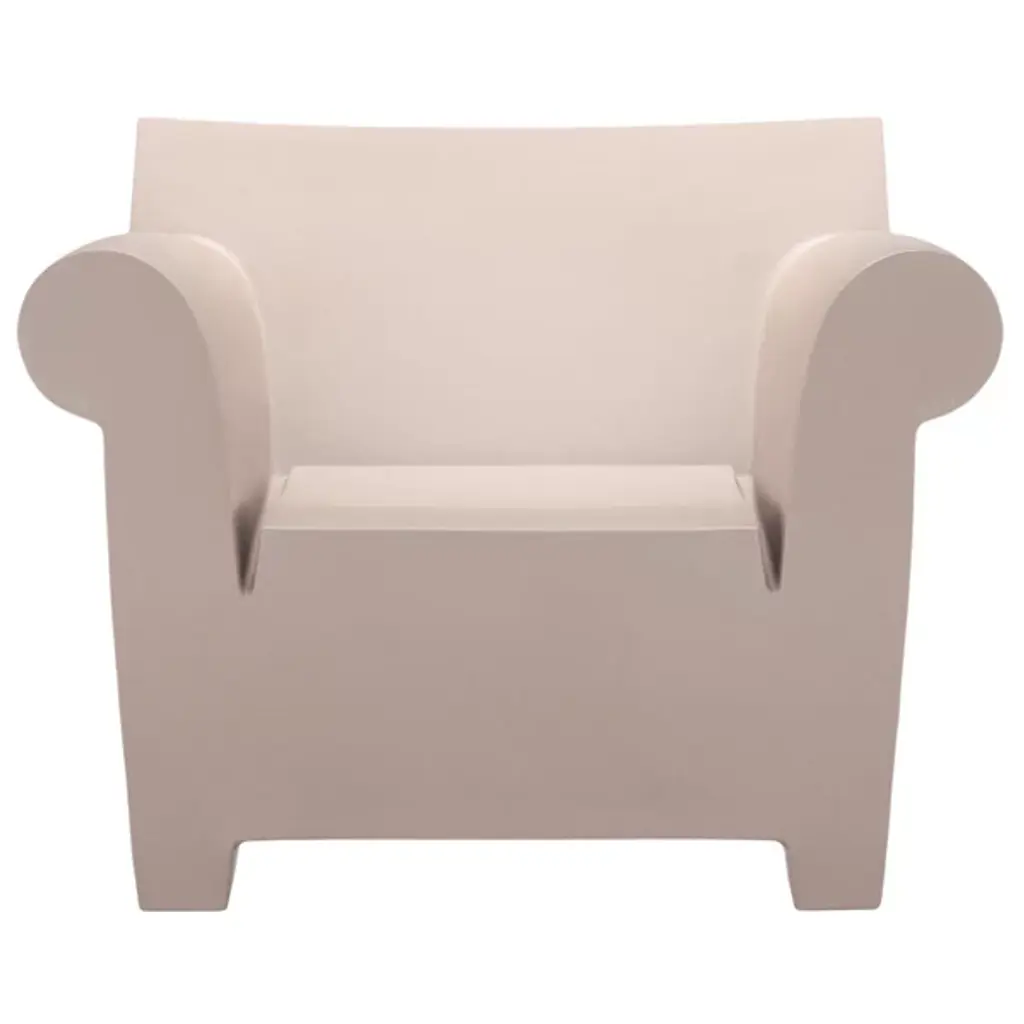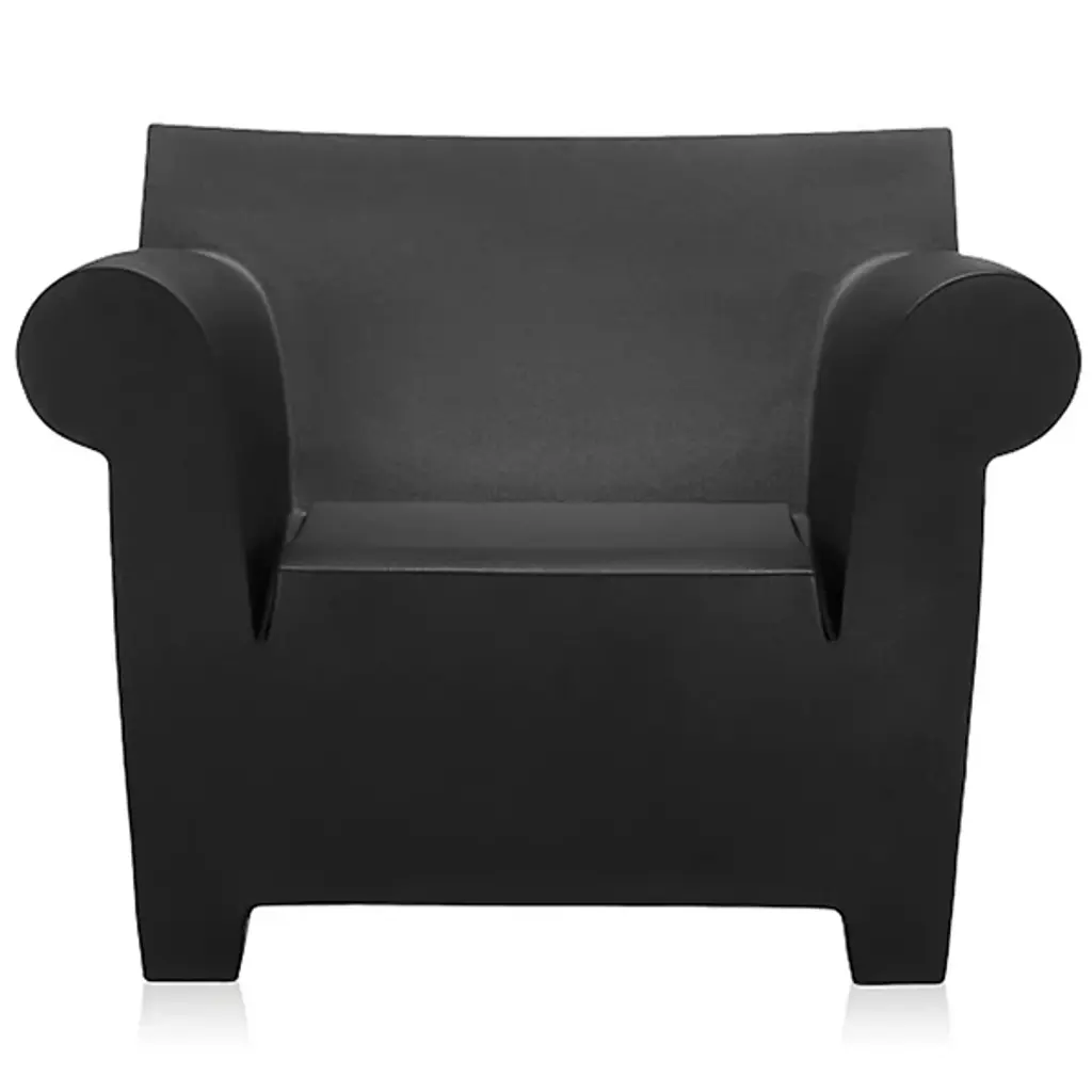 The Kartell Bubble Club Chair, a Philippe Starck design, is made of smooth and durable batch-dyed polyethylene. The chair can live perfectly outside, but is also great for furnishing internal communal spaces, waiting rooms and public places. It is characterized by the soft lines of the arms in contrast with the more essential and rational line of the back. It is the ideal example of the Kartell design concept of pairing classic style with modern materials.