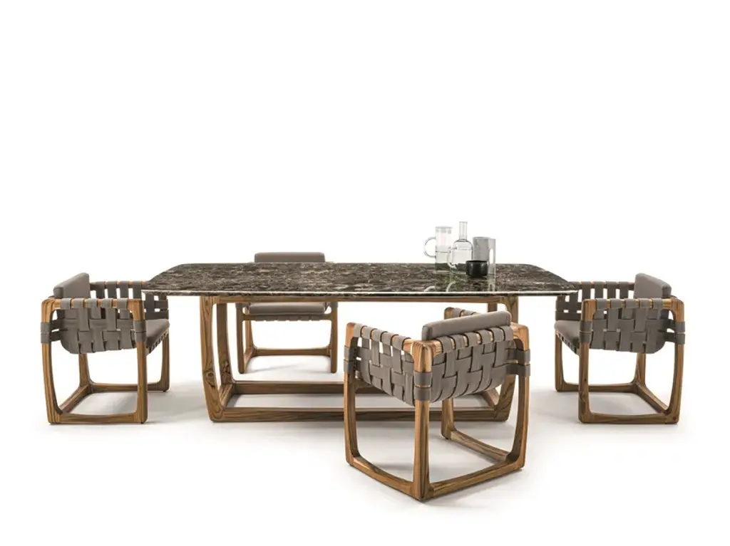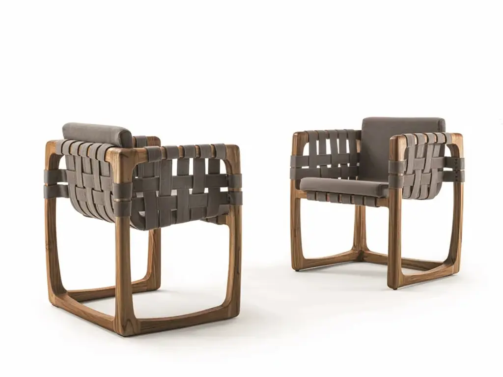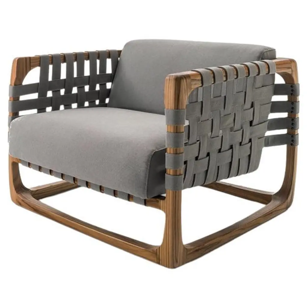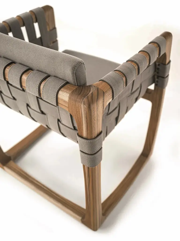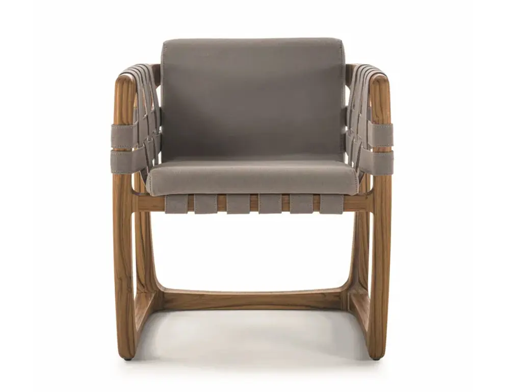 Bungalow is a padded chair with structure in solid teak wood turned, assembled and sanded completely by hand. An original detail are the strips of outdoor fabric running both under the seat, on the backrest and on the armrests.STANDARD VERSION: OUTDOOR FABRIC PATIO (D5)AVAILABLE FINISHES:A11: teakD5: olimpia leather, outdoor patio