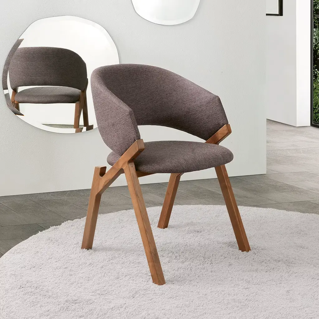 Crafted of solid ash wood, the exquisite Byron chair displays a mocha-colored fabric upholstery for its seat and round backrest. The solid ash wood legs form an intriguing structure that evokes a tree branch. This polished object is customizable in several finishes and precious fabrics, please ask the Concierge for options and pricing. Contract and commercial certifications available upon request.