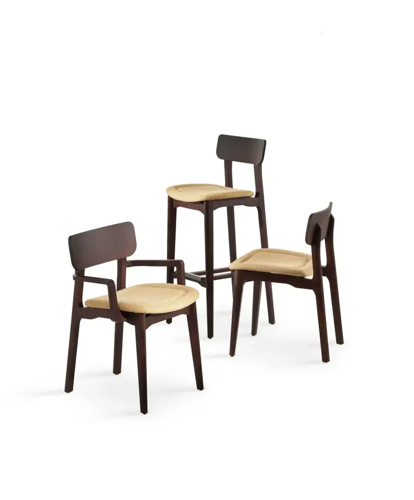 A retro style characterizes the Cacao collection which consists of a chair, stool and armchair. The mix of materials and design make this collectionideal for contract environments, as well as domestic ones. Cacao is also available with the ash frame in a choice of finishes: natural or walnut stained, or matt lacquered black, white, “signal” intense yellow or “traffic" grey.