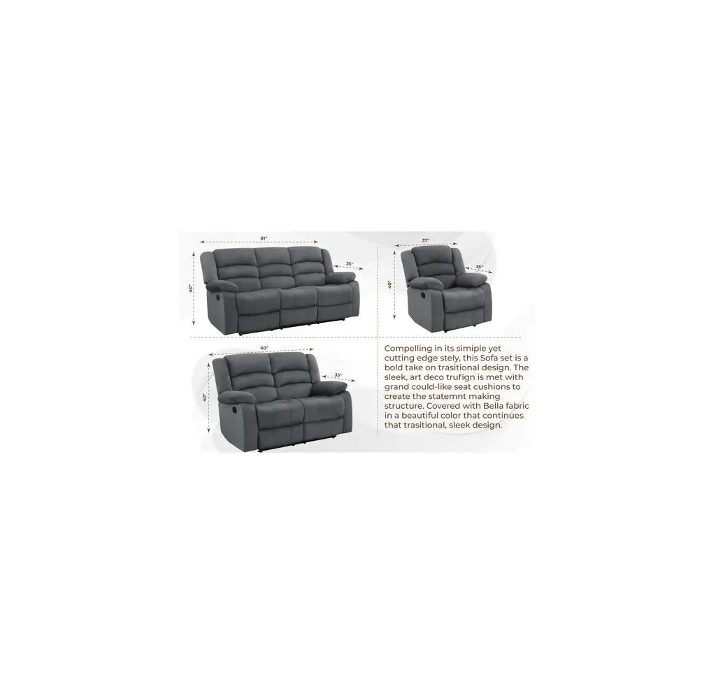 The Callan Contemporary Gray Premium Microfiber Recliner Chair - an elegantly appointed modern living area that will help you create an oasis of comfort and relaxation in your home, brought to you by Callan collection. This Microfiber set with a low-profile modern style is surely yours for many years to come. The Callan Contemporary Gray Premium Microfiber Recliner Sofa Set is one of the newest collections that is sure to look great in any style home. Callan Contemporary Gray Premium Microfiber Recliner Chair has a quiet modern appeal which will easily blend with any contemporary home setting. Stylish and at the same time warm and inviting, this Microfiber modern living room Chair with recliners would be a wonderful, long lasting addition to any home. This Callan modern living room Chair is made with use of the last technologies and of modern materials, so that it would look good and be maximally functional. You will never want to leave the comfort of your living area again with the addition of our sturdy Contemporary Gray Premium Microfiber Recliner Chair.Upholstery: MicrofiberReclines: YesFrame Construction: Wood And PlywoodSeat Construction: Pocket Coil Witd FoamFixed Seat: YesFoam Depth: Seats 2.4 / Armrest And Footrest 2.0Back Construction: Webbing with fiberSewing Type: Matching StitchAssembly Required: Minor