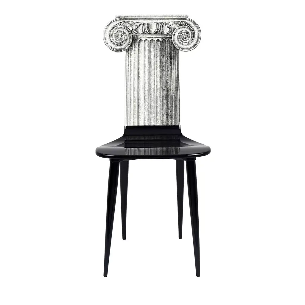 Decorated and painted by hand and fitted with solid wooden legs, the chair is an archetype of furniture and design that could not fail to be included in Fornasetti's repertoire. This trompe l'oeil decoration with gold inserts is inspired by classical art and brings an evocative and timeless sense of fun to any room. Any minor discrepancies between similar creations are the result of craftsmanship and attest to the uniqueness of each product. This piece is currently on show and immediately available at Artemest Galleria New York.