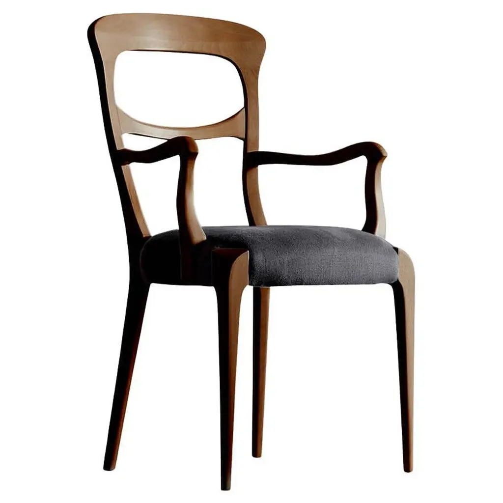 The Capotavola solid wood chair embodies the refined elegance of Italian design. Made in Italy by hand, it features solid canaletto walnut structure with acrylic finish and lining in premium leather or fabric in a range of different colors. Available with or without armrests and customizable.