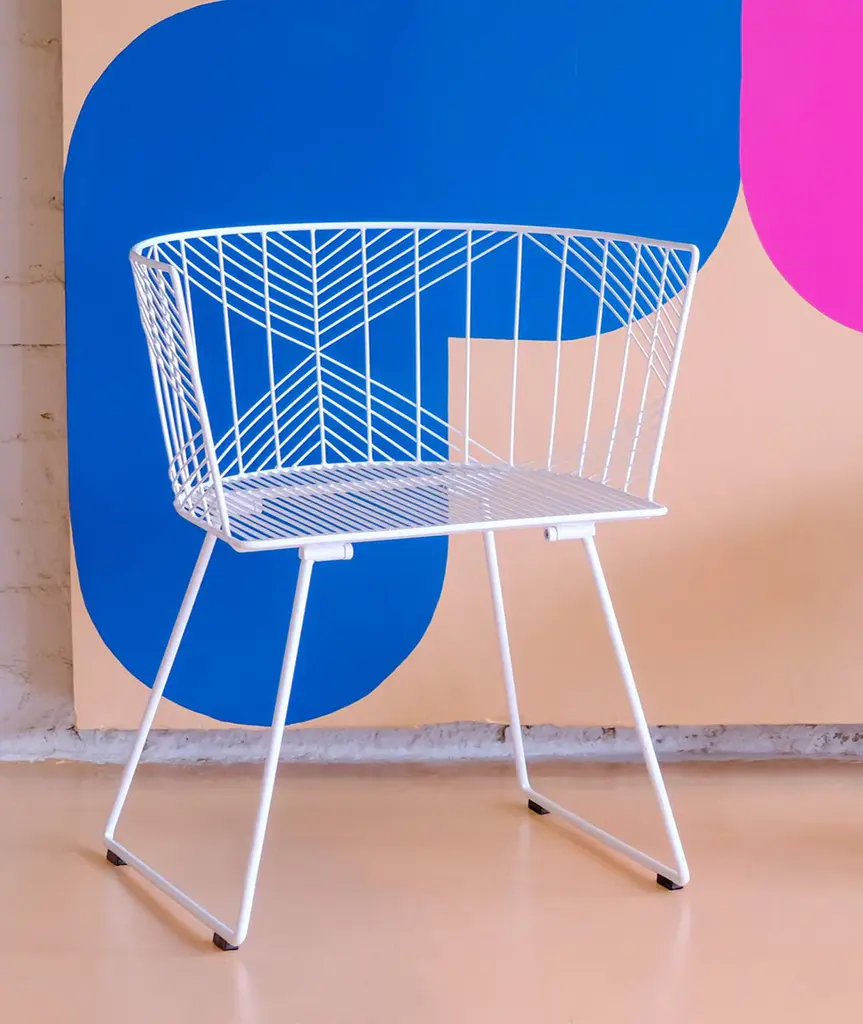 Inspired by the high seas, the metal-plated Captain Chair by LA-based Bend Goods adds a touch of glamour to your home. The curve of the seats and close spacing of the wires makes for an unexpectedly comfortable wire chair. For even more comfort, add a vegan leather seat pad, bikini, or cover up. *Please note: this item is for the Captain Chair without seat pads. Shop Cover-Up seat pad here.