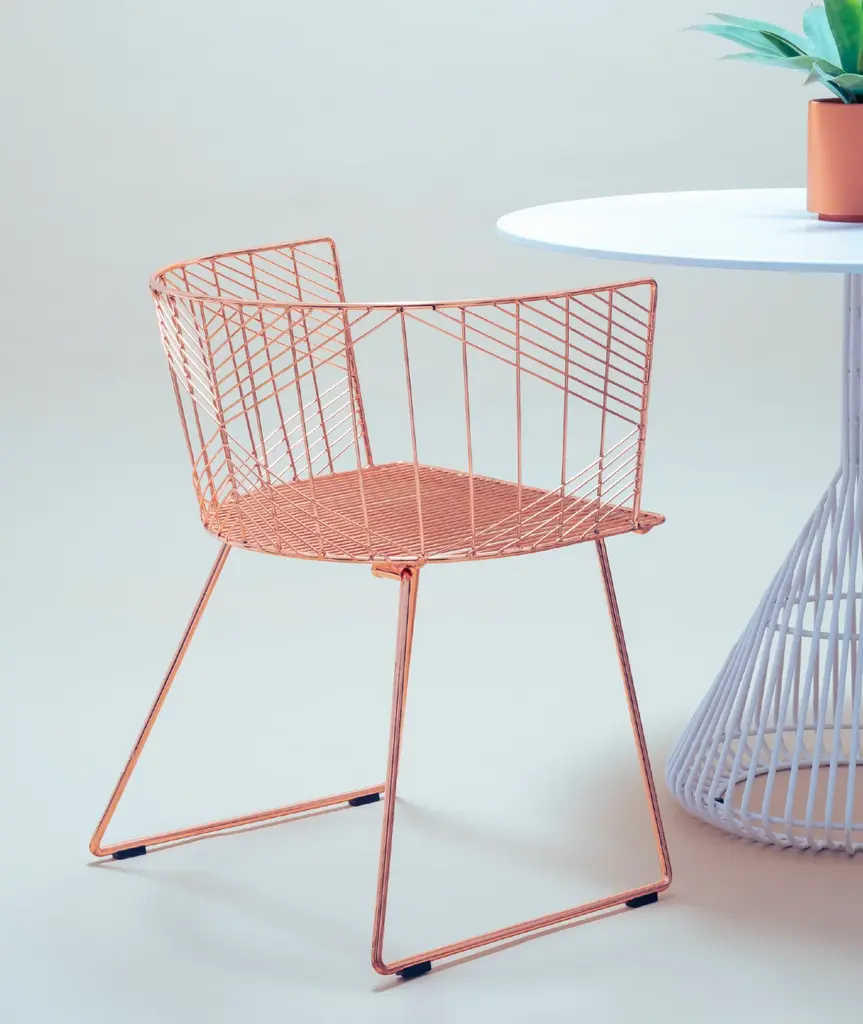 Inspired by the high seas, the metal-plated Captain Chair by LA-based Bend Goods adds a touch of glamour to your home. The curve of the seats and close spacing of the wires makes for an unexpectedly comfortable wire chair. For even more comfort, add a vegan leather seat pad, bikini, or cover up. *Please note: this item is for the Captain Chair without seat pads. Shop Cover-Up seat pad here.