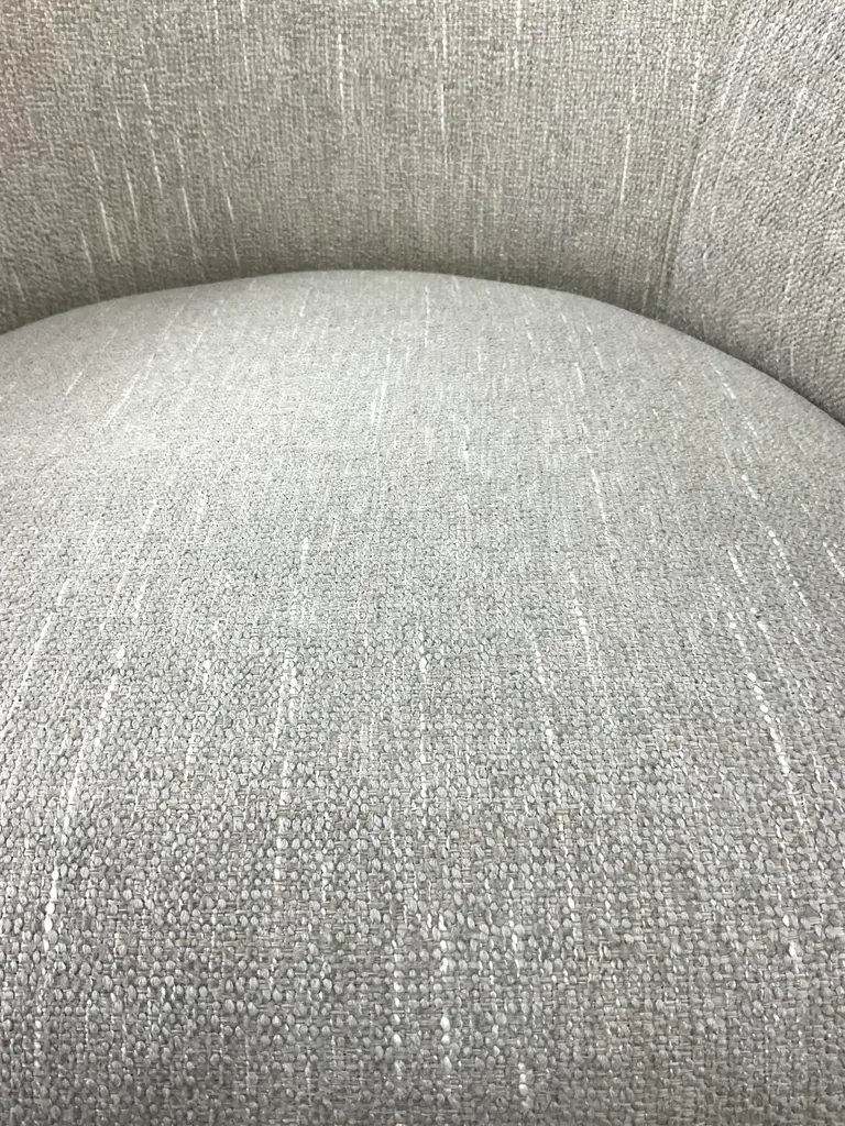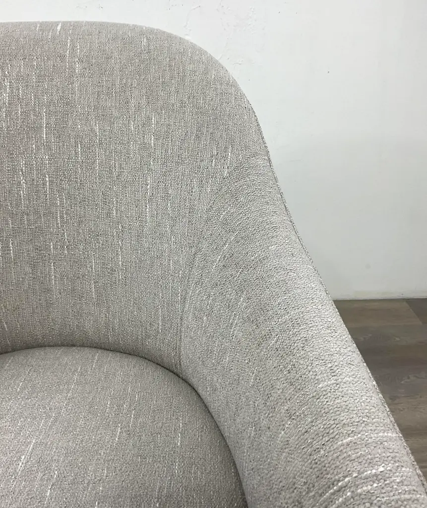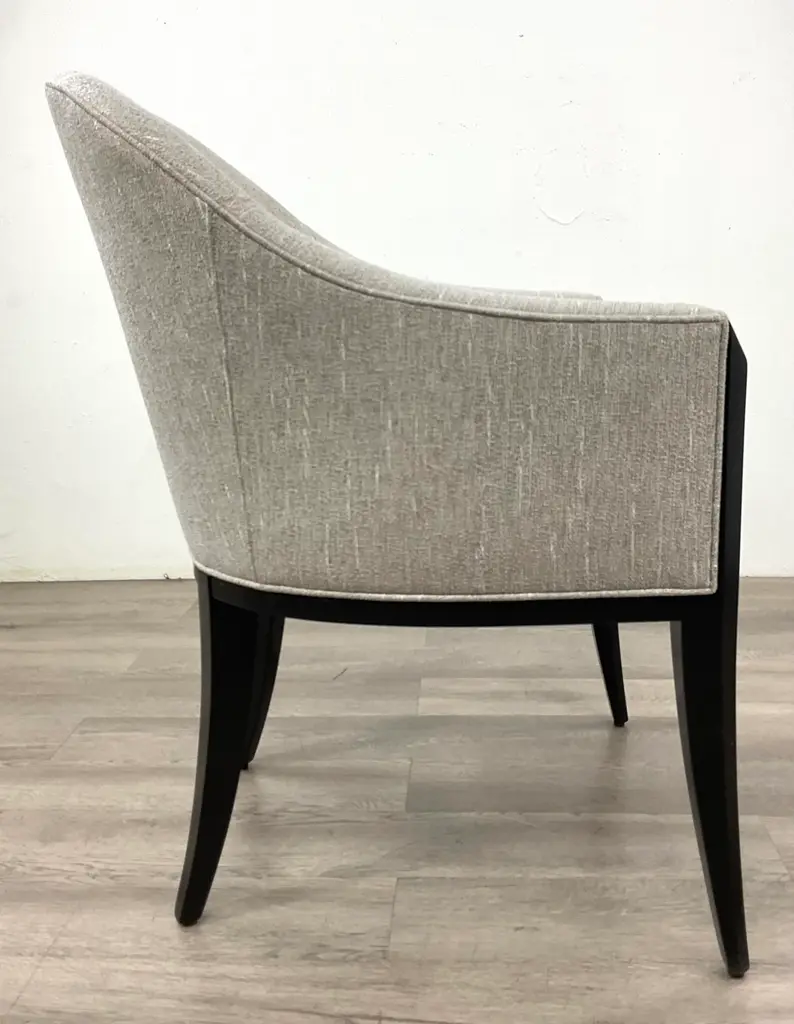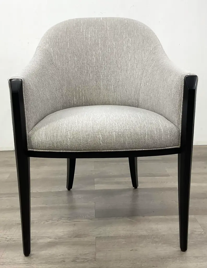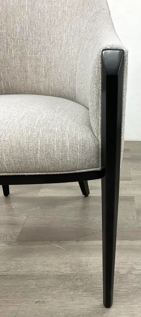 Original retail $1465, stylish Caracole Modern Gray Next Course Arm Chair, chocolate brown wood frame, gray performance fabric with a subtle beige thread, showroom floor sample