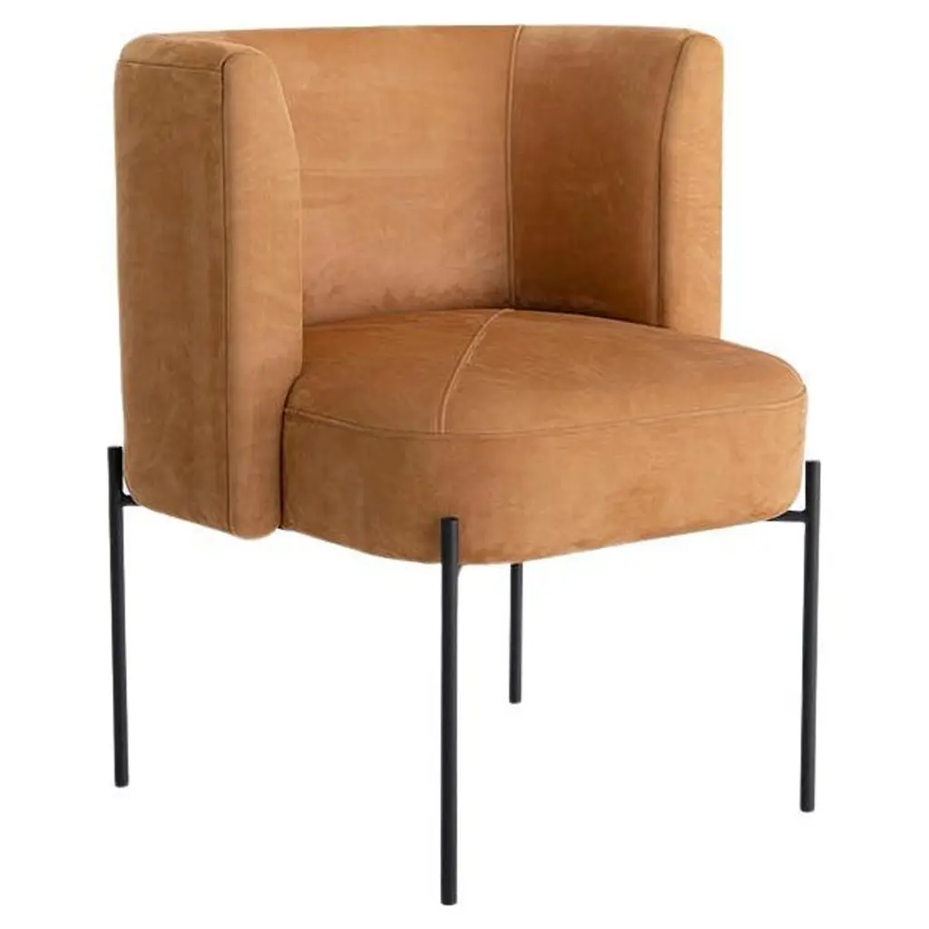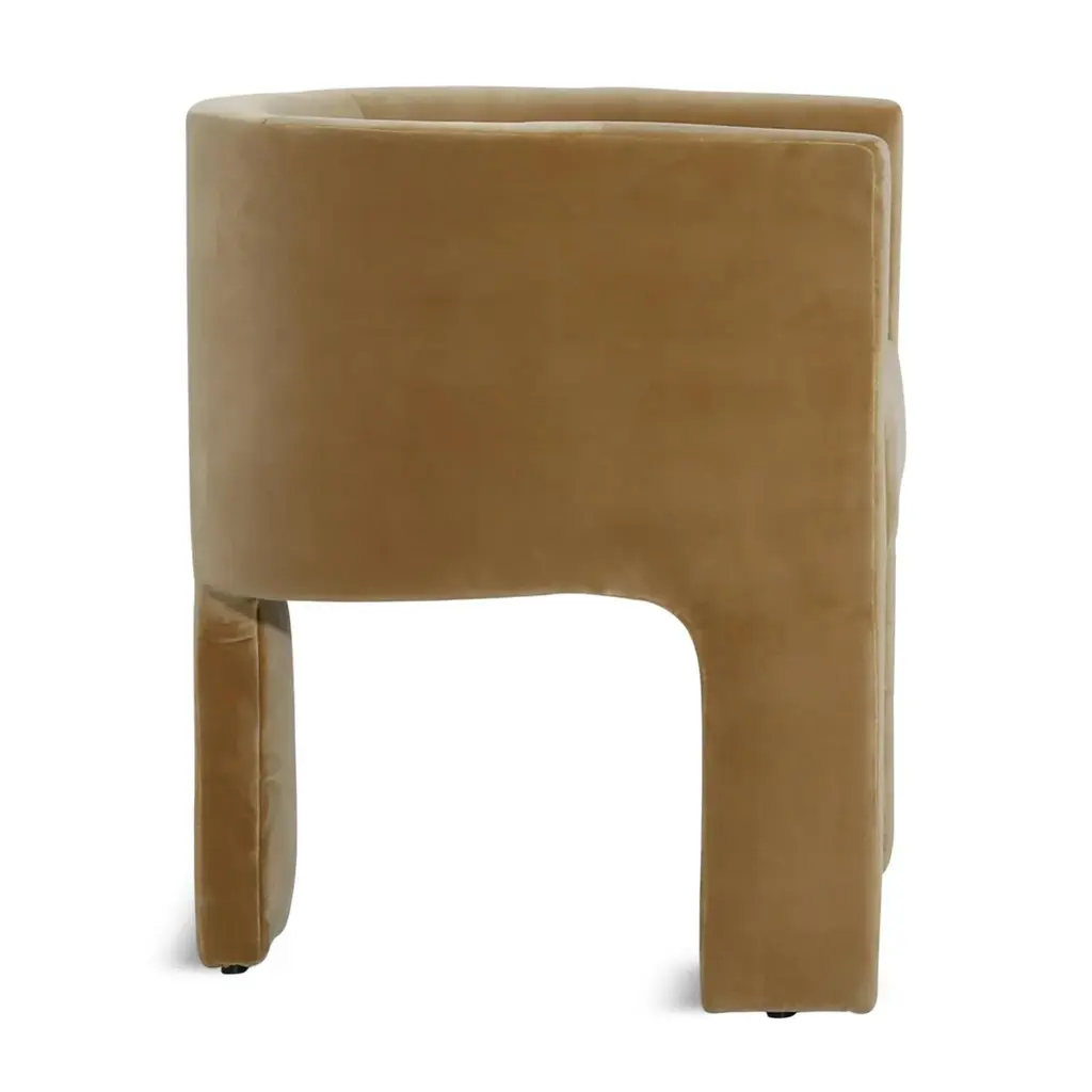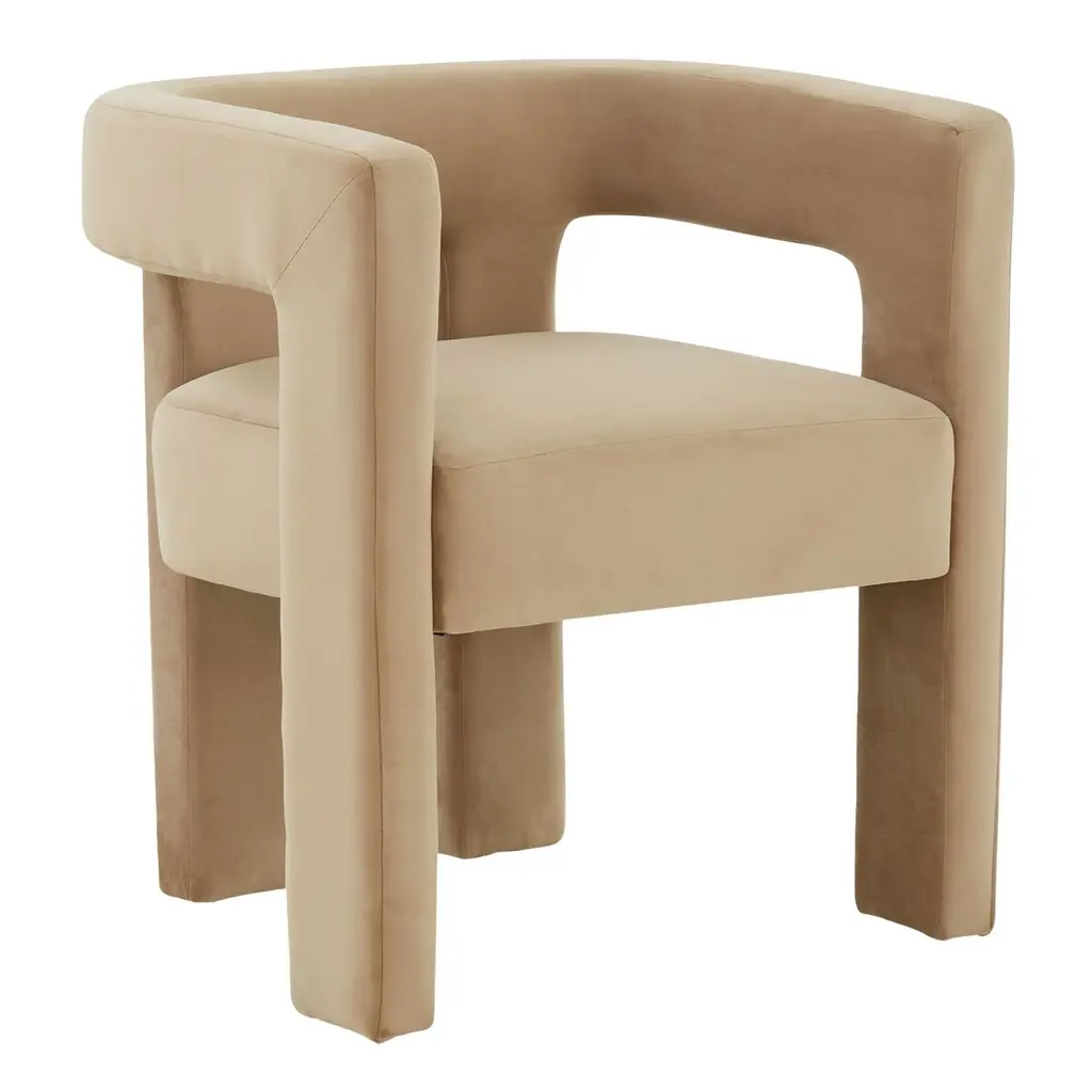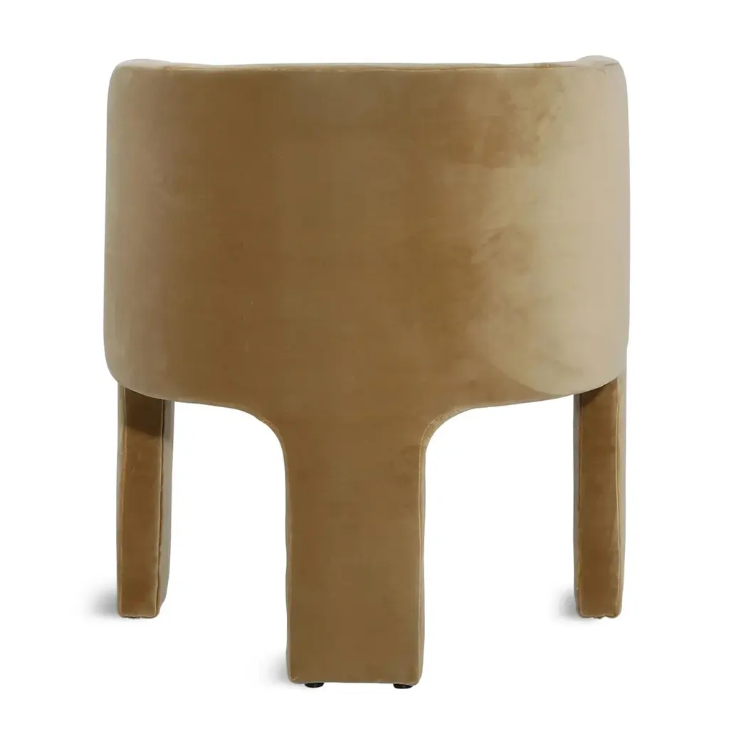 Luxe caramel color velvet upholstered arm chair. U back design with three legs. Seat height is 20" and seat depth is 18.5". Arm height is 28". Weighs approx. 21 lbs.