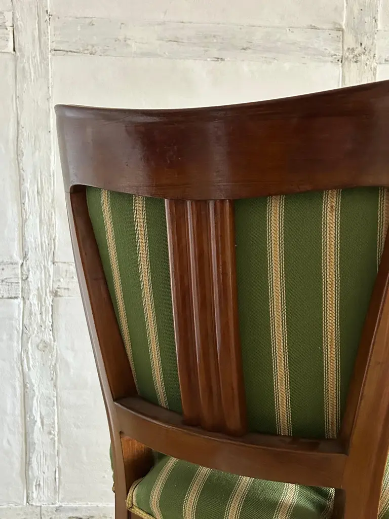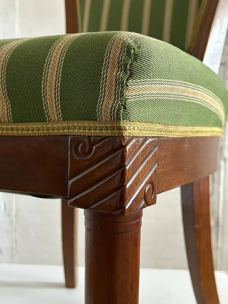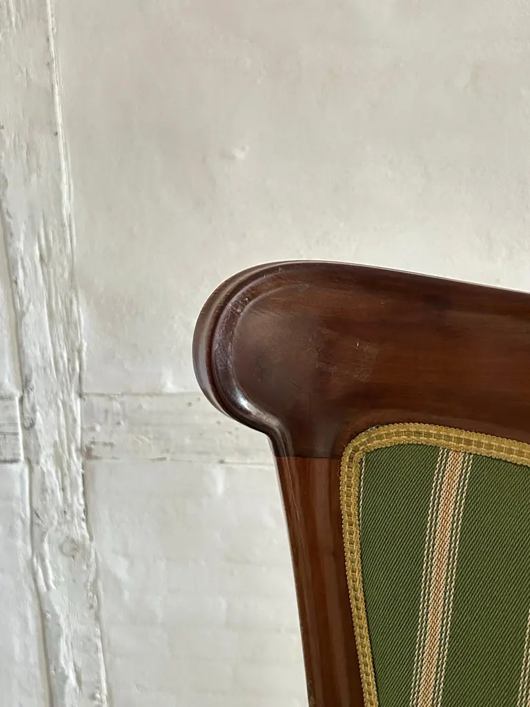 mahogany chair by Carl Harald Brummer (1864–1953), upholstered in a classic striped fabric, exemplifying the refined craftsmanship and architectural sensibility that defined Brummer’s work.Brummer was one of Denmark’s most influential early 20th-century architects and designers, known for his sophisticated approach to proportion, ornament, and materiality. His work bridged the gap between historicist traditions and the emerging modernist movement, paving the way for the next generation of designers, including figures such as Kaare Klint.This chair reflects Brummer’s ability to merge functionality with subtle decorative detailing. The clean mahogany frame is balanced and architecturally structured, while the striped upholstery adds a touch of understated elegance — a hallmark of Brummer’s aesthetic vision.Significantly, this exact model is illustrated and documented in Møbler med mening (Furniture with Meaning) by Mirjam Gelfer-Jørgensen, Arkitektens Forlag, Vol. II, p. 275. This inclusion not only confirms the attribution but also underscores the chair’s museum-level importance within the narrative of Danish design history.