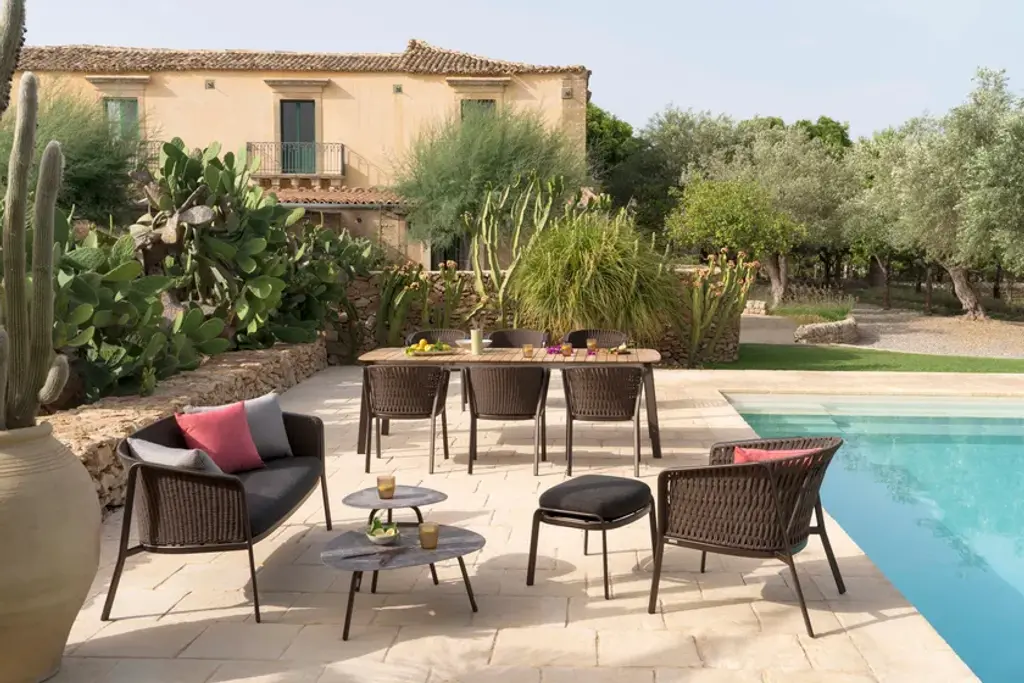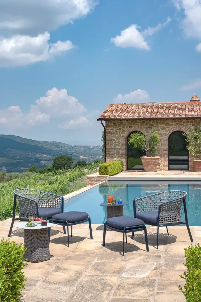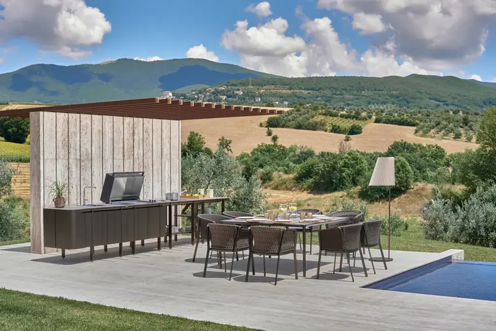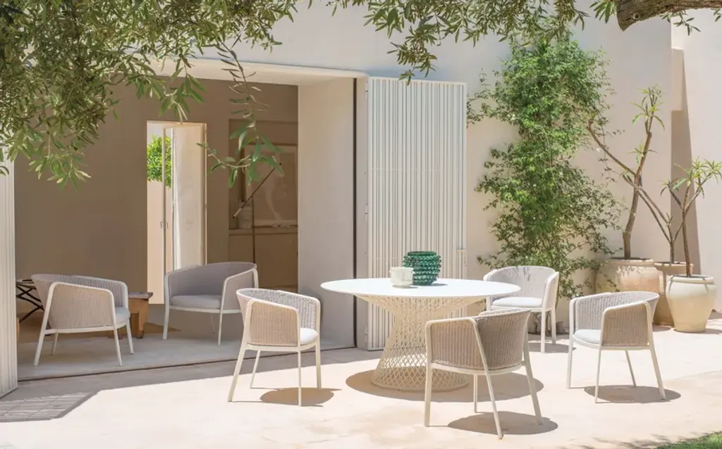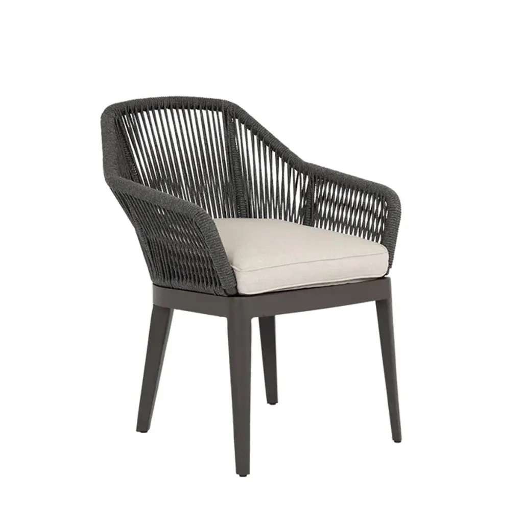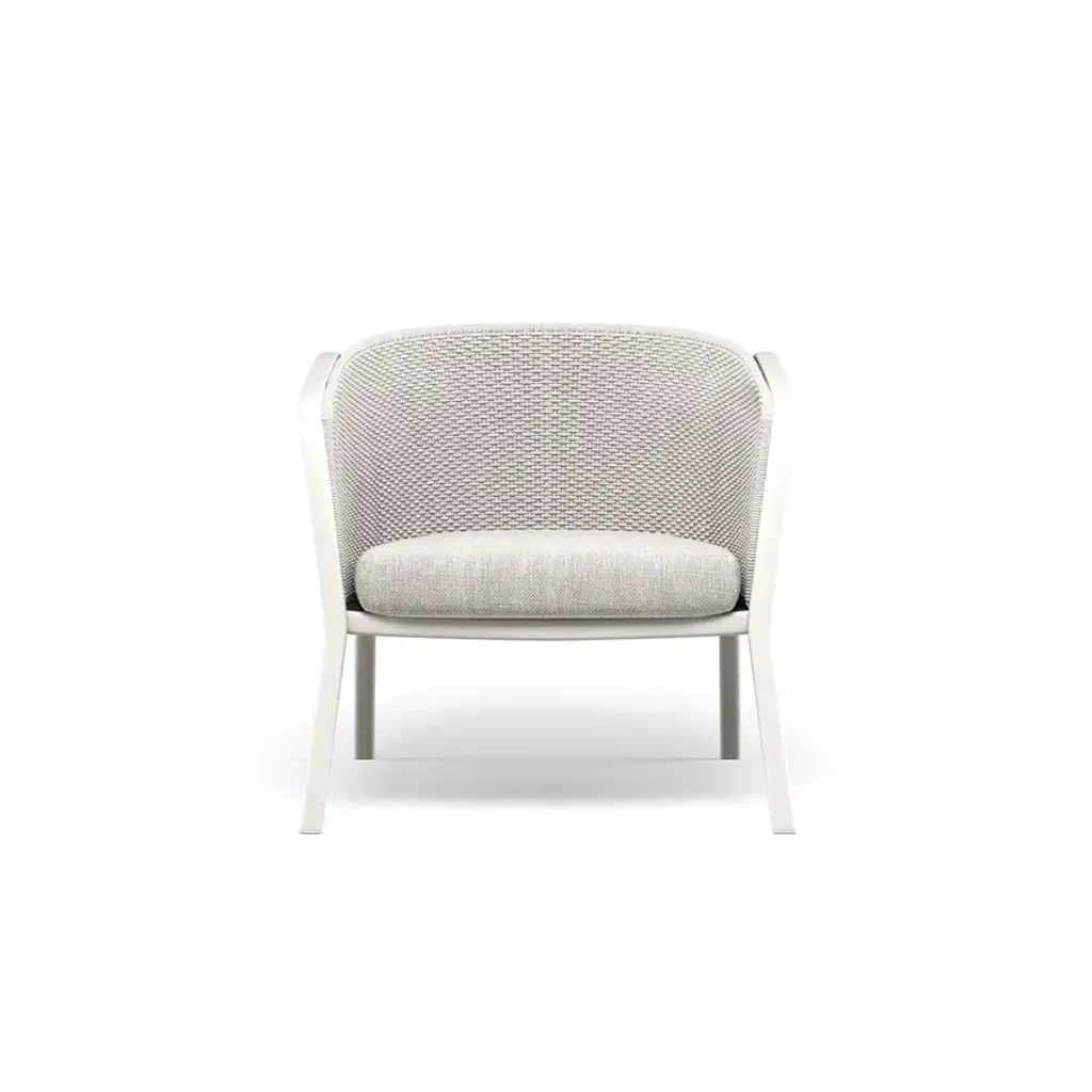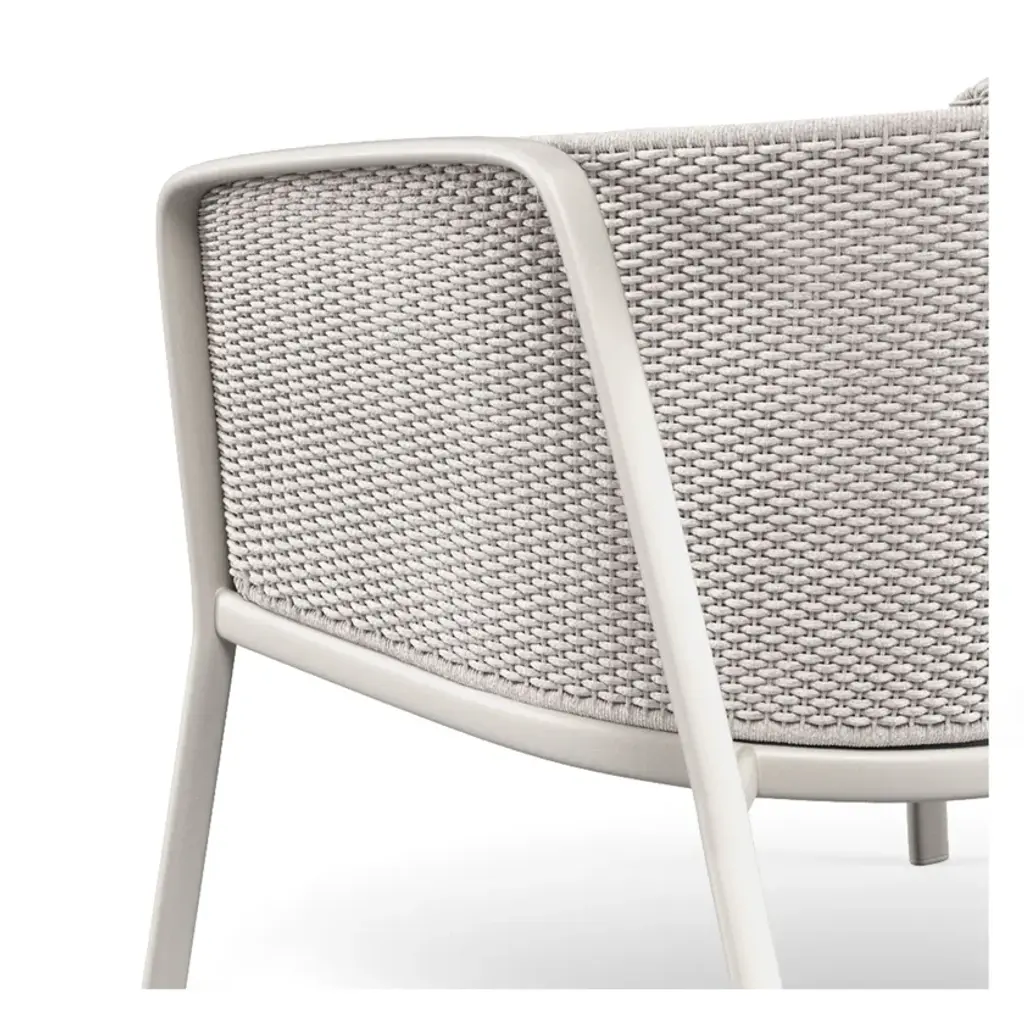 Carousel 1216 is a thick twist alu-rope lounge chair.To create a design product with an handcrafted appeal according to industrial mandatories: this is Industrial Design. This approach pushed, for the cover of the chair, towards the use of many materials that like in a carousel dress an elaborate metal easel, a distinctive sign of EMU technical and manufacturing skills. A variety of ranges of colors and combinations are possible on a same frame. The technical fabric version (suitable for outdoor use) is the result of in-depth research, a special pressure molding process that creates shapes offering maximum comfort to the seat and backrest as well as high quality mechanical characteristics. All these features make the unique character of this chair. About the intervowen version the designer choose to recall natural and warm tones that support the use in several environments.The structure is made by aluminium because this material guarantees more competitive outdoor performances. The armrest made with a special aluminium profile embraces and recalls a intrinsic geometry of handmade wood and through a three-dimensional movement it defines an elegant iconic sign. Carousel collection is made up of: four versions of dining armchair and three versions of lounge armchair. The easel frame is made of aluminum tubular. The seat, made by a sheet of aluminium alloy which is drawn to have an even shape, and then is following fixed to the aluminium frame through a structural welding, performed with TIG technology that gives particular resistance as well as a better standard in terms of aesthetics. The structure of the steel backrest supports the decorative patterns proposed in the various materials. All selected materials guarantee long-lasting resistance and color stability. About the dining armchair, a version in technical fabric such as Fiber Fill fiber for seat cushion and self supporting back is work in progress. This fabric guarantees water repellency. Because the above mentioned materials, the product is strongly suitable for all uses in marine environments and in extreme weather conditions. The Carousel collection is Made in Italy. High positioning restaurants, restaurants of high-level hotels, lounge and reception areas of high-level hotels, rooftoops and panoramic terraces, various types of private residential spaces, coworking and home working spaces are some of the possibile end-uses for Carousel collection.