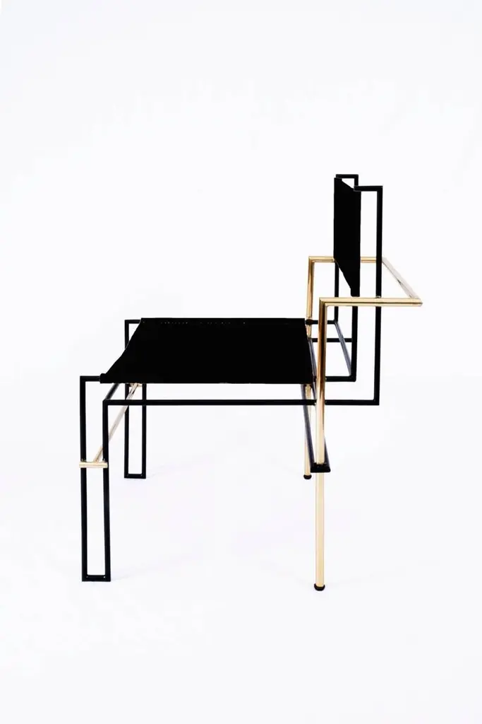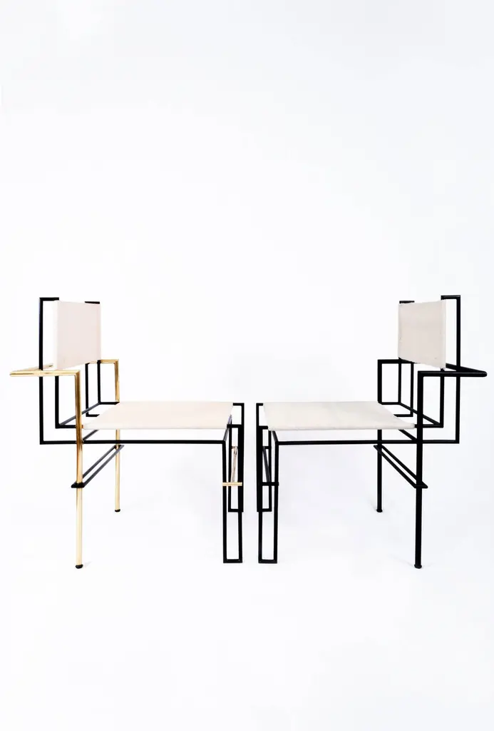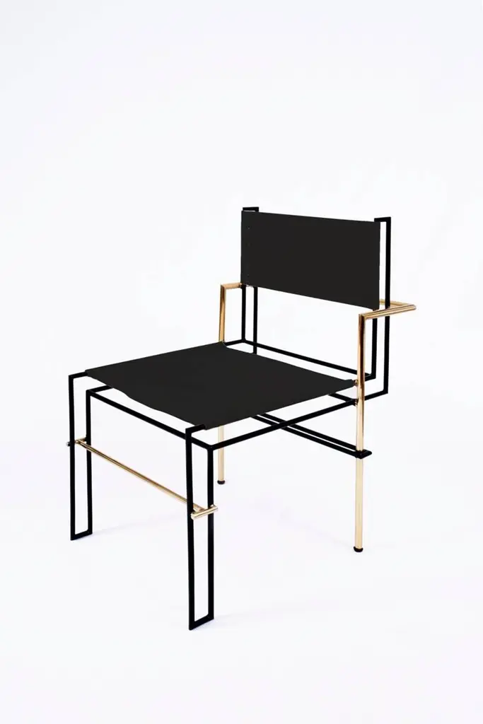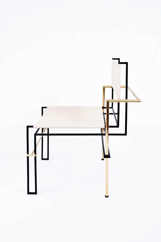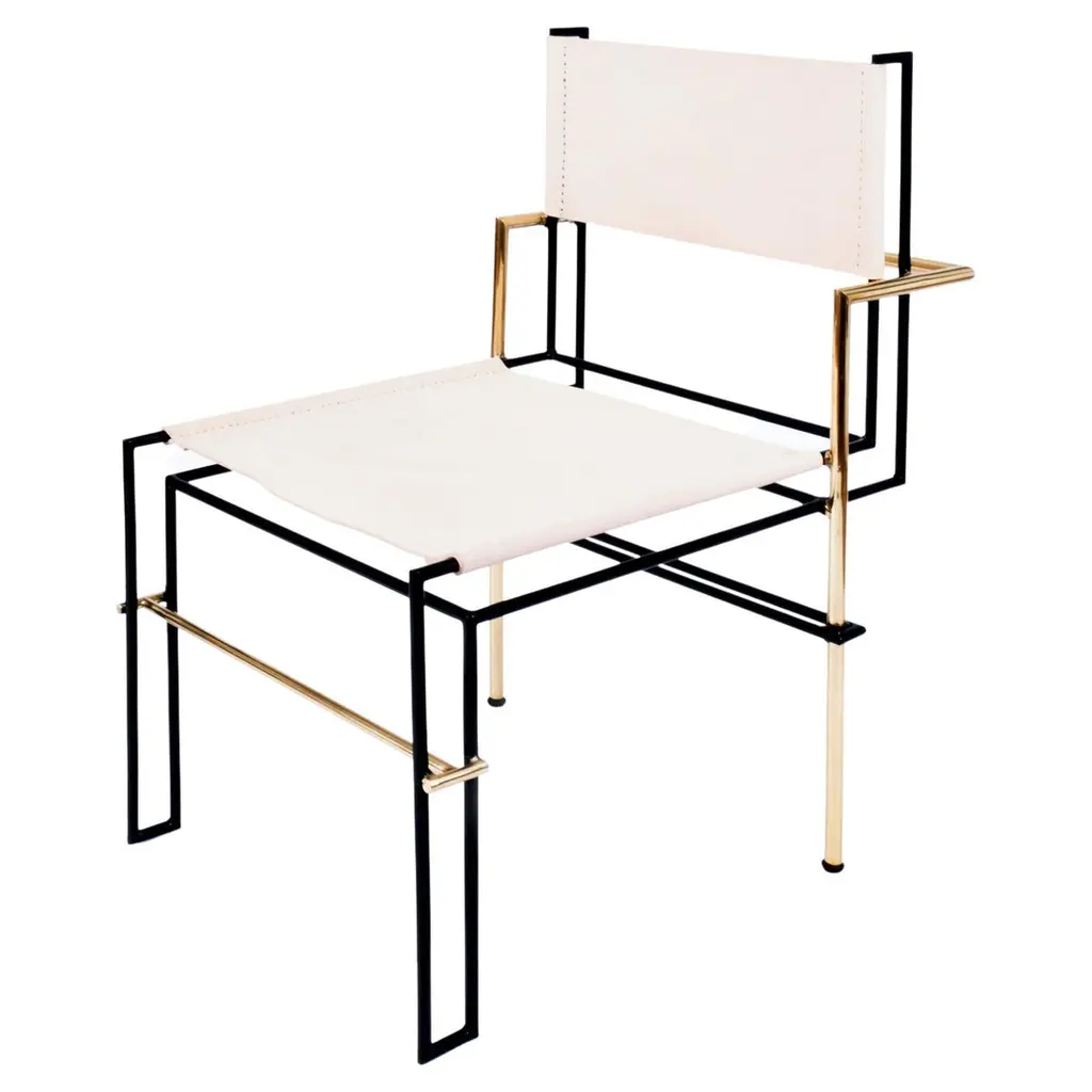 the Casbah chair, Inspired by Laszlo Moholy-Nagy's photograms, is all linear balance, gravity and angular movement. A complex tubular brass structure frames a natural vachetta leather seat and back sling that will age gracefully with time and use. Artisanal waist-loom Oaxacan wool woven in Teotitlan del Valle.