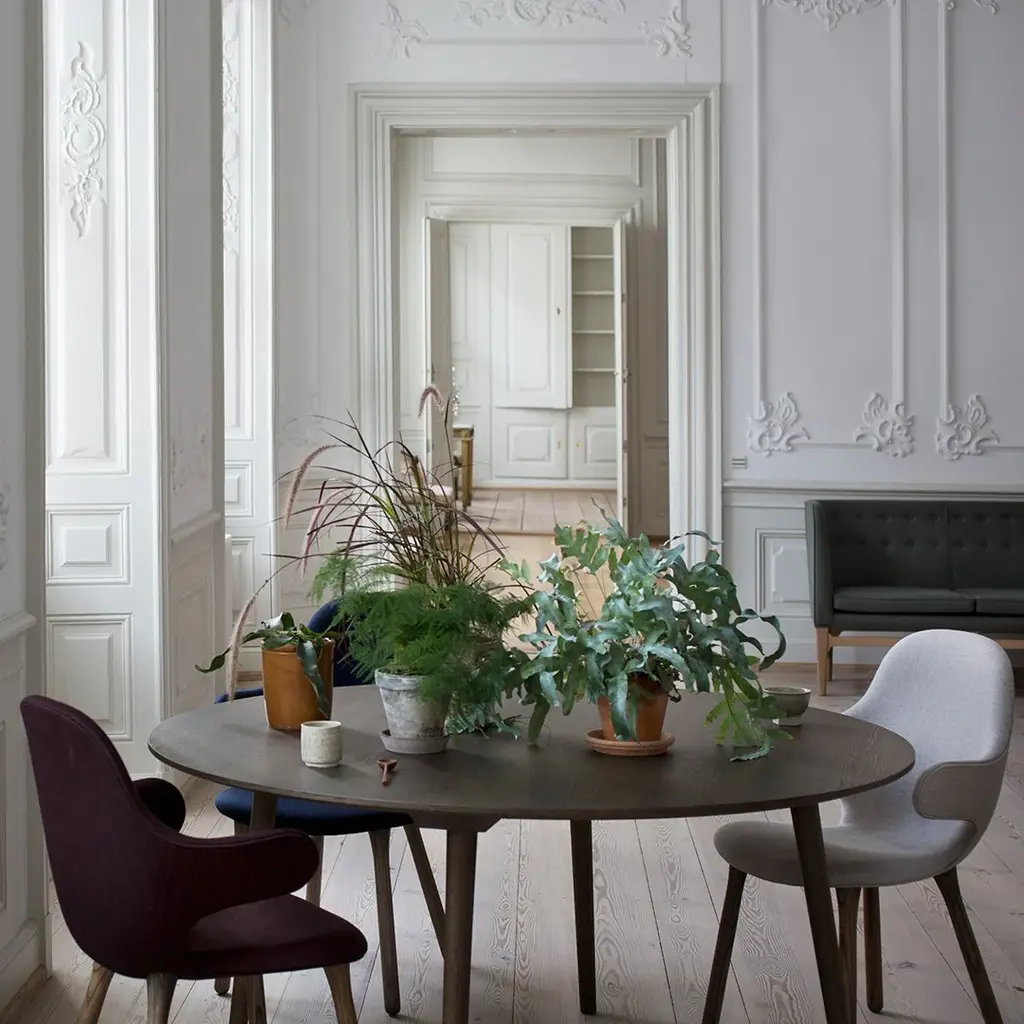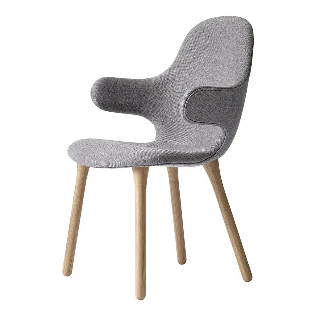 Catch, Jaime Hayon's first contribution to &Tradition's collection, is a chair that welcomes you with open arms. Its armrests extend from the shell like literal limbs, ready to embrace you as you sit down. In addition to being a witty personification, it is also an eye-catching piece of design. Serpentine lines give it a playful lightness that is counterbalanced by a sturdy, well-balanced base and legs that ensure maximum comfort. The shell consists of molded polyurethane foam with a metal frame and glass fiber reinforcements. Catch is also available with black lacquered legs and in several other premium fabrics, leathers, and colors. Please call us to review all options.