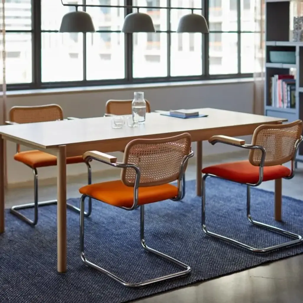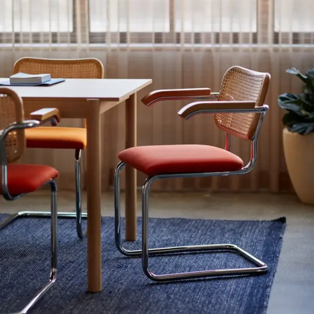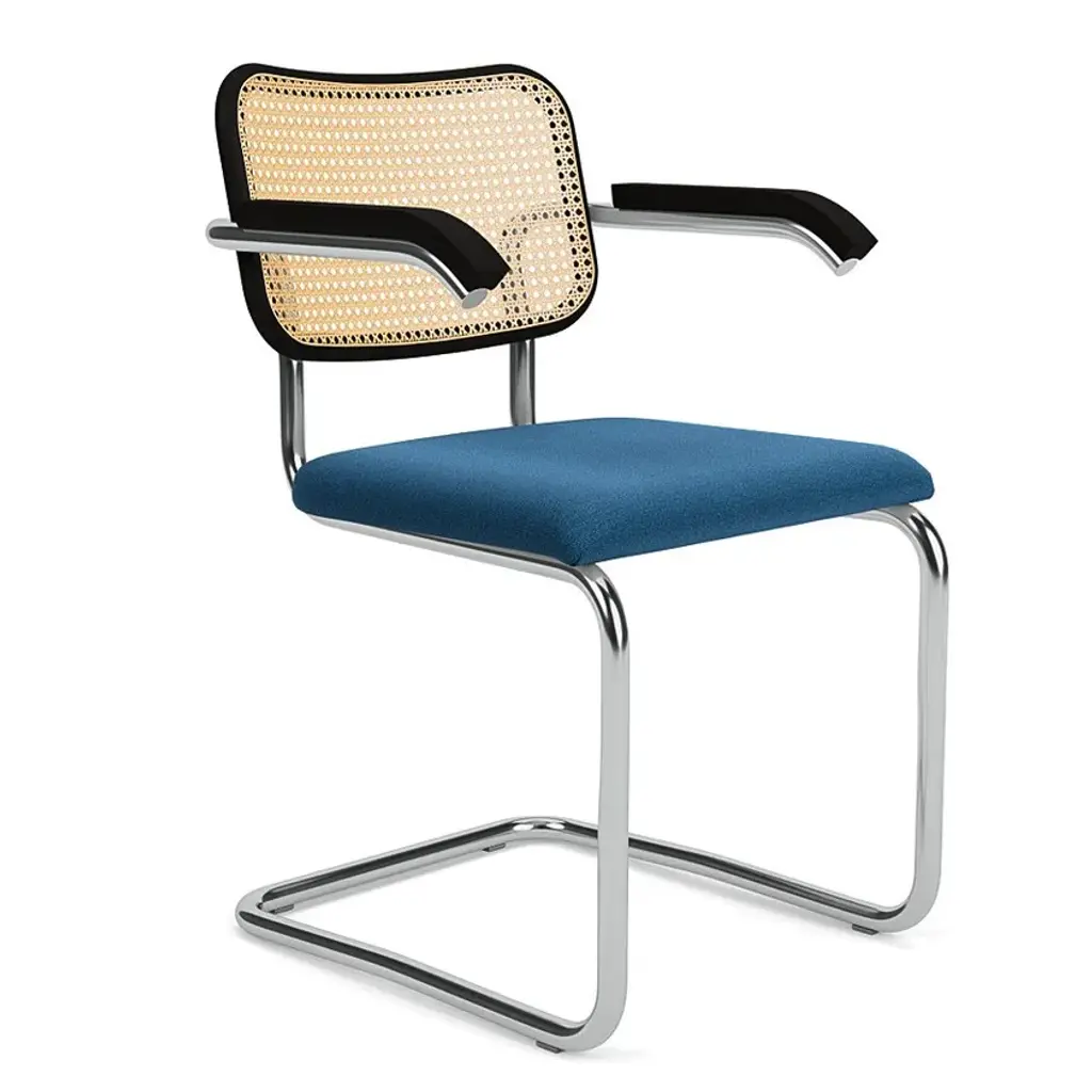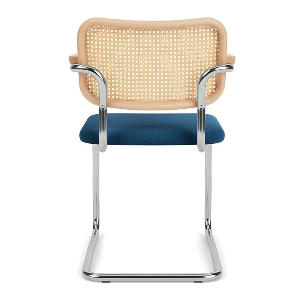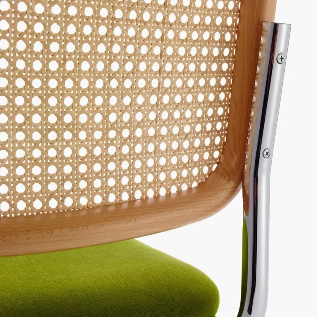 Cesca's seat is urethane foam over molded plywood. Back is beech with cane insets. Frame is 1” diameter chrome-plated round steel tube with a polished finish. Plastic glides snap into base to protect floors. The KnollStudio logo and signature of Marcel Breuer are stamped into the base of the chair.Marcel Breuer married traditional craftsmanship with industrial methods and materials to help make tubular steel furniture an international sensation and a modern institution. The cantilevered form exploits the possibilities unique to the material and gives the chair added flexibility and comfort.