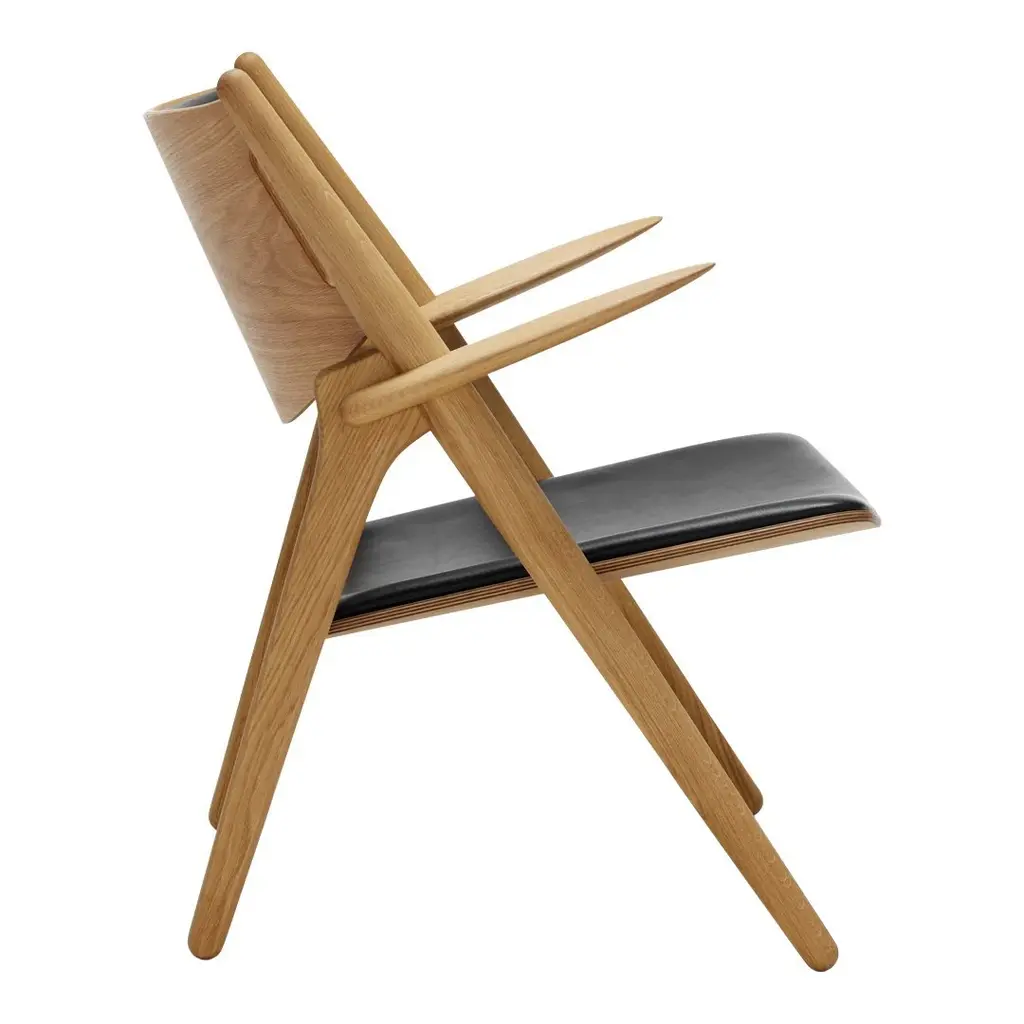 The Wegner Sawhorse Chair is an exceptionally comfortable armchair and a typical Wegner piece: functional and sculptural with an exceptional finish. The armchair is closely related to Wegner's famous dining chair, the Sawbuck Chair. Seat and back are fabric or leather. The chair was designed by Hans J. Wegner in 1952. The CH28 features an oak frame, seat and back with a choice of either oak or walnut armrests.